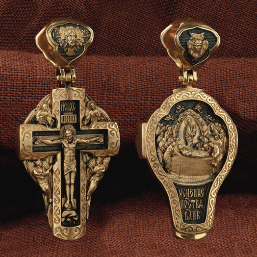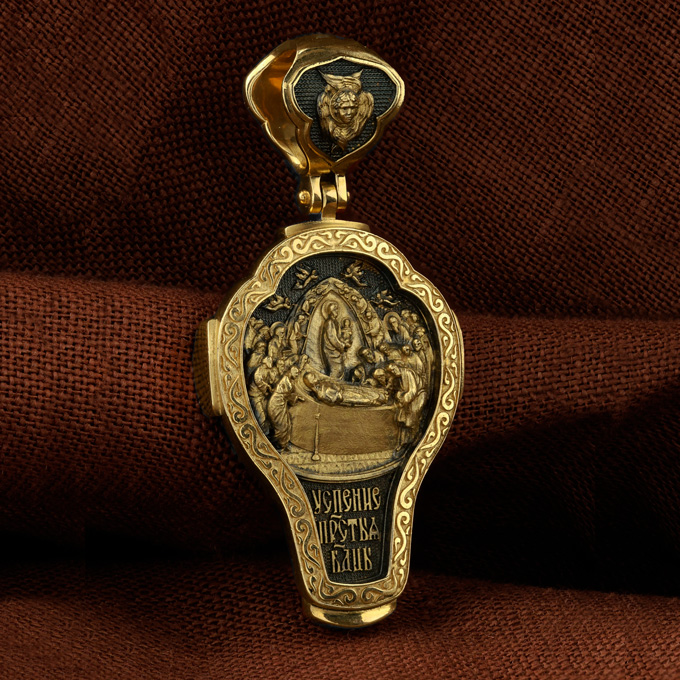 На оборотной стороне креста изображена икона Успения Пресвятой Богородицы. Все годы после Распятия, Воскресения и Вознесения Иисуса Христа Пресвятая Дева провела большей частью в Иерусалиме, проповедуя Господа наравне с апостолами. Но вот настало время Ее земной кончины. Архангел Гавриил возвестил Ей, что через три дня душа Ее оставит тело. Но Богородица очень обрадовалась. Ведь Ее ожидала встреча с Тем, Кого Она любила гораздо больше, чем жизнь. Три дня спустя в доме апостола Иоанна, где жила Мария, собрались и другие апостолы: Господь чудесным образом устроил так, что все они вернулись к этому дню из дальних странствий, где проповедовали Христа. Не было только Фомы. Апостолы стали свидетелями блаженной кончины Святой Девы. Сам Христос, окруженный множеством ангелов, явился, чтобы принять душу Своей Пречистой Матери и возвести Ее в рай. На кулонном кольце изображен шестикрылый Ангел — Серафим.