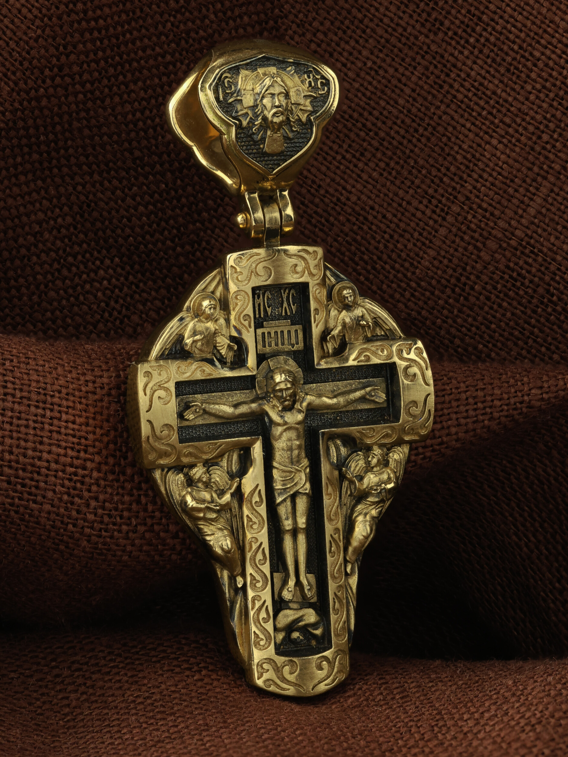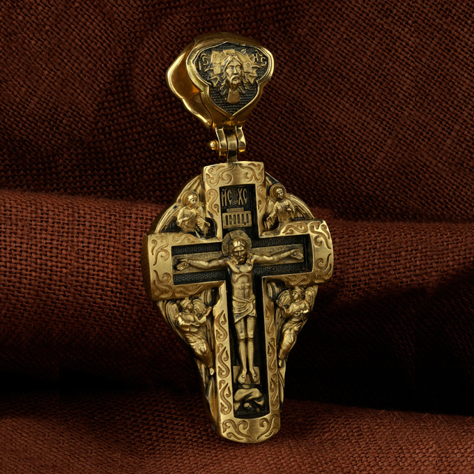 На лицевой стороне креста изображено Распятие Господа и Спасителя нашего Иисуса Христа, отдавшего Себя на смерть, для искупления грехов мира. Крест является символом жертвенной любви Всеблагого Бога к падшим людям, всепобеждающим духовным оружием христиан, основанием и средоточием церковной жизни. Господь сказал: кто хочет идти за Мною, отвергнись себя, и возьми крест свой, и следуй за Мною. (Мк. 8: 34). Над Распятием помещена надпись «IC» «ХC», означает Иисус Христос. На верхней табличке, выше головы Иисуса, расположена надпись, составленная Понтием Пилатом — «IНЦI». Она означает «Иисус Назорей, Царь Иудейский». Возвышение, на котором стоит Крест, символизирует гору Голгофу, на которой произошло Распятие. Под подножием Креста изображена покоящаяся голова (череп) Адама. У Креста изображены Ангелы. На кулонном кольце изображен Нерукотворный образ Господа и Спасителя нашего Иисуса Христа, чудесно отпечатавшийся на плате, которым Христос вытер свой лик. Ниже надпись — «IC» «ХC».