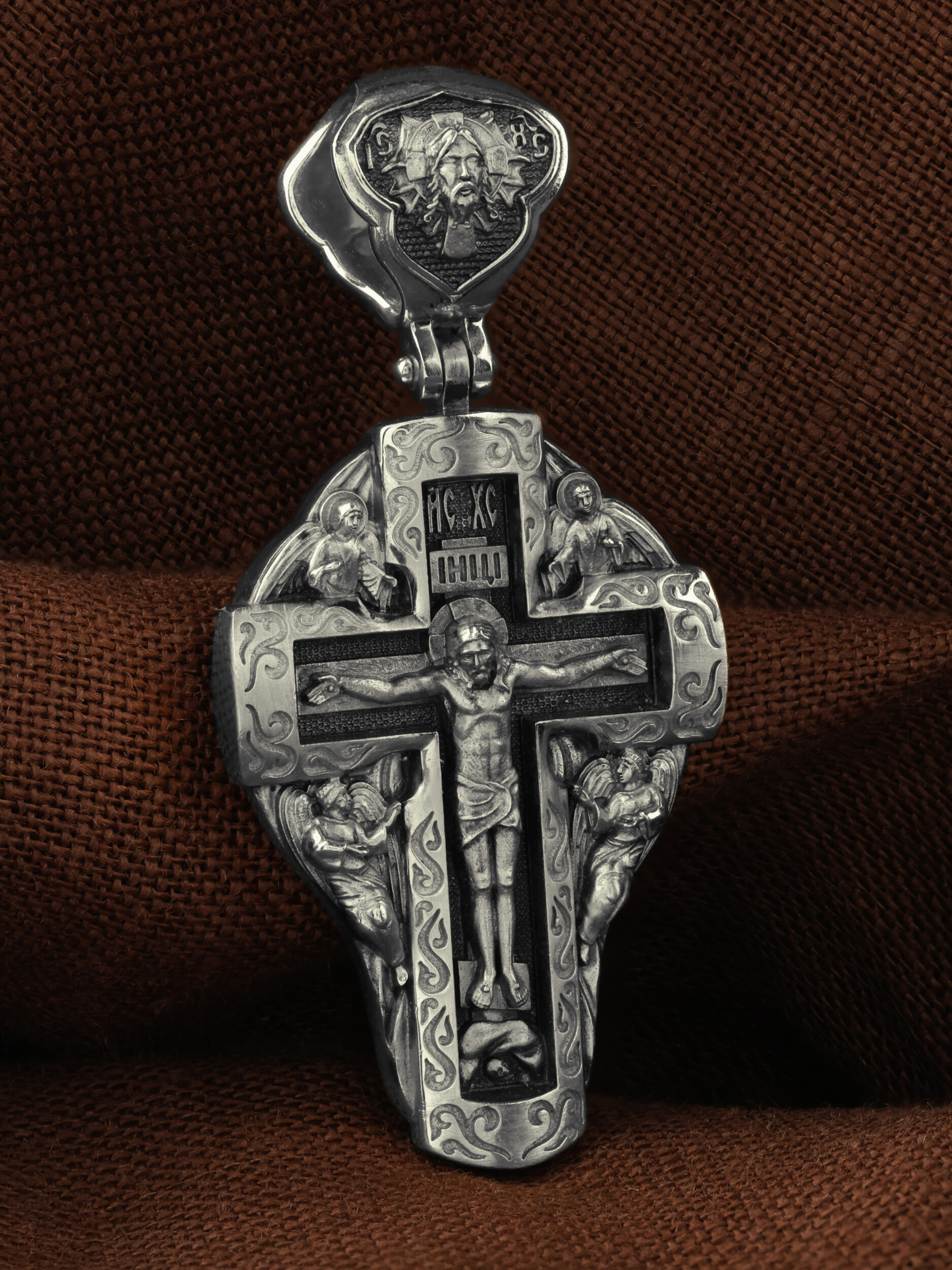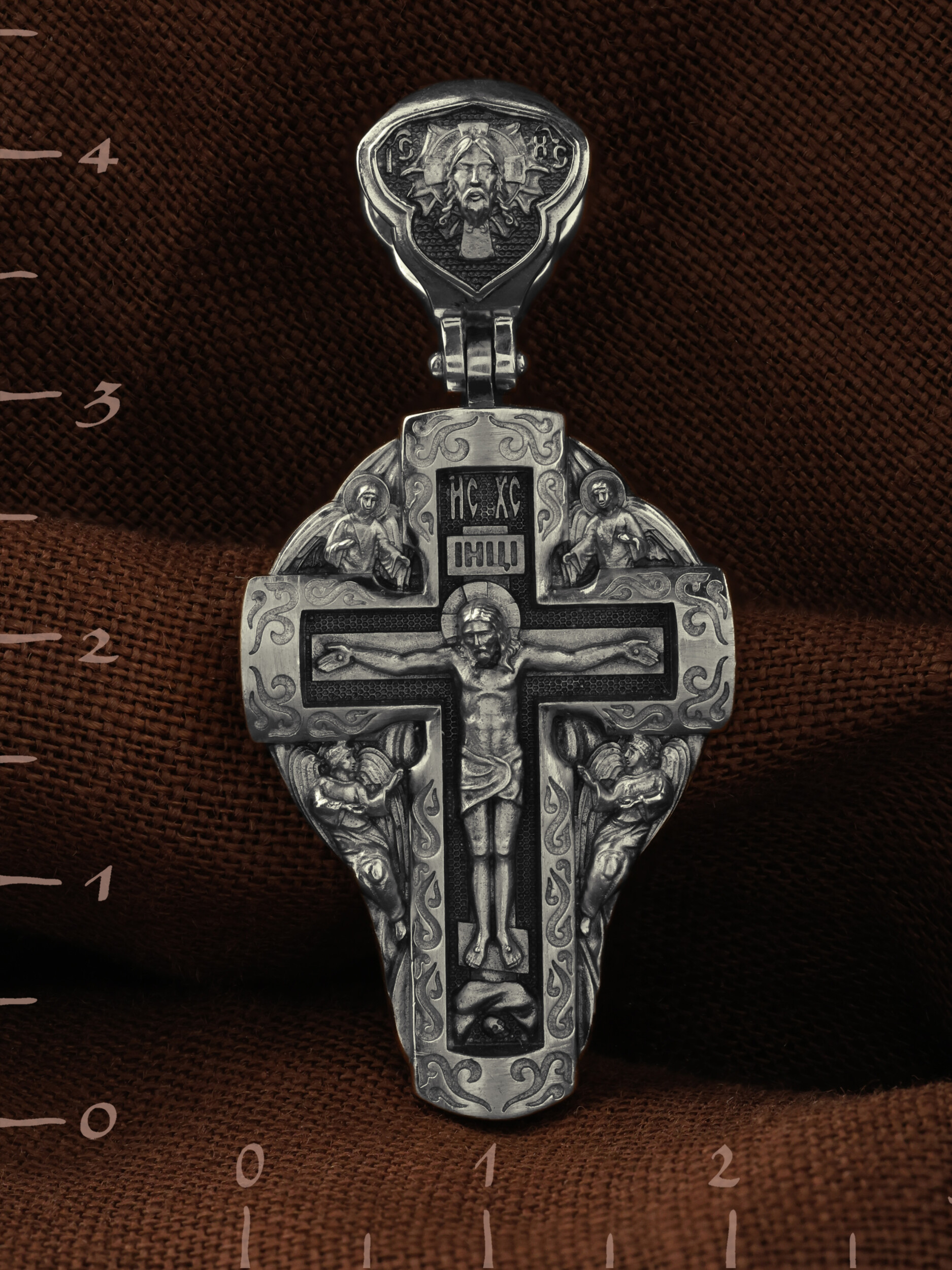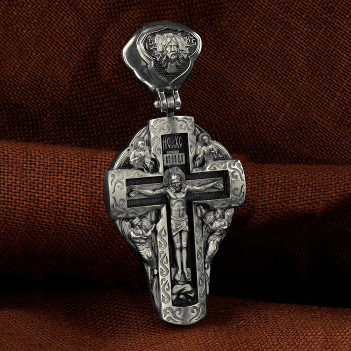 На лицевой стороне креста изображено Распятие Господа и Спасителя нашего Иисуса Христа, отдавшего Себя на смерть, для искупления грехов мира. Крест является символом жертвенной любви Всеблагого Бога к падшим людям, всепобеждающим духовным оружием христиан, основанием и средоточием церковной жизни. Господь сказал: кто хочет идти за Мною, отвергнись себя, и возьми крест свой, и следуй за Мною. (Мк. 8: 34). Над Распятием помещена надпись «IC» «ХC», означает Иисус Христос. На верхней табличке, выше головы Иисуса, расположена надпись, составленная Понтием Пилатом — «IНЦI». Она означает «Иисус Назорей, Царь Иудейский». Возвышение, на котором стоит Крест, символизирует гору Голгофу, на которой произошло Распятие. Под подножием Креста изображена покоящаяся голова (череп) Адама. У Креста изображены Ангелы. На кулонном кольце изображен Нерукотворный образ Господа и Спасителя нашего Иисуса Христа, чудесно отпечатавшийся на плате, которым Христос вытер свой лик. Ниже надпись — «IC» «ХC».