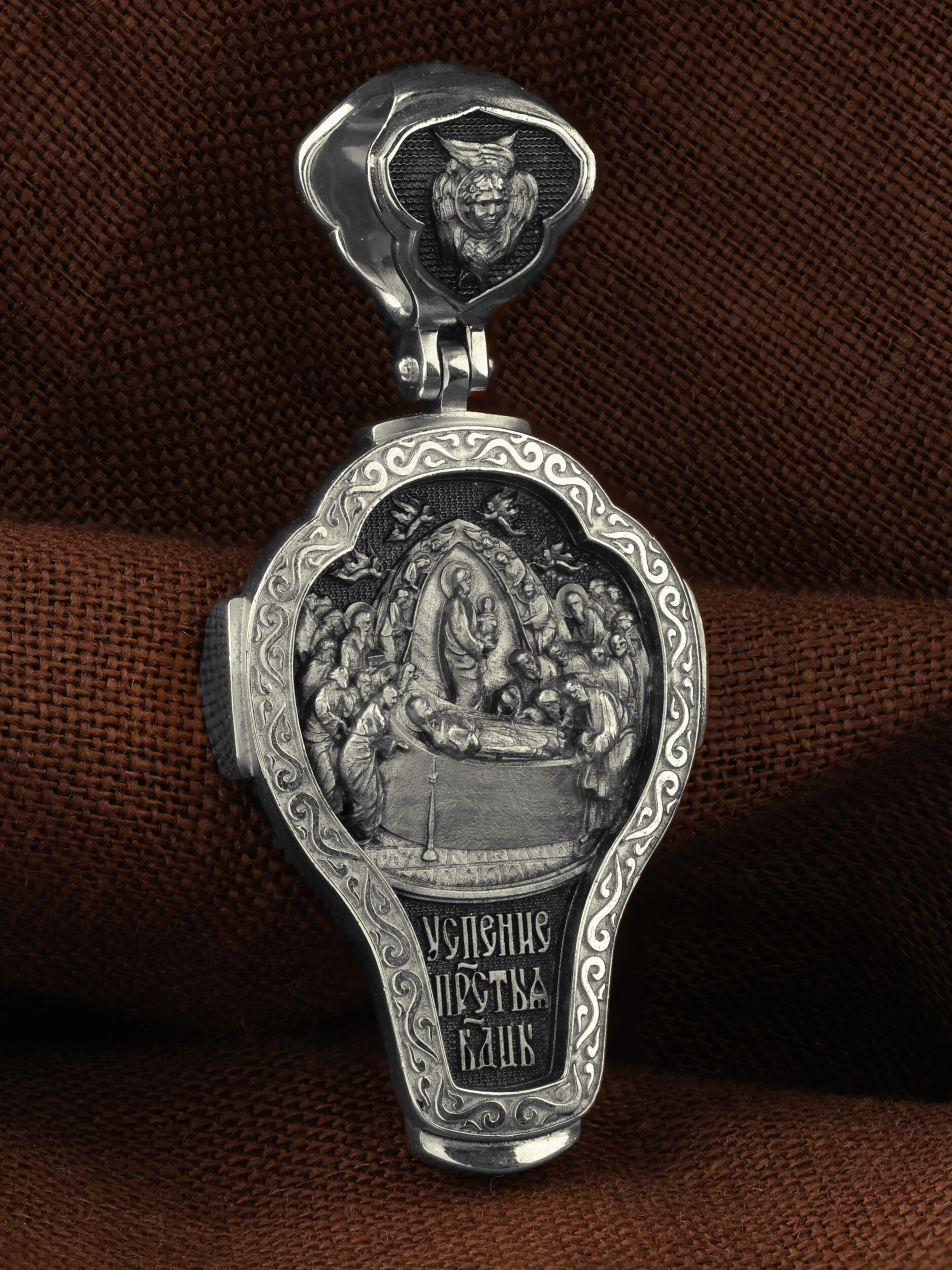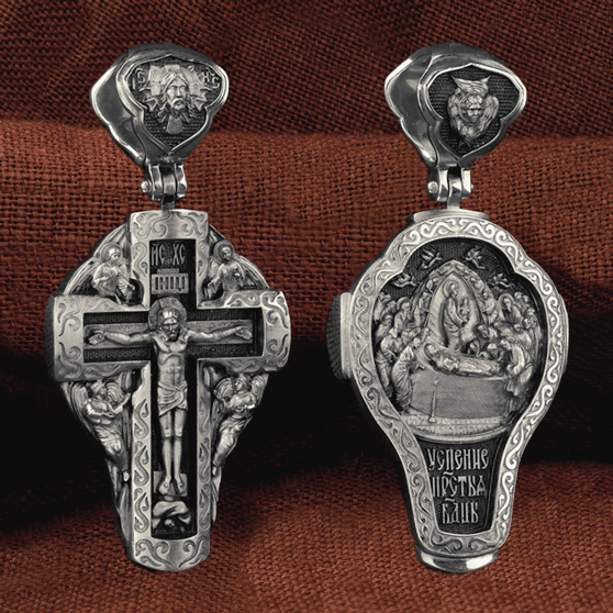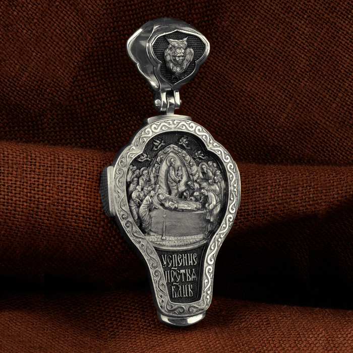 На оборотной стороне креста изображена икона Успения Пресвятой Богородицы. Все годы после Распятия, Воскресения и Вознесения Иисуса Христа Пресвятая Дева провела большей частью в Иерусалиме, проповедуя Господа наравне с апостолами. Но вот настало время Ее земной кончины. Архангел Гавриил возвестил Ей, что через три дня душа Ее оставит тело. Но Богородица очень обрадовалась. Ведь Ее ожидала встреча с Тем, Кого Она любила гораздо больше, чем жизнь. Три дня спустя в доме апостола Иоанна, где жила Мария, собрались и другие апостолы: Господь чудесным образом устроил так, что все они вернулись к этому дню из дальних странствий, где проповедовали Христа. Не было только Фомы. Апостолы стали свидетелями блаженной кончины Святой Девы. Сам Христос, окруженный множеством ангелов, явился, чтобы принять душу Своей Пречистой Матери и возвести Ее в рай. На кулонном кольце изображен шестикрылый Ангел — Серафим.
