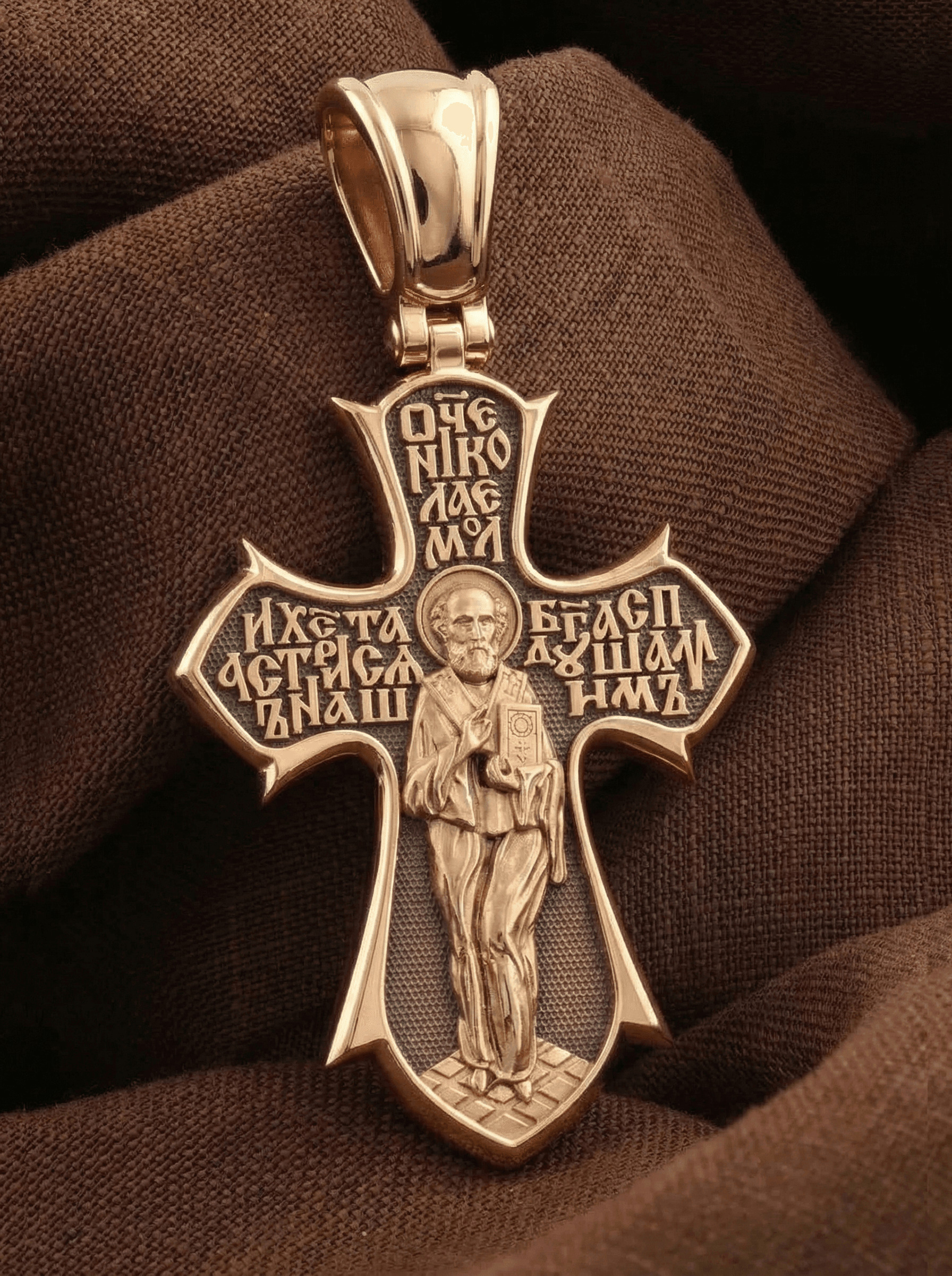 Оборотную сторону креста возглавляет икона святителя Николая Чудотворца. Живший в III веке епископ Ликийского города Миры — самый почитаемый святой не только в России, но и во всем мире. Николай Чудотворец, помощник в делах, защитник путешествующих, покровитель учащихся, утешитель обиженных и нуждающихся, целитель самых страшных и тяжелых недугов, предстатель и молитвенник за людей перед Богом. Вокруг него написана молитва: «Отче Николае, моли Христа Бога спастися душам нашим».