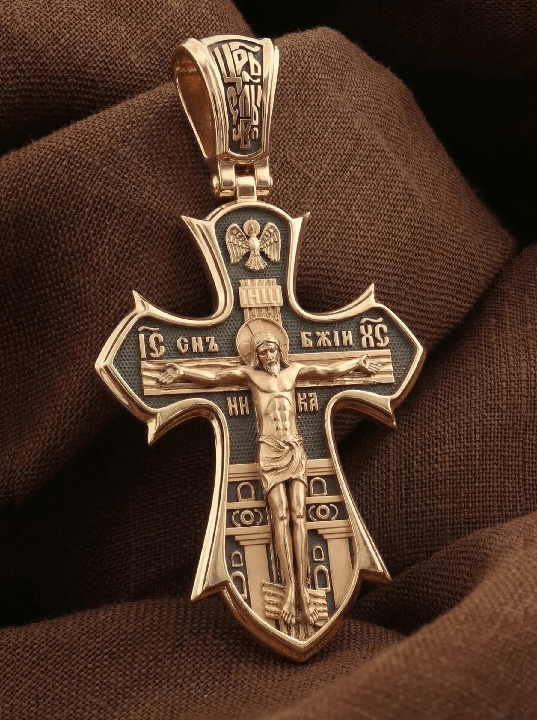 На лицевой стороне креста изображено Распятие Иисуса Христа. Господь представлен свободно покоящимся на кресте с простертыми руками и как бы обнимающим всю Вселенную. Он — Спаситель, искупивший грехи мира, «поправший смертию смерть» и призывающий к Себе «все концы земли». Поэтому рядом с Его образом помещены слова — «НИКА» и «Царь Славы». Эти слова характеризуют Господа как Великого Архиерея, победителя смерти. Верхняя перекладина символизирует титло — табличку, на которой, согласно Евангелию, было начертано: Иисус Назорей Царь Иудейский (IНЦI). Также Распятие сопровождается надписями, олицетворяющими Христа. Это святое имя Христа «IC» (Иисус) «ХС» (Христос), и словосочетание «СЫН БОЖИЙ».