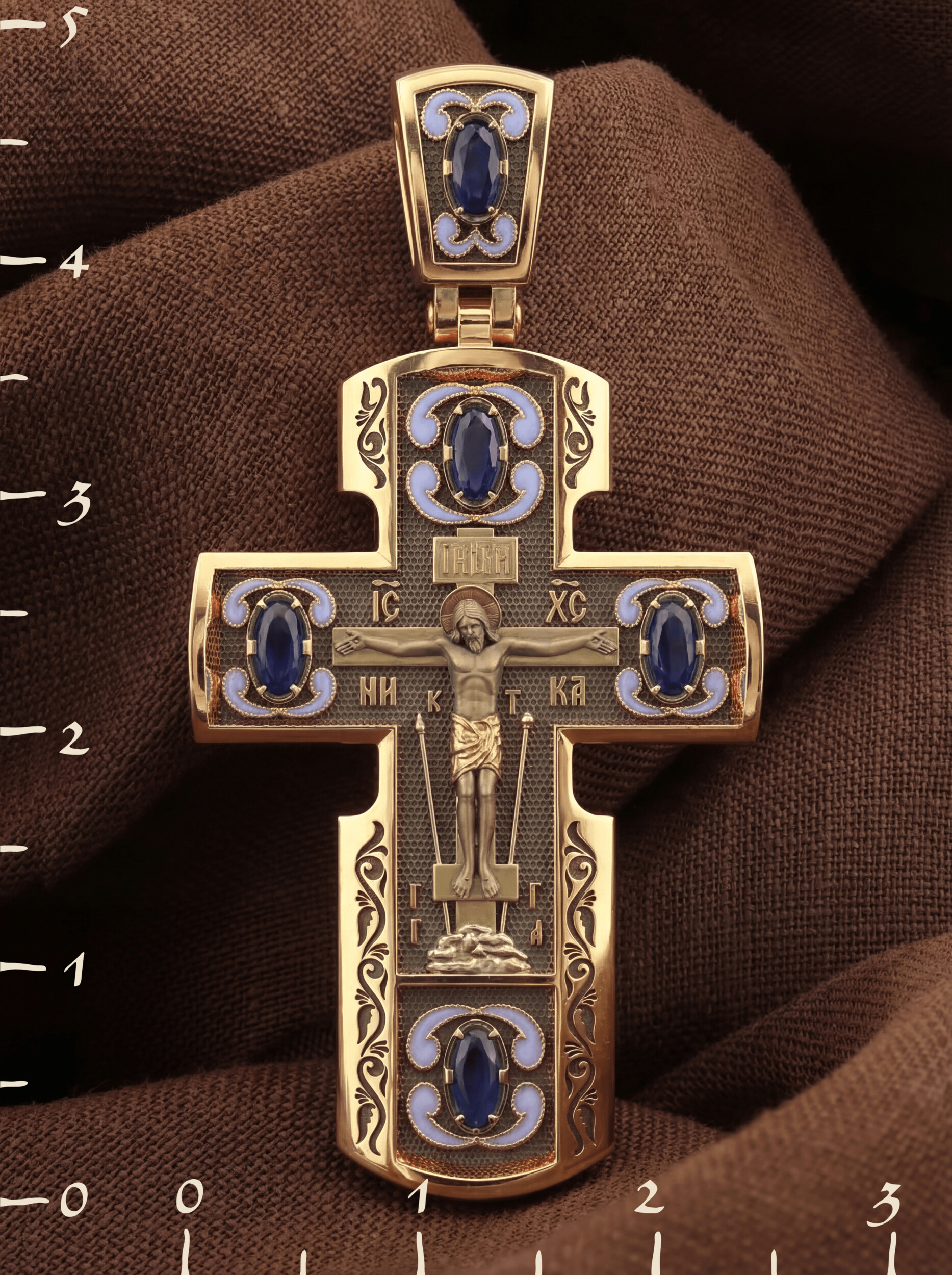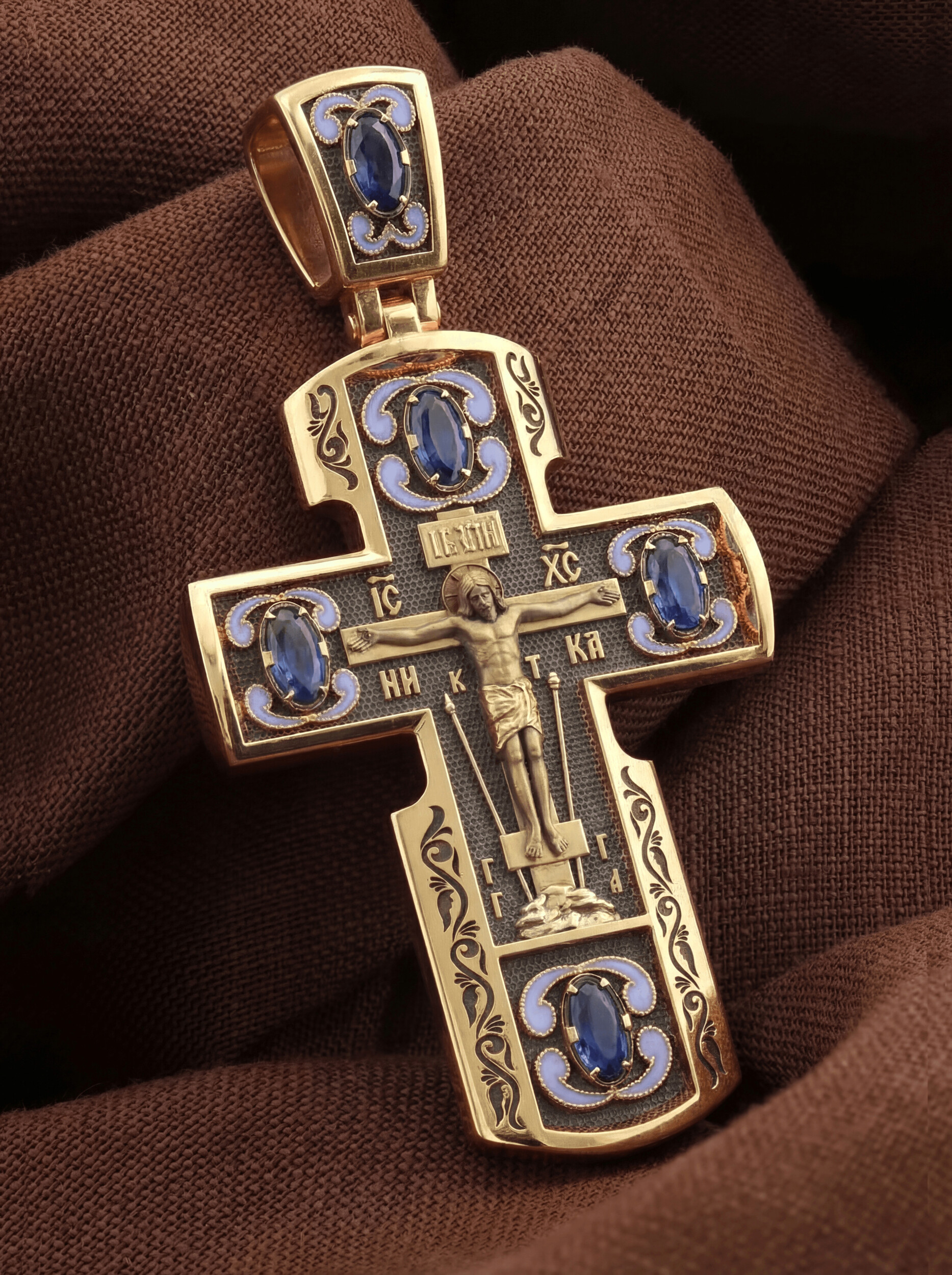 На лицевой стороне креста изображено Распятие Господа и Спасителя нашего Иисуса Христа, отдавшего Себя на смерть, чтобы другие могли жить — жить вечной жизнью, жить с Богом. Через крестную жертву Бог раскрывает нам Свою безмерную любовь и призывает к ответной любви. Своею кровью Господь освятил крест и сделал его проводником Своей благодати, источником освящения верующих. На верхней табличке, выше головы Иисуса, расположена надпись, составленная Понтием Пилатом — «IНЦИ». Она означает «Иисус Назорей, Царь Иудейский». Надписи «IC» «ХС» — имя Иисуса Христа помещаются над средней перекладиной, под ней помещено слово «Ника», что означает Победитель. Крест стоит на горе камней, символизирующих Голгофу, которая обозначена надписью «Г.Г». В ее основании различается череп — это голова Адама, обозначенный надписью «Г.А». Вдоль креста изображены орудия Страстей Христовых: копие сотника Лонгина, которым пронзили подреберье мёртвого Иисуса, чтобы убедиться в Его смерти, и трость с губкой, с которой Иисуса напоили уксусом. Они обозначены буквами «К» и «Т».