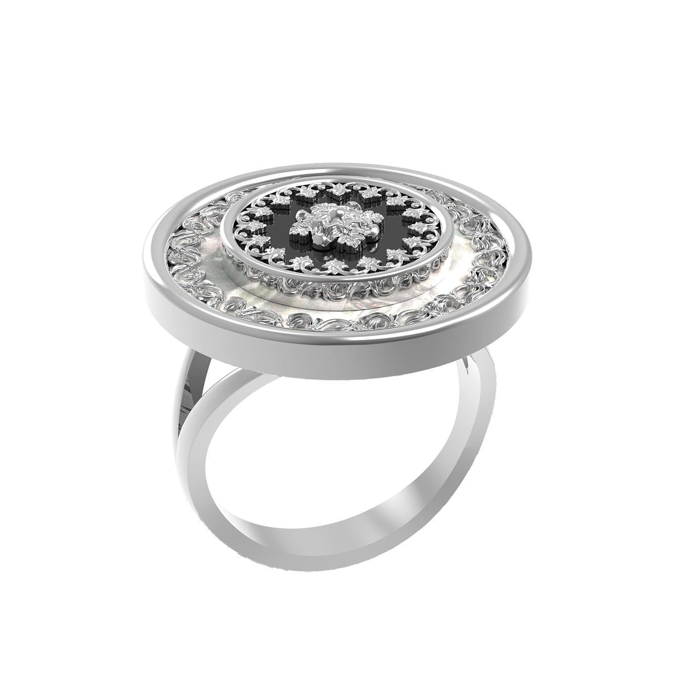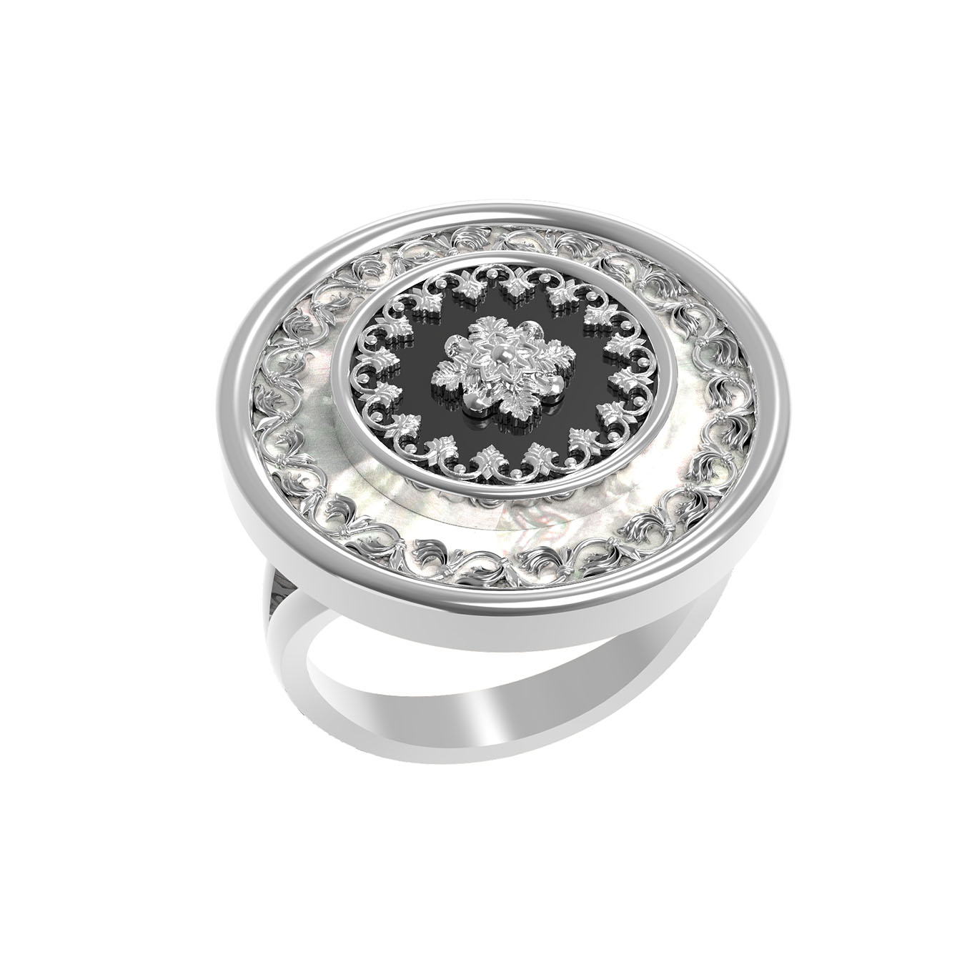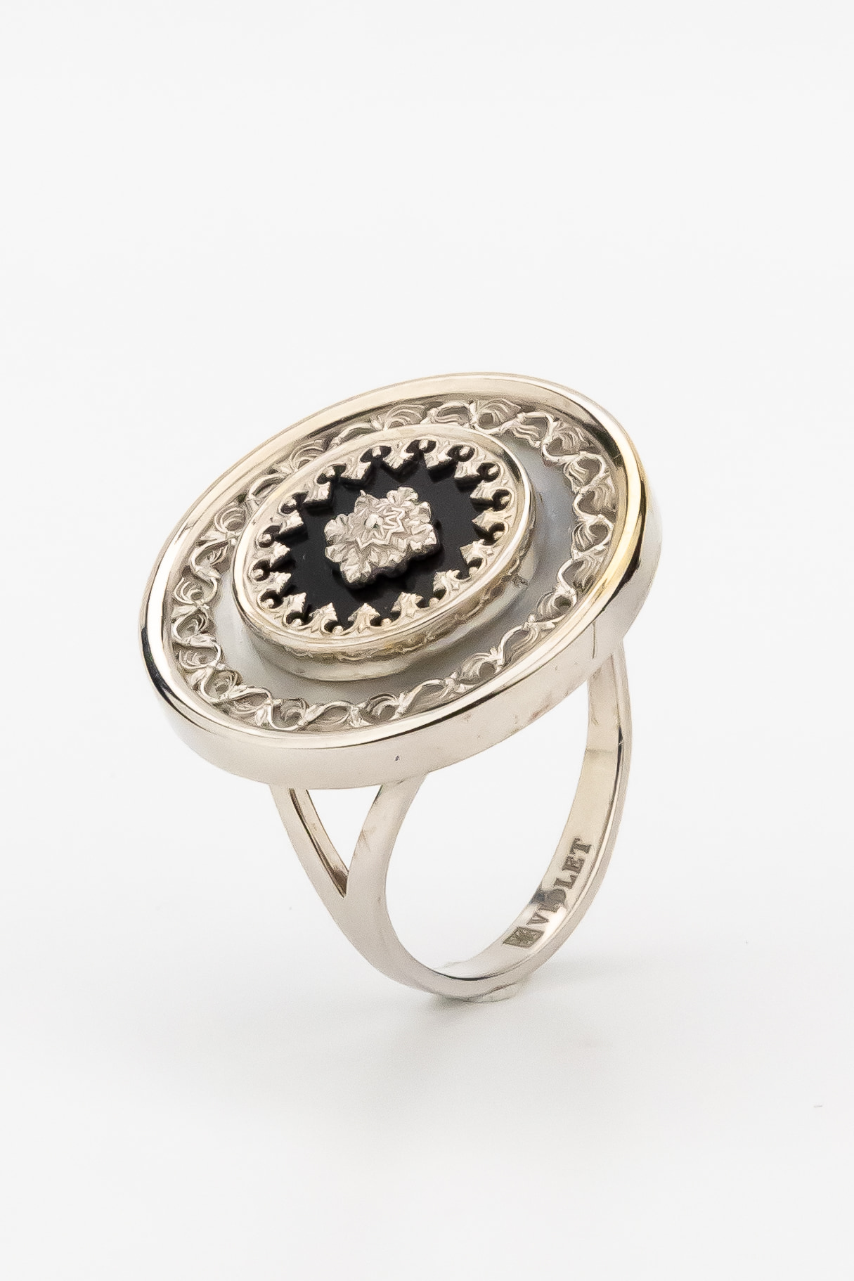 Кольцо из белого золота c ониксом и перламутром