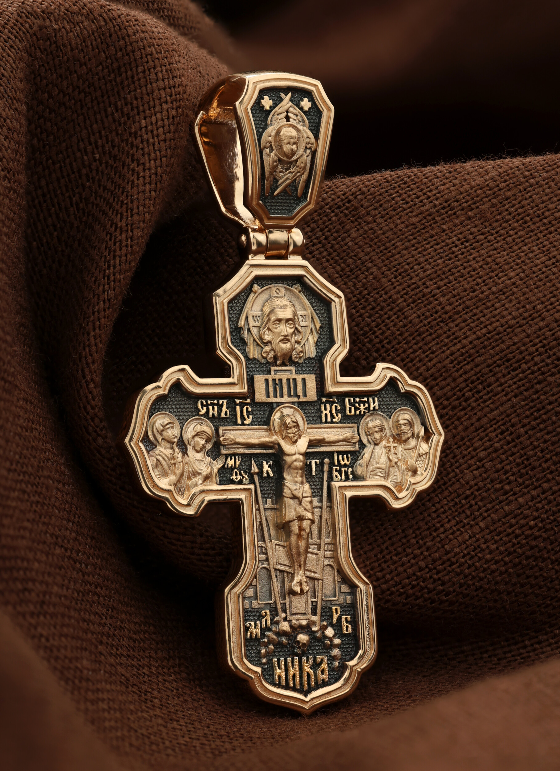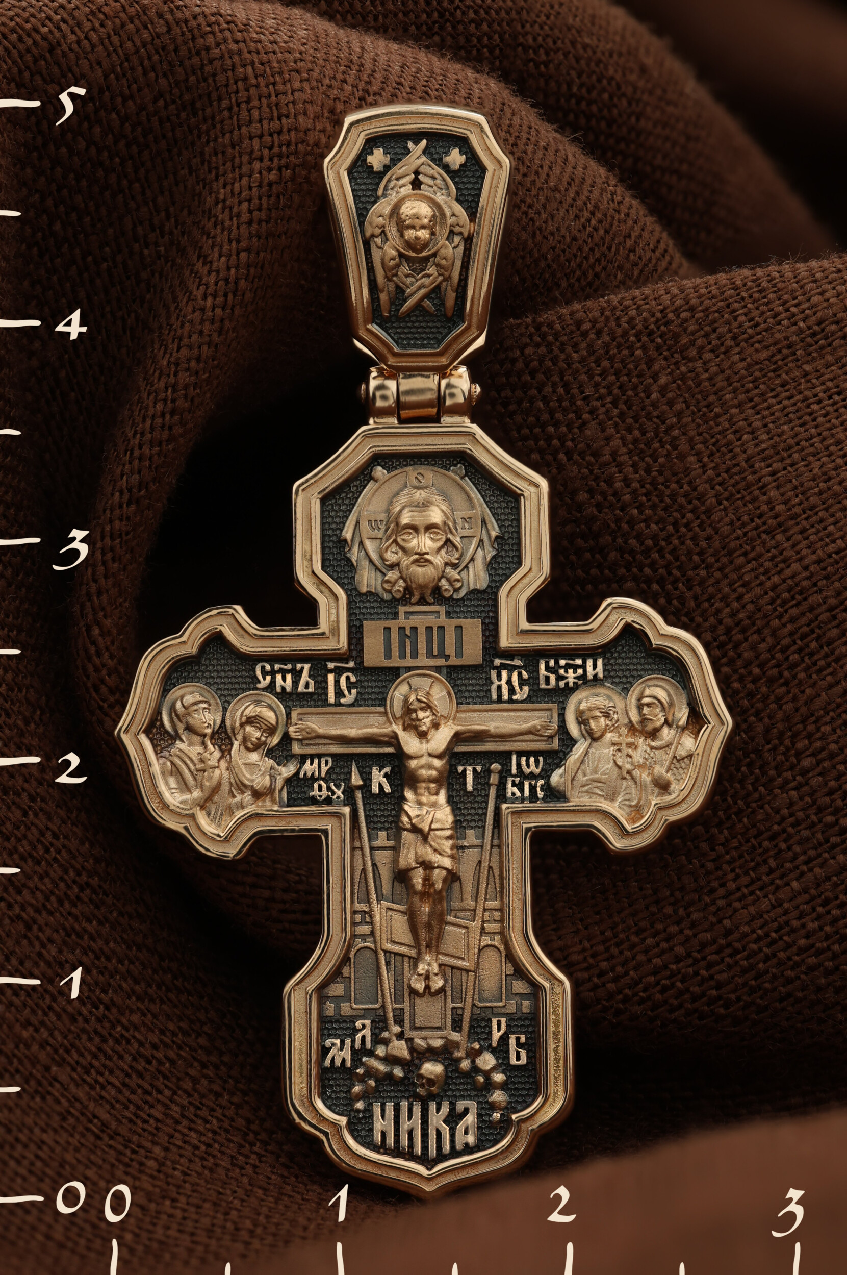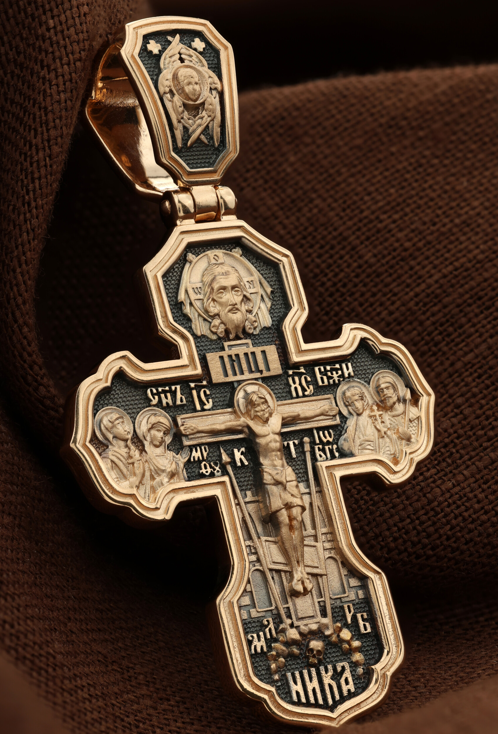 На лицевой стороне креста изображено Распятие Господа и Спасителя нашего Иисуса Христа. Крест- символ спасения и искупления рода человеческого, знамение победы над смертью и адом. Иисус Христос, как искупительная жертва освобождения человечества от власти греха, умер крестной смертью и в третий день воскрес. На верхней табличке, выше головы Иисуса, расположена надпись, составленная Понтием Пилатом — «IНЦI». Она означает «Иисус Назорей, Царь Иудейский». Надпись «IС» « ХС» означает Иисус Христос и помещается на разных сторонах поперечной (большой) перекладины креста. Рядом расположена надпись «Сын Божий». Выше Распятия изображен Нерукотворный образ Господа и Спасителя нашего Иисуса Христа. Слева от Распятия — Пресвятая Богородица и святая мироносица Мария Магдалина с крестом в руке. Справа — апостол и евангелист Иоанн Богослов, один из ближайших учеников Иисуса Христа и сотник Лонгин с крестом в правой руке и копьем — в левой. За крестом высится Иерусалимская стена. Крест стоит на горе камней, символизирующих Голгофу. В ее основании различается череп — это голова Адама. Вдоль креста изображены копие сотника Лонгина и трость с губкой и буквы «К» и «Т». Надпись «МЛРБ» — «место лобное рай бысть» означает, что место лобное стало раем и помещаются в нижней части креста. Рядом — слово «НИКА», что означает «победитель». На православном кресте Христос не умирает, а свободно простирает руки, ладони Иисуса открыты, будто он хочет обнять все человечество, даря им свою любовь и открывая путь к вечной жизни. На кулонном кольце изображен шестикрылый Серафим.
