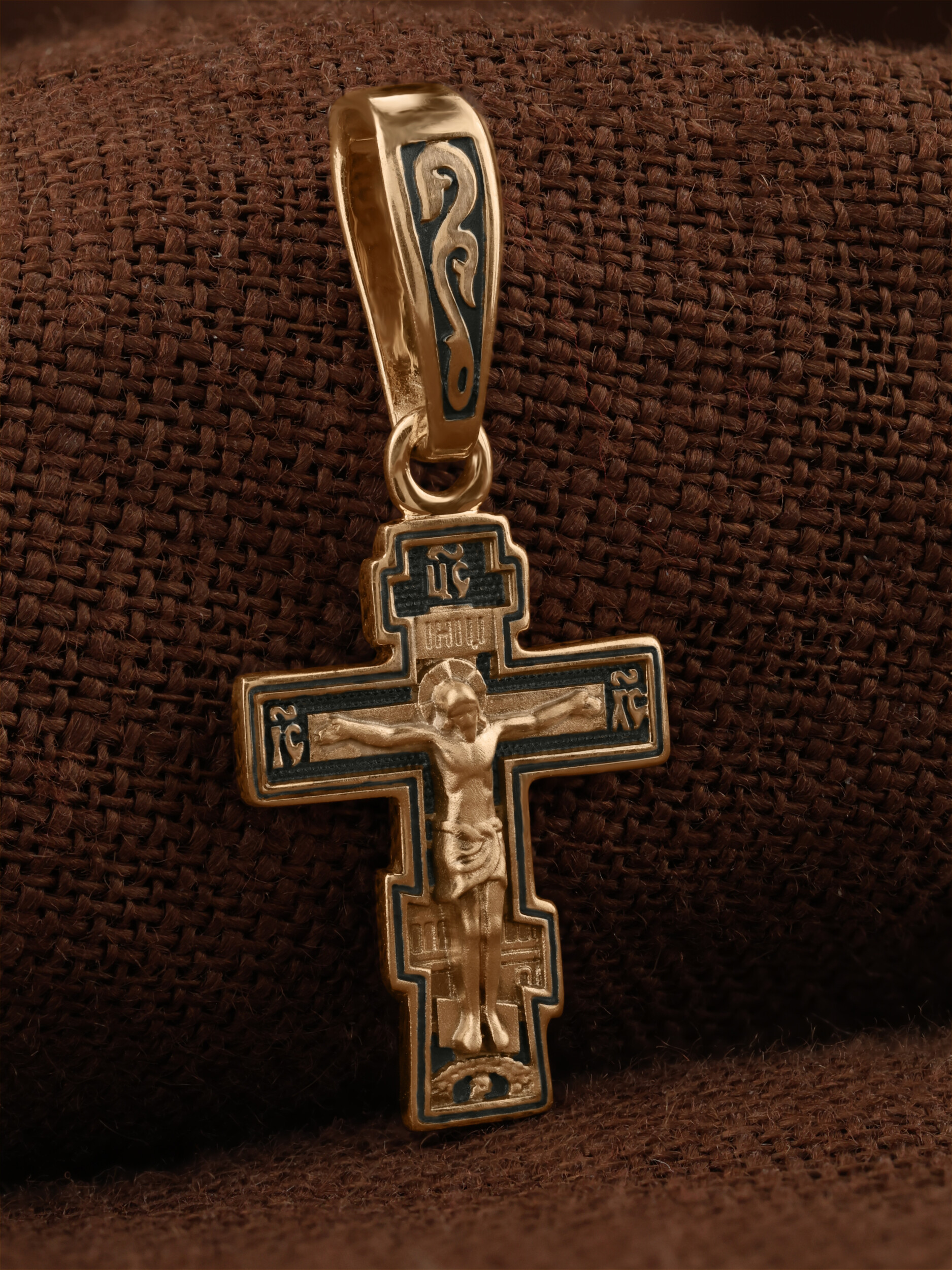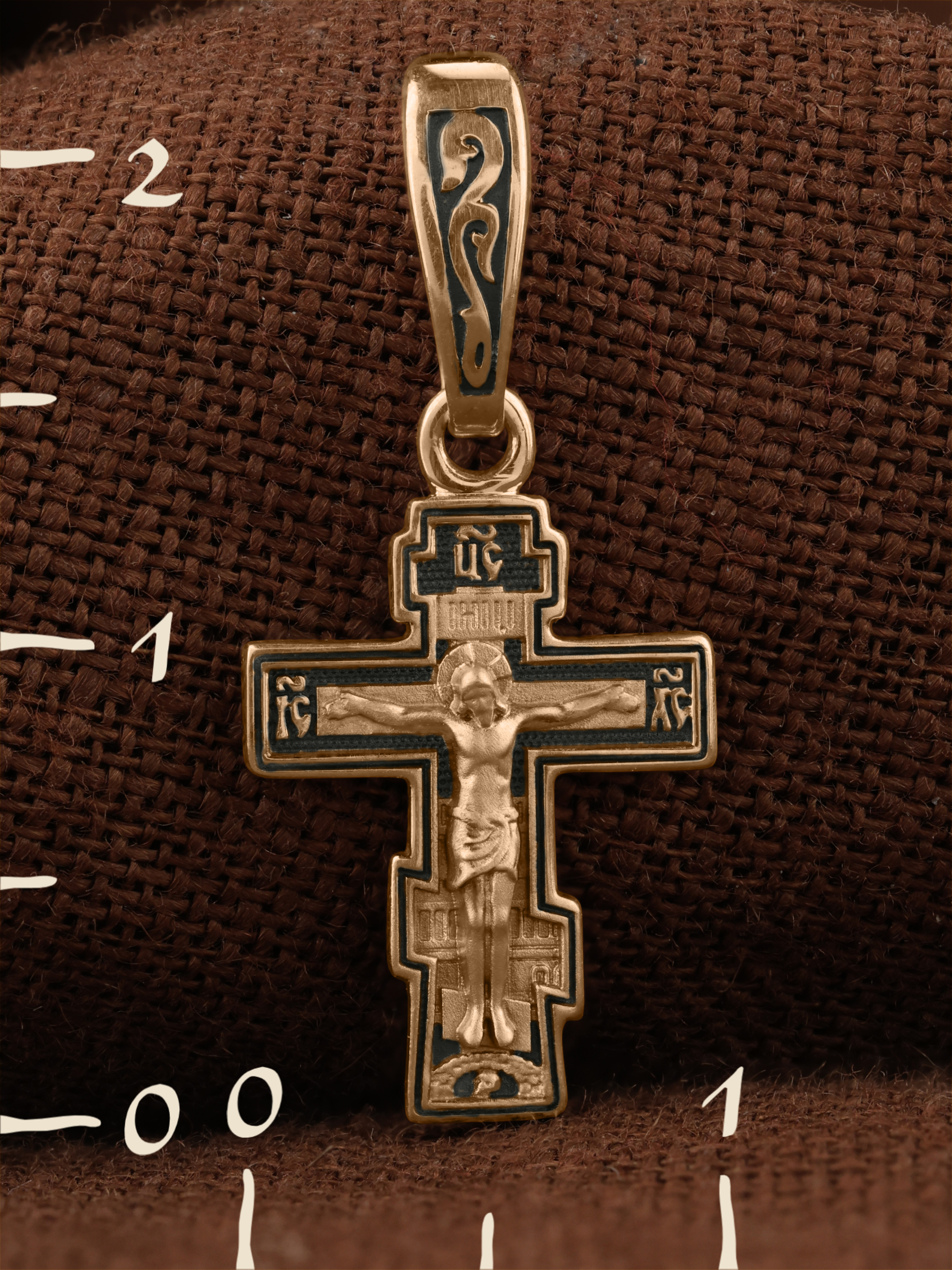 На лицевой стороне креста изображено Распятие Господа и Спасителя нашего Иисуса Христа, отдавшего Себя на смерть для искупления грехов мира. Крест является символом жертвенной любви Всеблагого Бога к падшим людям, всепобеждающим духовным оружием христиан, основанием и средоточием церковной жизни. Над вершиной Распятия помещена надпись «Царь Славы». На верхней перекладине расположена надпись «IНЦI». Она символизирует титло — табличку, на которой, согласно Евангелию, было начертано: Иисус Назорей, Царь Иудейский. Надпись «IC» «ХC»», означает Иисус Христос, помещаются на разных сторонах поперечной перекладины креста. Ниже помещена надпись «НИКА», что означает «победитель». Крест стоит на горе камней, символизирующих Голгофу. Под подножием Креста изображена покоящаяся голова (череп) Адама.