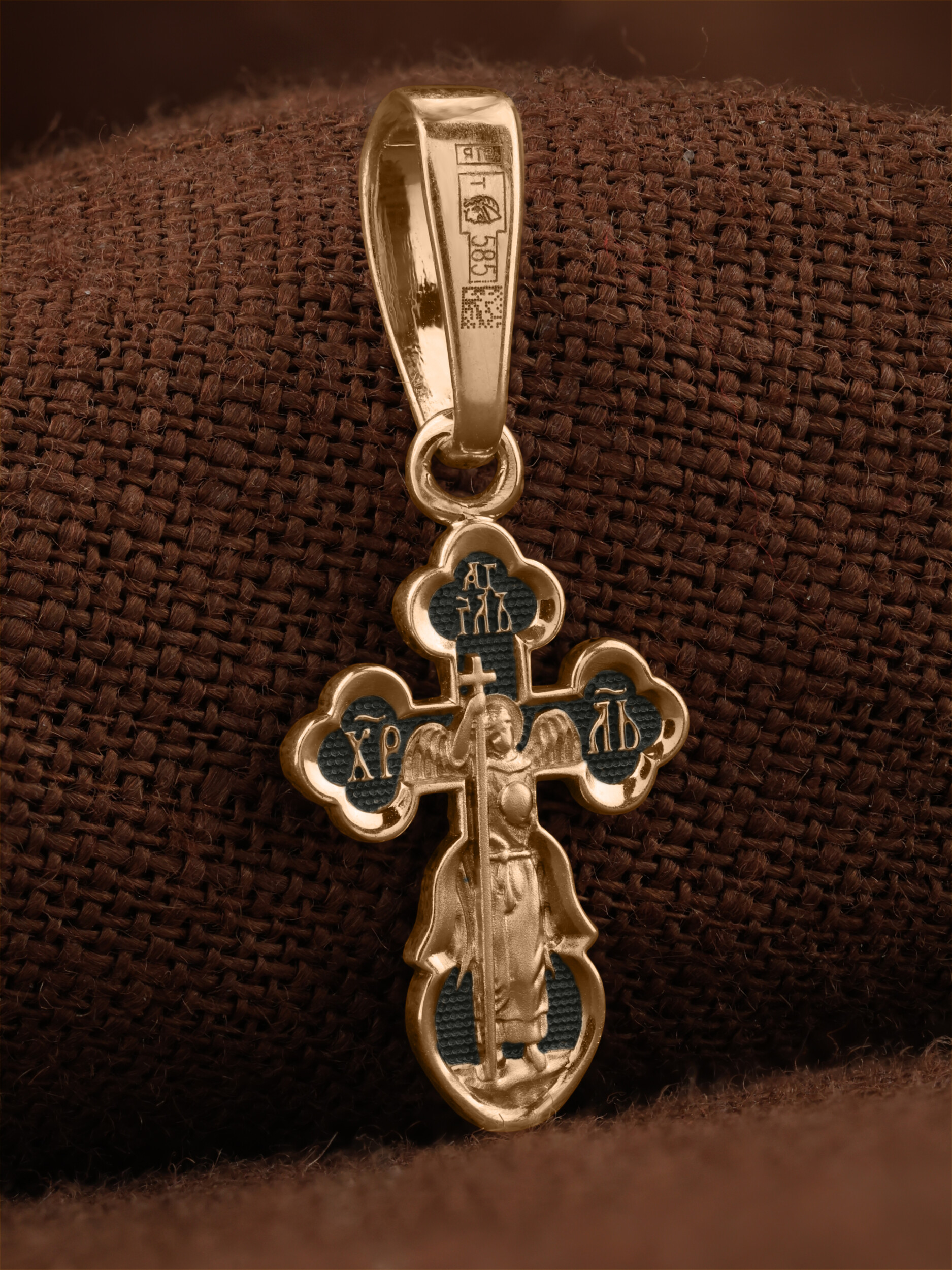 На оборотной стороне креста изображен святой Ангел-Хранитель в виде прекрасного юноши держащего в правой руке крест, а в левой — сферу. Ангел-Хранитель — это Ангел приставляемый Богом к человеку при крещении для охраны и помощи в добрых делах. Невидимо пребывая при нас постоянно, он, руководствуя нас ко спасению, не только по нашему желанию таинственно наставляет нас на все доброе и полезное, не только возносит наши молитвы к Богу, но еще и сам от себя охраняют и защищают нас от врагов видимых и невидимых, ходатайствует за нас пред Богом.