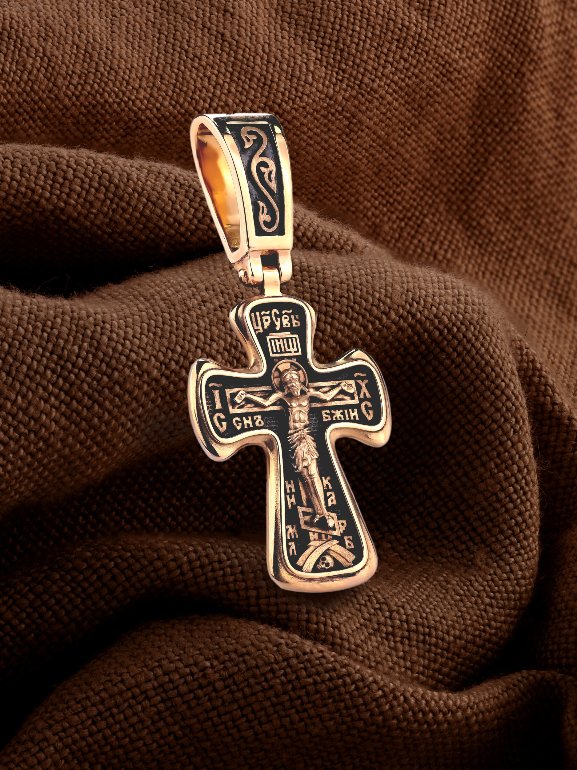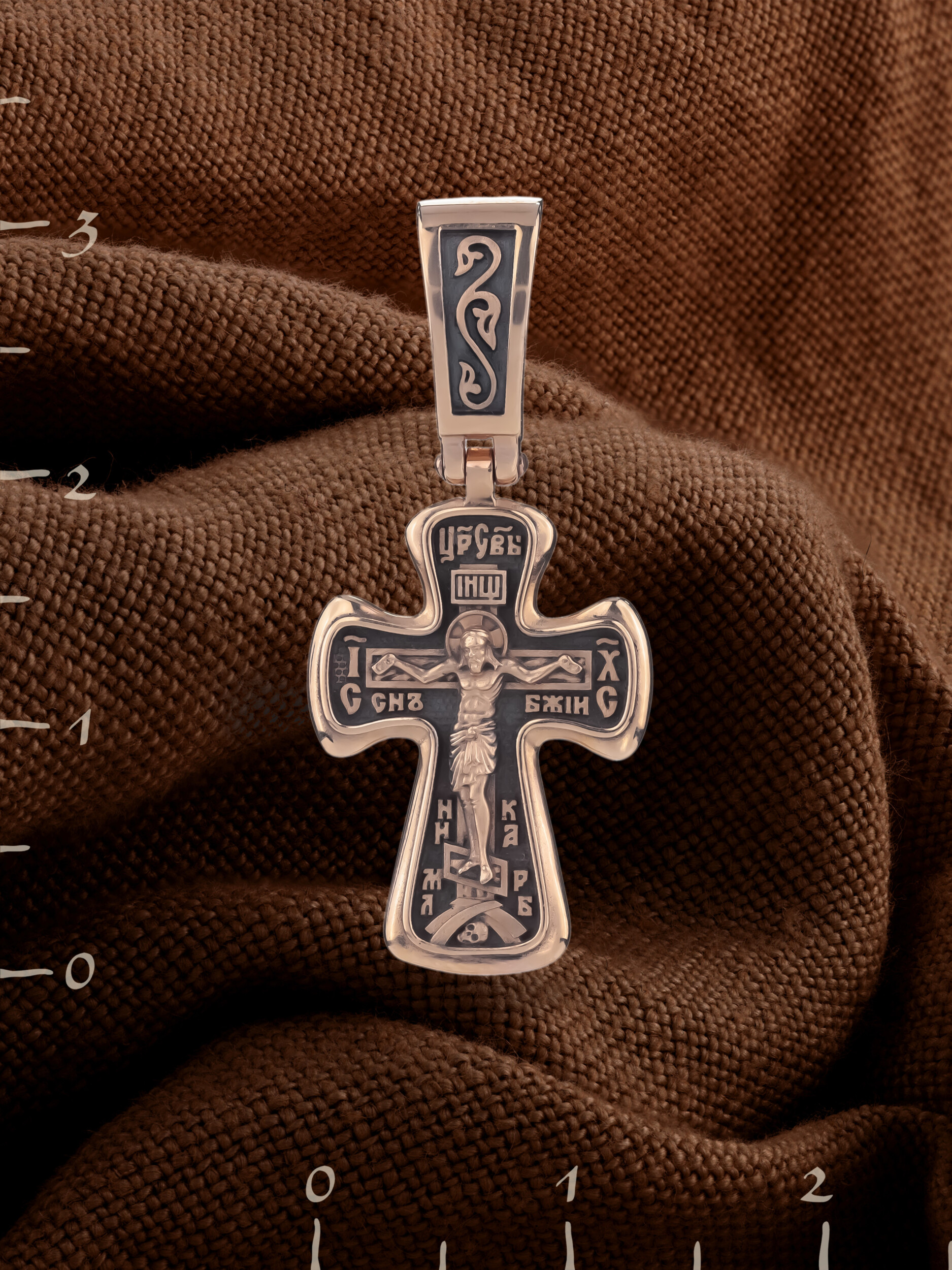 На лицевой стороне креста изображено Распятие, потому что это орудие казни Иисус Христос сделал орудием победы над грехом и смертью. Своими страданиями Он искупил грехи человечества, умерев и сошествовав во ад, победил сатану, освободил души праведников от вечной смерти и открыл им небесные врата рая. Жертва Христа сделала возможным спасение для каждого человека. На православном кресте Христос не умирает, а свободно простирает руки, ладони Иисуса открыты, будто он хочет обнять все человечество, даря им свою любовь и открывая путь к вечной жизни. Над титлом видим слова «ЦРЬ СЛВЫ» — Царь Славы. Верхняя перекладина символизирует собой табличку с надписью «IHЦI» — Иисус Назарянин Царь Иудейский. Возле перекладины пишется сокращенно имя Спасителя «IC XC» — Иисус Христос, ниже перекладины добавляется: словосочетание «СНЪ БЖІЙ» — Сын Божий и «НИКА» (греч. — Победитель). Возвышение, на котором стоит Крест, символизирует гору Голгофу, на которой произошло Распятие. У подножия Креста изображают прах Адама, обозначенный черепом.
