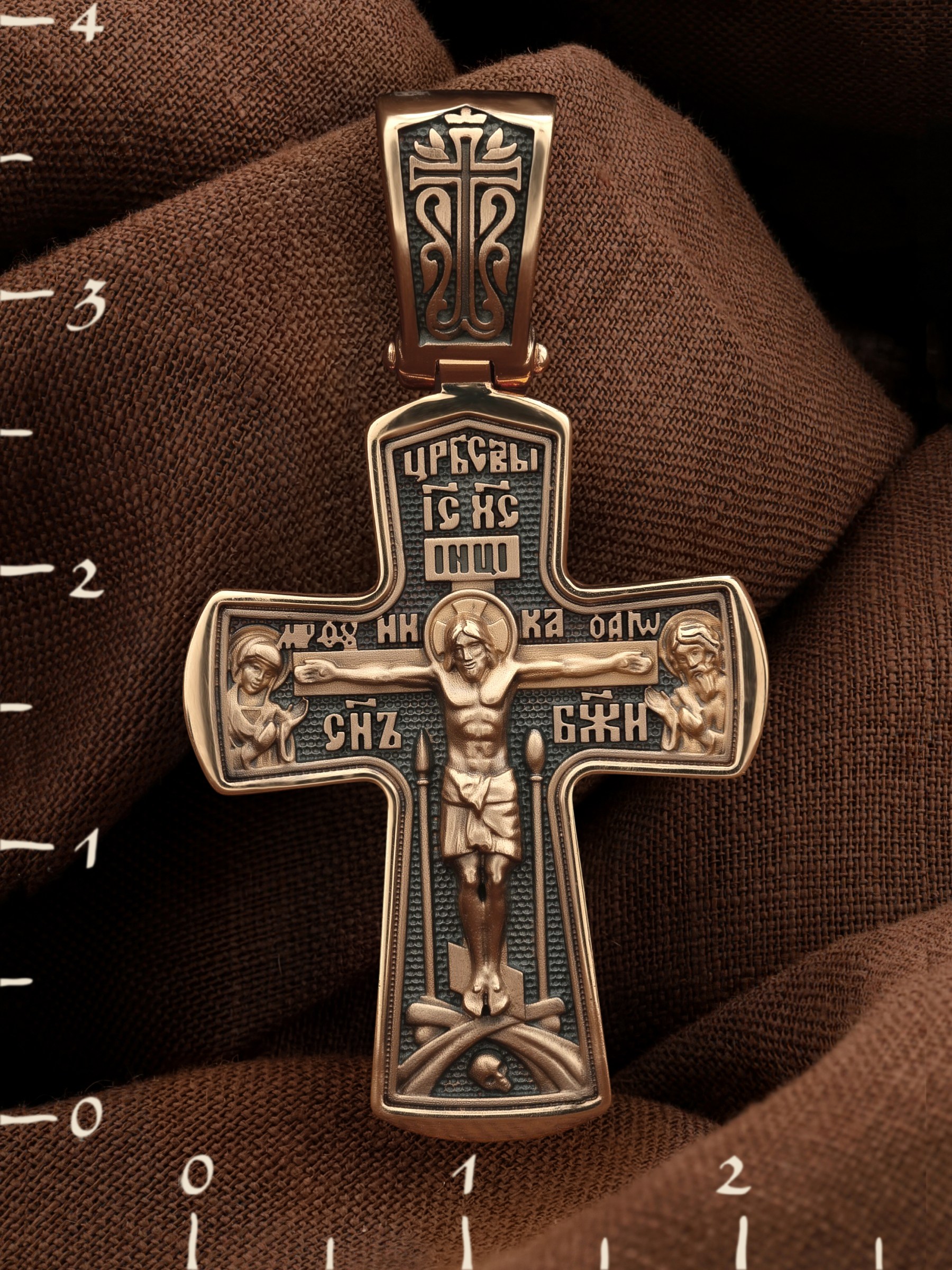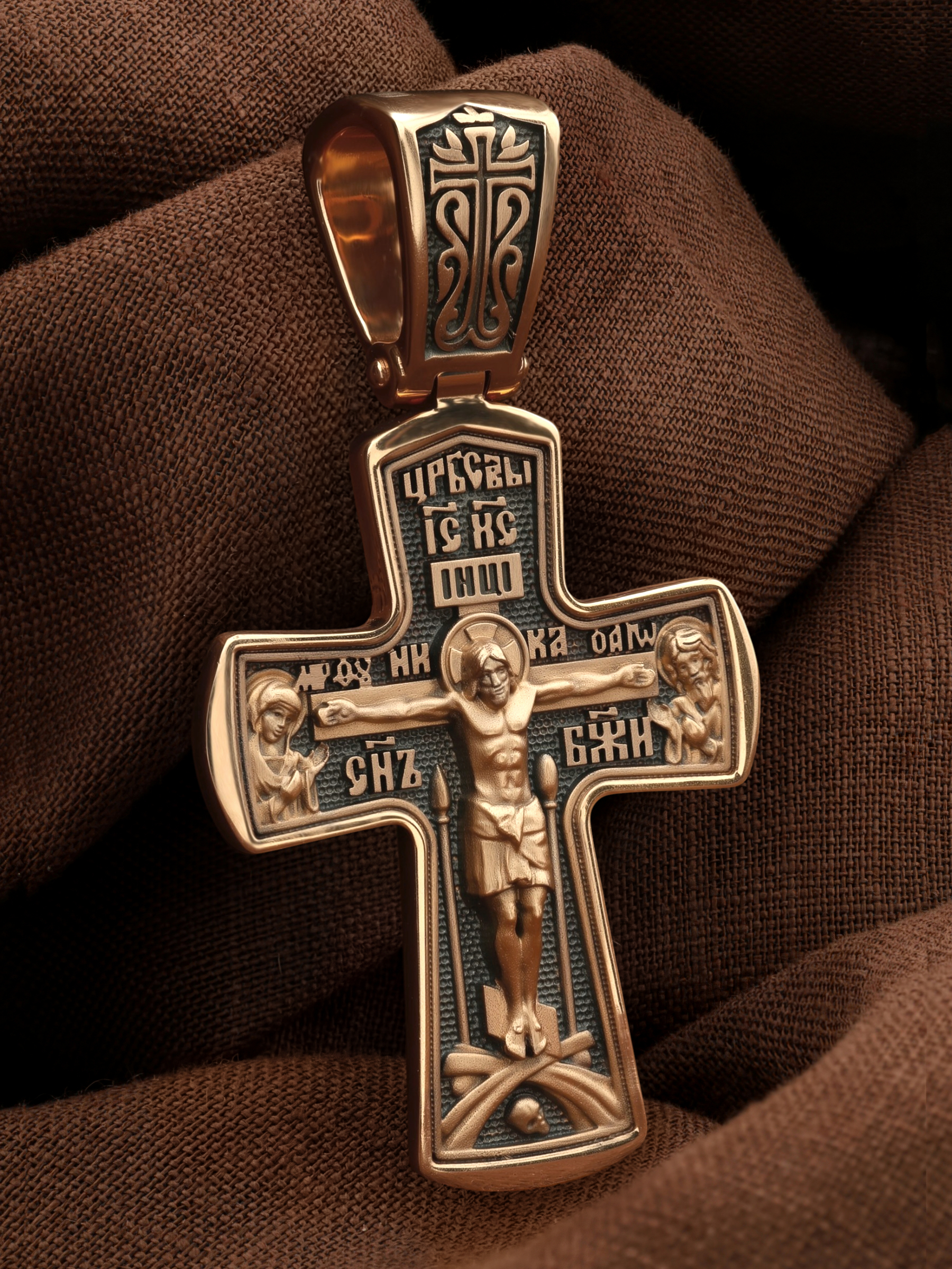 На лицевой стороне креста изображено Распятие Господа и Спасителя нашего Иисуса Христа, отдавшего Себя на смерть, для искупления грехов мира. Крест является символом жертвенной любви Всеблагого Бога к падшим людям, всепобеждающим духовным оружием христиан, основанием и средоточием церковной жизни. Господь сказал: «кто хочет идти за Мною, отвергнись себя, и возьми крест свой, и следуй за Мною». (Мк. 8: 34). На кулонном кольце изображен процветший крест. На верхней табличке, выше головы Иисуса, расположена надпись, составленная Понтием Пилатом — «IНЦI». Она означает «Иисус Назорей, Царь Иудейский». Распятие сопровождается каноническими надписями. Выше Распятия помещена надпись «Царь Славы» и надпись «IC» «ХC», означает Иисус Христос. Слово «НИКА», что означает «победитель» и надпись «Сын Божий», что означает божественную природу Иисуса Христа, помещаются на разных сторонах поперечной перекладины креста. Слева от Распятия изображена Пресвятая Богородица, справа — Про¬рок Предтеча и Креститель Господень Иоанн. Вдоль креста помещены Орудия Страстей Господних — копие сотника Лонгина и трость с губкой. Крест стоит на горе камней, символизирующих Голгофу. В ее основании различается череп– это голова Адама. На православном кресте Христос не умирает, а свободно простирает руки, ладони Иисуса открыты, будто он хочет обнять все человечество, даря им свою любовь и открывая путь к вечной жизни.