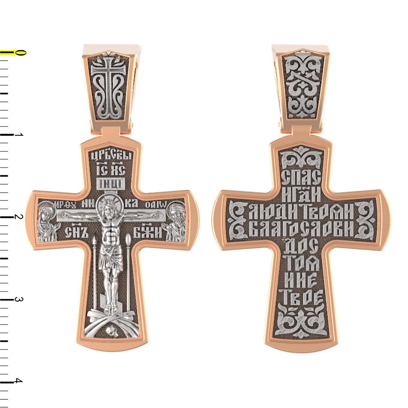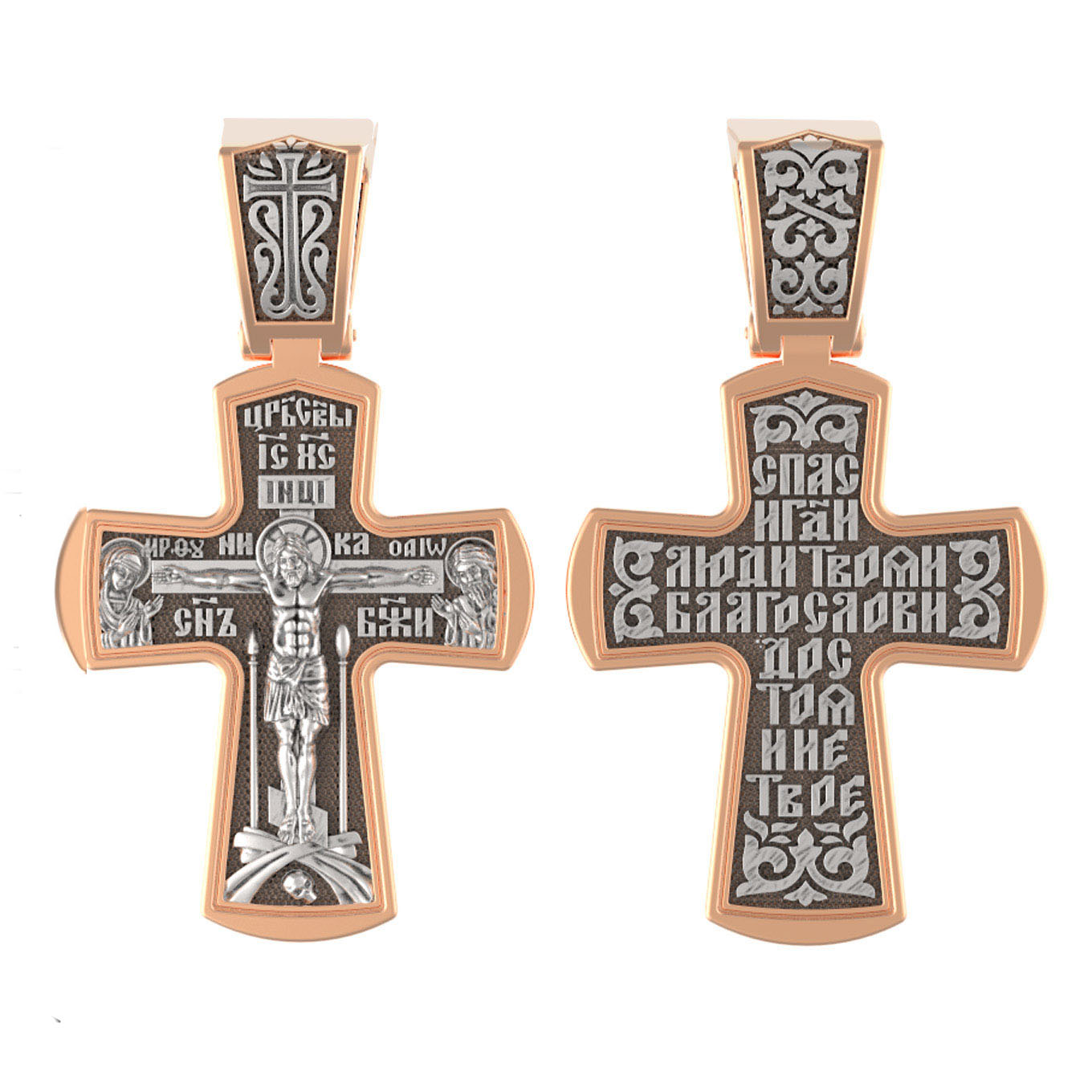 На лицевой стороне креста изображено Распятие Господа и Спасителя нашего Иисуса Христа, отдавшего Себя на смерть, для искупления грехов мира. Крест является символом жертвенной любви Всеблагого Бога к падшим людям, всепобеждающим духовным оружием христиан, основанием и средоточием церковной жизни. Господь сказал: «кто хочет идти за Мною, отвергнись себя, и возьми крест свой, и следуй за Мною». (Мк. 8: 34). На кулонном кольце изображен процветший крест. На верхней табличке, выше головы Иисуса, расположена надпись, составленная Понтием Пилатом — «IНЦI». Она означает «Иисус Назорей, Царь Иудейский». Распятие сопровождается каноническими надписями. Выше Распятия помещена надпись «Царь Славы» и надпись «IC» «ХC», означает Иисус Христос. Слово «НИКА», что означает «победитель» и надпись «Сын Божий», что означает божественную природу Иисуса Христа, помещаются на разных сторонах поперечной перекладины креста. Слева от Распятия изображена Пресвятая Богородица, справа — Про¬рок Предтеча и Креститель Господень Иоанн. Вдоль креста помещены Орудия Страстей Господних — копие сотника Лонгина и трость с губкой. Крест стоит на горе камней, символизирующих Голгофу. В ее основании различается череп– это голова Адама. На православном кресте Христос не умирает, а свободно простирает руки, ладони Иисуса открыты, будто он хочет обнять все человечество, даря им свою любовь и открывая путь к вечной жизни.