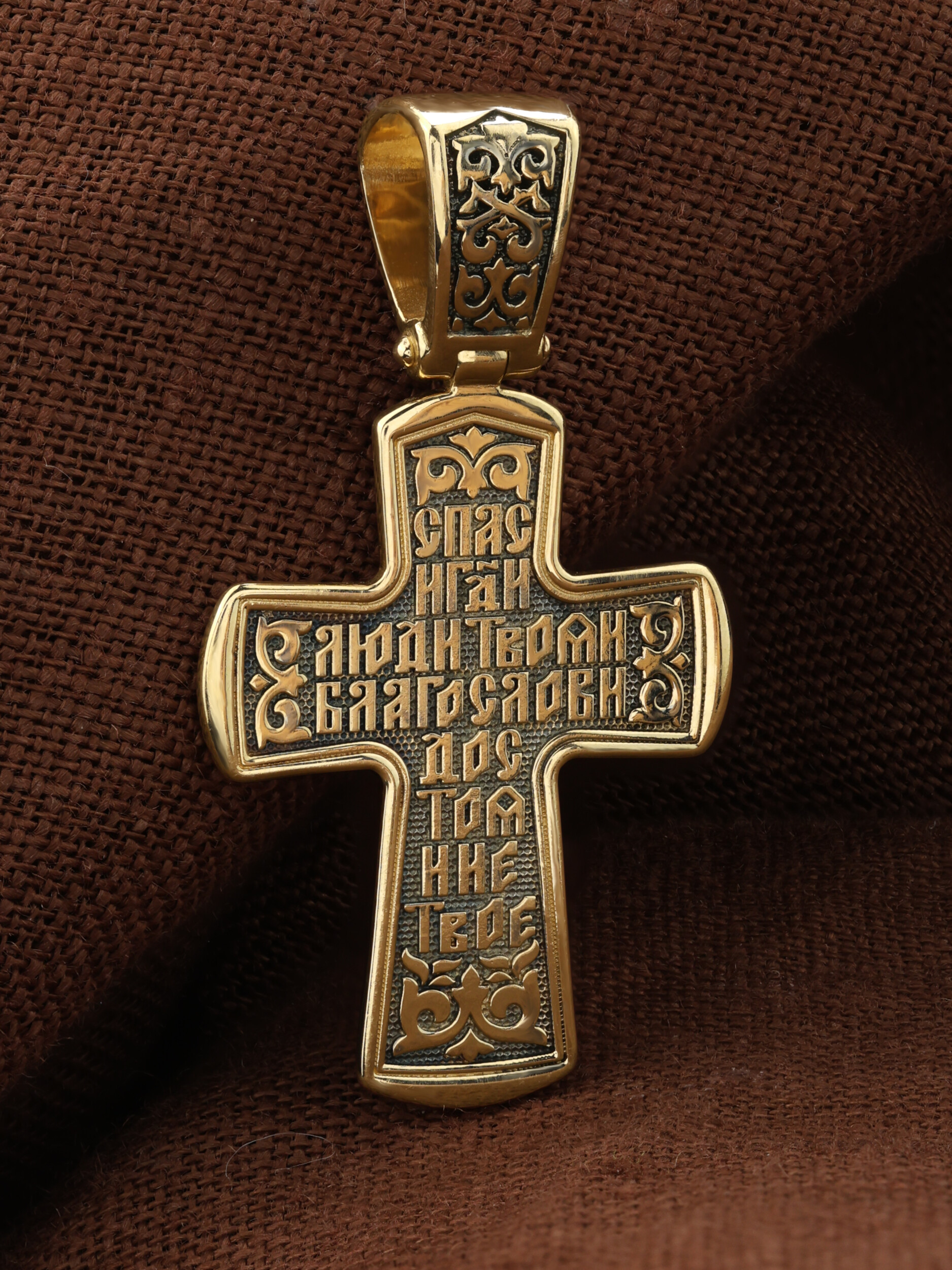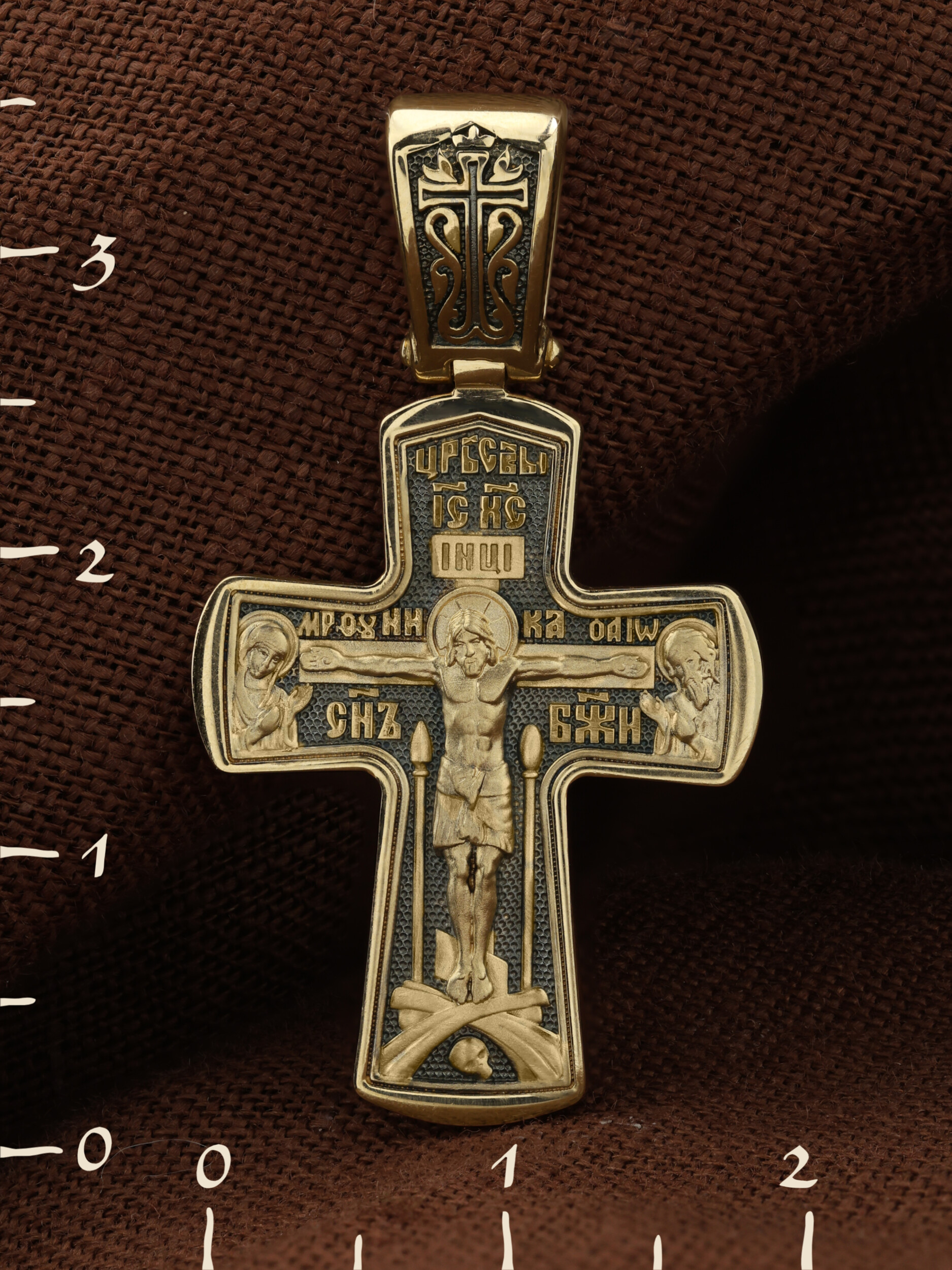 На лицевой стороне креста изображено Распятие Господа и Спасителя нашего Иисуса Христа, отдавшего Себя на смерть, для искупления грехов мира. Крест является символом жертвенной любви Всеблагого Бога к падшим людям, всепобеждающим духовным оружием христиан, основанием и средоточием церковной жизни. Господь сказал: «кто хочет идти за Мною, отвергнись себя, и возьми крест свой, и следуй за Мною». (Мк. 8: 34). На кулонном кольце изображен процветший крест. На верхней табличке, выше головы Иисуса, расположена надпись, составленная Понтием Пилатом — «IНЦI». Она означает «Иисус Назорей, Царь Иудейский». Распятие сопровождается каноническими надписями. Выше Распятия помещена надпись «Царь Славы» и надпись «IC» «ХC», означает Иисус Христос. Слово «НИКА», что означает «победитель» и надпись «Сын Божий», что означает божественную природу Иисуса Христа, помещаются на разных сторонах поперечной перекладины креста. Слева от Распятия изображена Пресвятая Богородица, справа — Про¬рок Предтеча и Креститель Господень Иоанн. Вдоль креста помещены Орудия Страстей Господних — копие сотника Лонгина и трость с губкой. Крест стоит на горе камней, символизирующих Голгофу. В ее основании различается череп– это голова Адама. На православном кресте Христос не умирает, а свободно простирает руки, ладони Иисуса открыты, будто он хочет обнять все человечество, даря им свою любовь и открывая путь к вечной жизни.