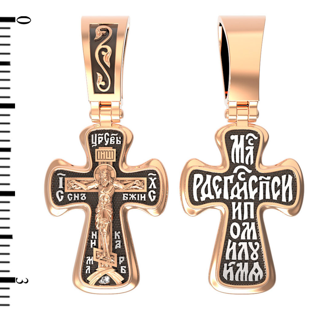 На лицевой стороне креста изображено Распятие, потому что это орудие казни Иисус Христос сделал орудием победы над грехом и смертью. Своими страданиями Он искупил грехи человечества, умерев и сошествовав во ад, победил сатану, освободил души праведников от вечной смерти и открыл им небесные врата рая. Жертва Христа сделала возможным спасение для каждого человека. На православном кресте Христос не умирает, а свободно простирает руки, ладони Иисуса открыты, будто он хочет обнять все человечество, даря им свою любовь и открывая путь к вечной жизни. Над титлом видим слова «ЦРЬ СЛВЫ» — Царь Славы. Верхняя перекладина символизирует собой табличку с надписью «IHЦI» — Иисус Назарянин Царь Иудейский. Возле перекладины пишется сокращенно имя Спасителя «IC XC» — Иисус Христос, ниже перекладины добавляется: словосочетание «СНЪ БЖІЙ» — Сын Божий и «НИКА» (греч. — Победитель). Возвышение, на котором стоит Крест, символизирует гору Голгофу, на которой произошло Распятие. У подножия Креста изображают прах Адама, обозначенный черепом.