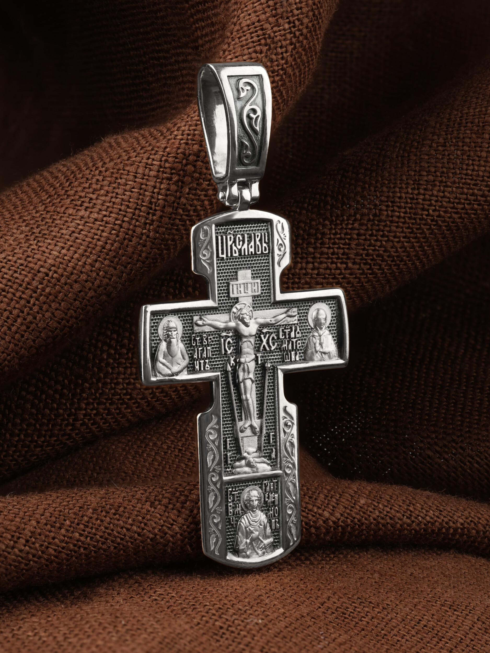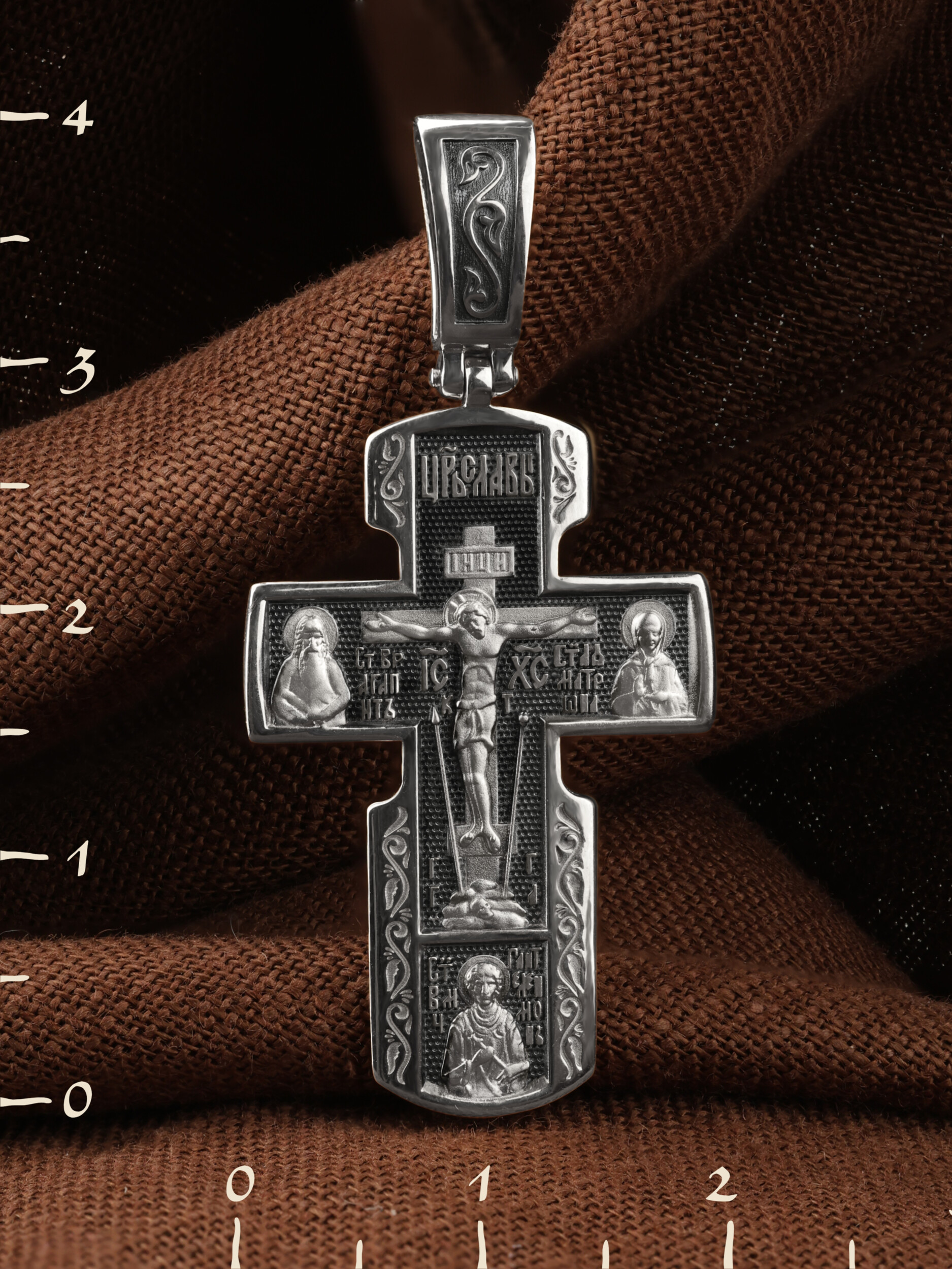 Как действенная помощь в немощах и болезнях был создан крест с образами святых целителей и со знаменитой афонской иконой Божией Матери «Всецарица». На лицевой стороне креста изображено Распятие Иисуса Христа. Над титлом видим слова «ЦРЬ СЛВЫ» — Царь Славы. Верхняя перекладина символизирует собой табличку с надписью «IHЦI» — Иисус Назарянин Царь Иудейский. Под перекладиной пишется сокращенно имя Спасителя «IC XC» — Иисус Христос. Возвышение, на котором стоит Крест, символизирует гору Голгофу, на которой произошло Распятие. У подножия Креста изображают прах Адама, обозначенный черепом. Справа от Распятия помещен образ прославленной святой блаженной Матроны. Слева — икона Преподобный Агапита. Этот святой жил в пещерах Киево-Печерского монастыря в XI веке и бескорыстно врачевал мирян и монахов. У основания Креста Господня изображен великомученик Пантелеимон Целитель. Господь даровал удивительную силу его молитве. Ею он исцелял любые болезни и даже воскрешал умерших.