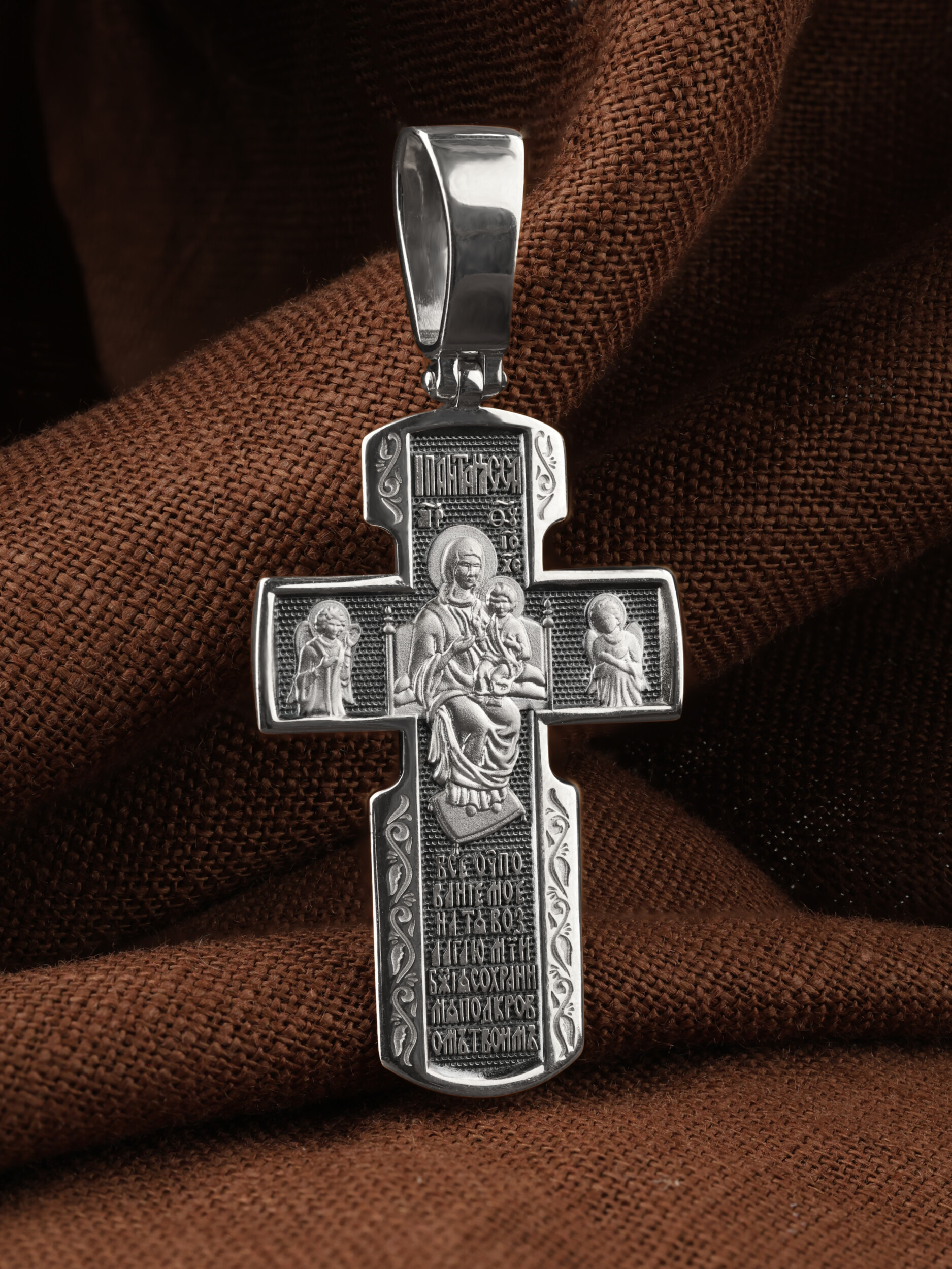 Весь оборот креста занимает икона Божией Матери «Всецарица». Внизу креста написана молитва обращенная к Божией Матери «Все упование мое на Тя возлагаю, Мати Божия, сохрани мя под кровом Твоим».