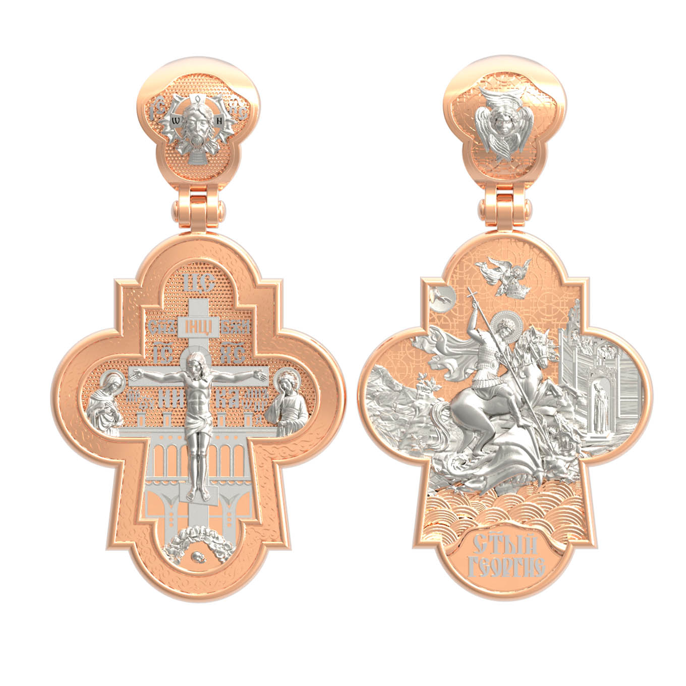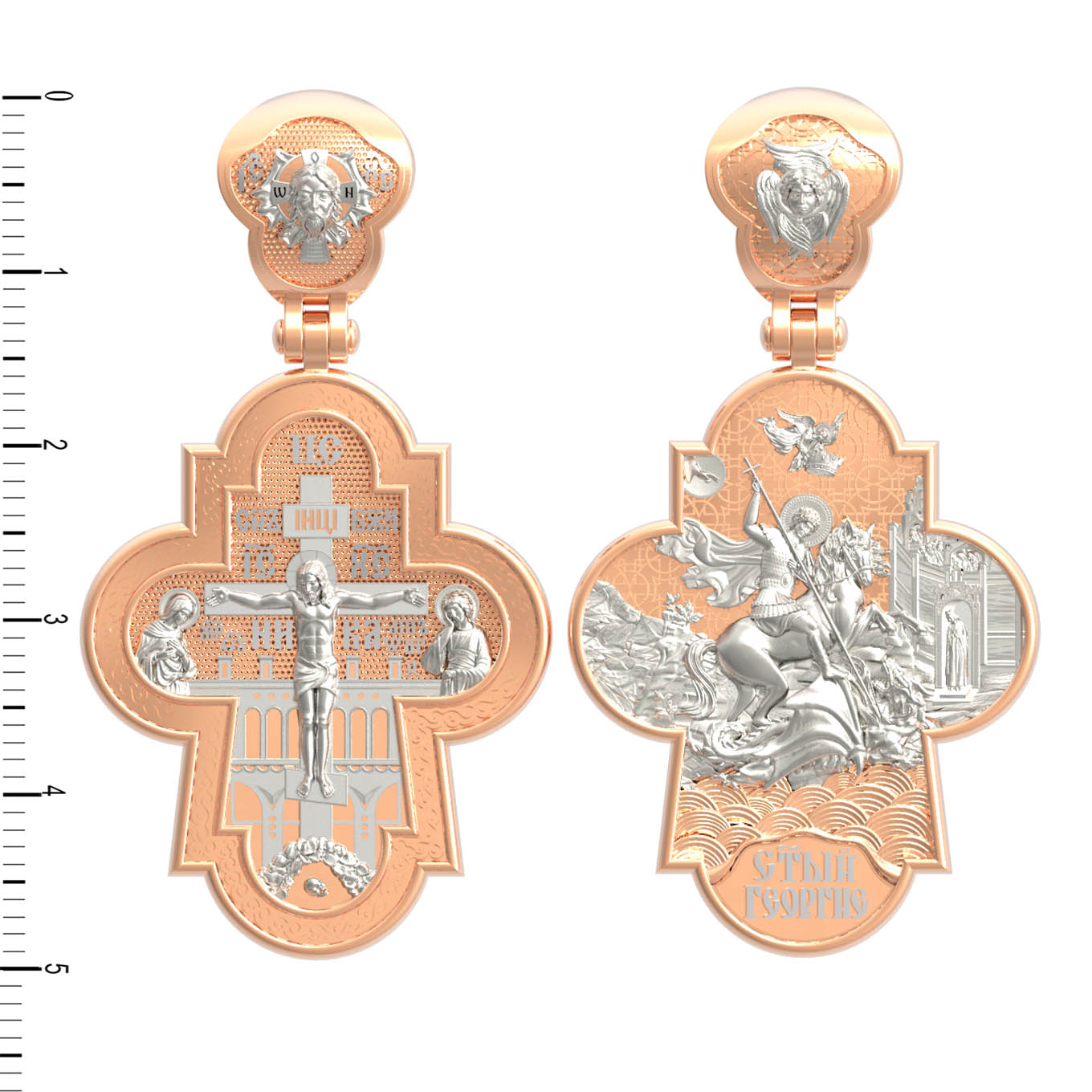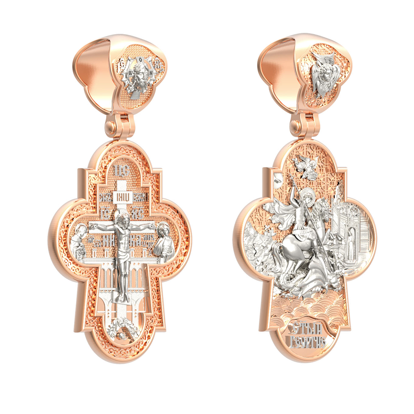 На оборотной стороне креста помещено изображение Святого Великомученика Георгия Победоносца — одного из самых почитаемых и удивительных святых. Георгий родился в Каппадокии (Малая Азия) в семье богатых и знатных горожан. Юношей поступил на службу к римскому императору Диоклетиану, за отличное знание военного дела и проявленную в боях и походах храбрость был приближен к императору и удостоен высокого воинского звания. Во время начавшихся гонений на христиан, перешел на сторону гонимых и, отвергнув человеческий страх, стал ярым проповедником учения Христа. Мучители подвергли опального воеводу жесточайшим восьмидневным пыткам и казнили его (обезглавили) в возрасте около тридцати лет в 303 году. Георгий изображен как воитель, сидящий на вздыбленном коне и поражающий копьем огнедышащего змея. Слева над образом изображена благословляющая Божия десница. Над святым изображен ангел возлагающий на него венец мученика. Змей символизирует собою сатанинские силы. Молитвами вознесенными к Всевышнему и своей непреклонной верой он смог одолеть чудовище. Святой убил змея, спас царскую дочь, принесенную в жертву, и жителей города, их души от влияния дьявола, породив в них надежду и веру в Господа, призывая людей принять христианскую веру. На кулонном кольце изображен шестикрылый Ангел — Серафим.