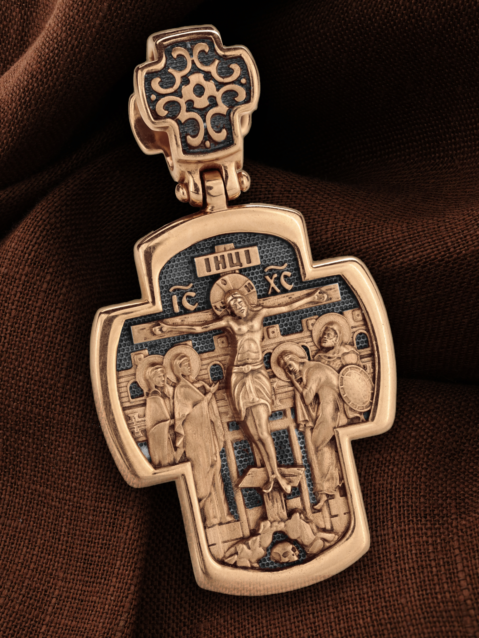На лицевой стороне креста изображено Распятие Господа и Спасителя нашего Иисуса Христа. Своими крестными страданиями Господь смыл наши грехи, покрыл наш долг перед Богом или, на языке Писания, нас «искупил». В Голгофе сокрыта непостижимая тайна бесконечной правды и любви Бога. Крест стал символом победы добра над злом, жизни над смертью, напоминанием бесконечной Божьей любви, предметом радости. Воплотившийся Сын Божий Своею кровью освятил крест и сделал его проводником Своей благодати, источником освящения верующих. На верхней табличке, выше головы Иисуса, расположена надпись, составленная Понтием Пилатом — «IНЦI». Она означает «Иисус Назорей, Царь Иудейский». Ниже перекладины написано сокращенно имя Спасителя «IC» «XC» — Иисус Христос. Крест стоит на горе камней, символизирующих Голгофу. Под подножием Креста изображена покоящаяся голова (череп) Адама. Слева от Распятия стоят оплакивающие Господа Пресвятая Богородица и святая мироносица Мария Клеопова. Справа — апостол и евангелист Иоанн Богослов, один из ближайших учеников Иисуса Христа и сотник Лонгин. По преданию, увидя, что они горько плачут, Иисус сказал Матери Своей: «Жено! Се сын Твой!» Потом сказал ученику Иоанну: «Се мати твоя». С этого времени Иоанн взял Матерь Божию к себе, и Она жила в его доме до самой смерти.
