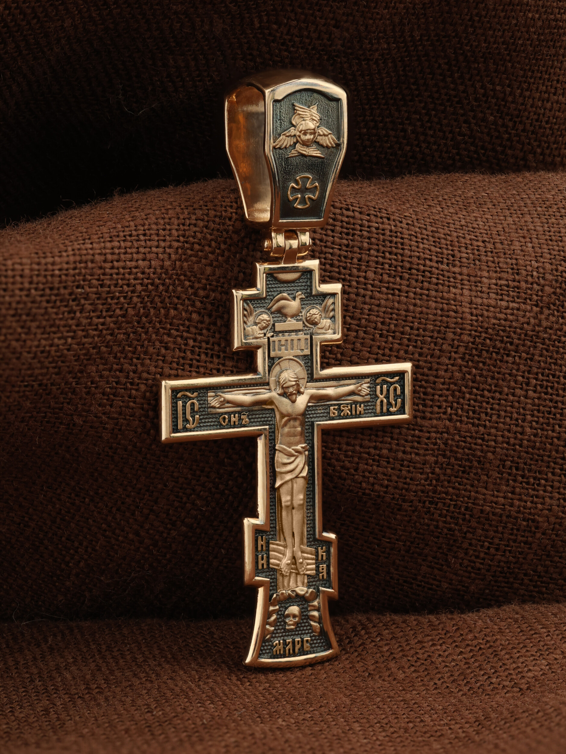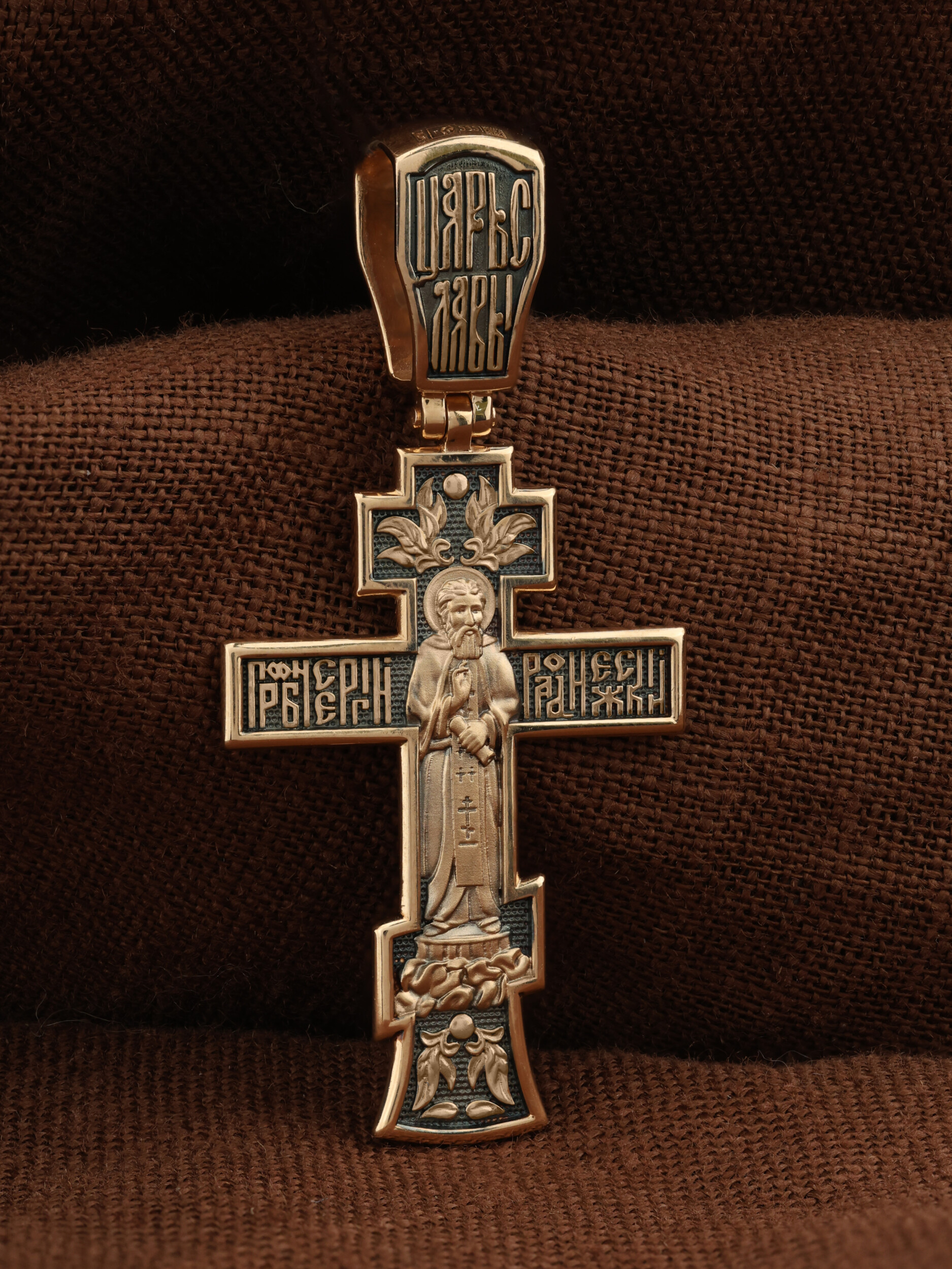 На лицевой стороне этого креста центральную часть занимает икона Распятия Христа — образ жертвы, принесенной Господом за грехи людей. Именно ко Христу, сошедшему на землю ради нашего спасения, возносятся все молитвы. Рядом с Его образом помещены слова — «НИКА» и «Сын Божий». Эти слова характеризуют Господа как Великого Архиерея, победителя смерти. Также Распятие сопровождается надписями, олицетворяющими Христа — это святое имя Христа «IC» (Иисус) «ХС» (Христос). На кулонном кольце написано «Царь Славы».