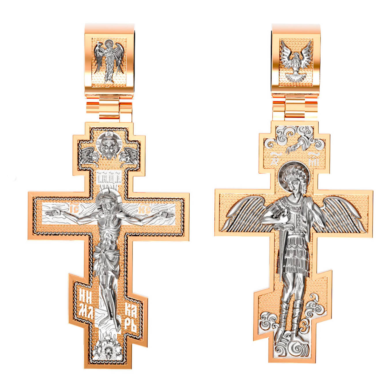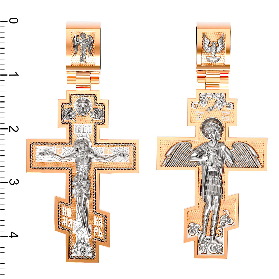 На оборотной стороне креста помещен Архангел Михаил, самый могущественный из ангелов. Это он низверг дьявола и встал во главе ангелов для борьбы с бесовскими силами. Его имя означает «Кто яко Бог?», так как он самый могучий и грозный враг зла. Древнерусские князья и воины стремились обрести покровительство Небесного Воеводы и нередко украшали свои шлемы его крылатой фигурой. На Руси также верили, что Архангел Михаил, как непримиримый враг дьявола, защищает и души умерших от бесовских нападений, провожая их на Небеса. Поэтому ему часто посвящались кладбищенские церкви.
