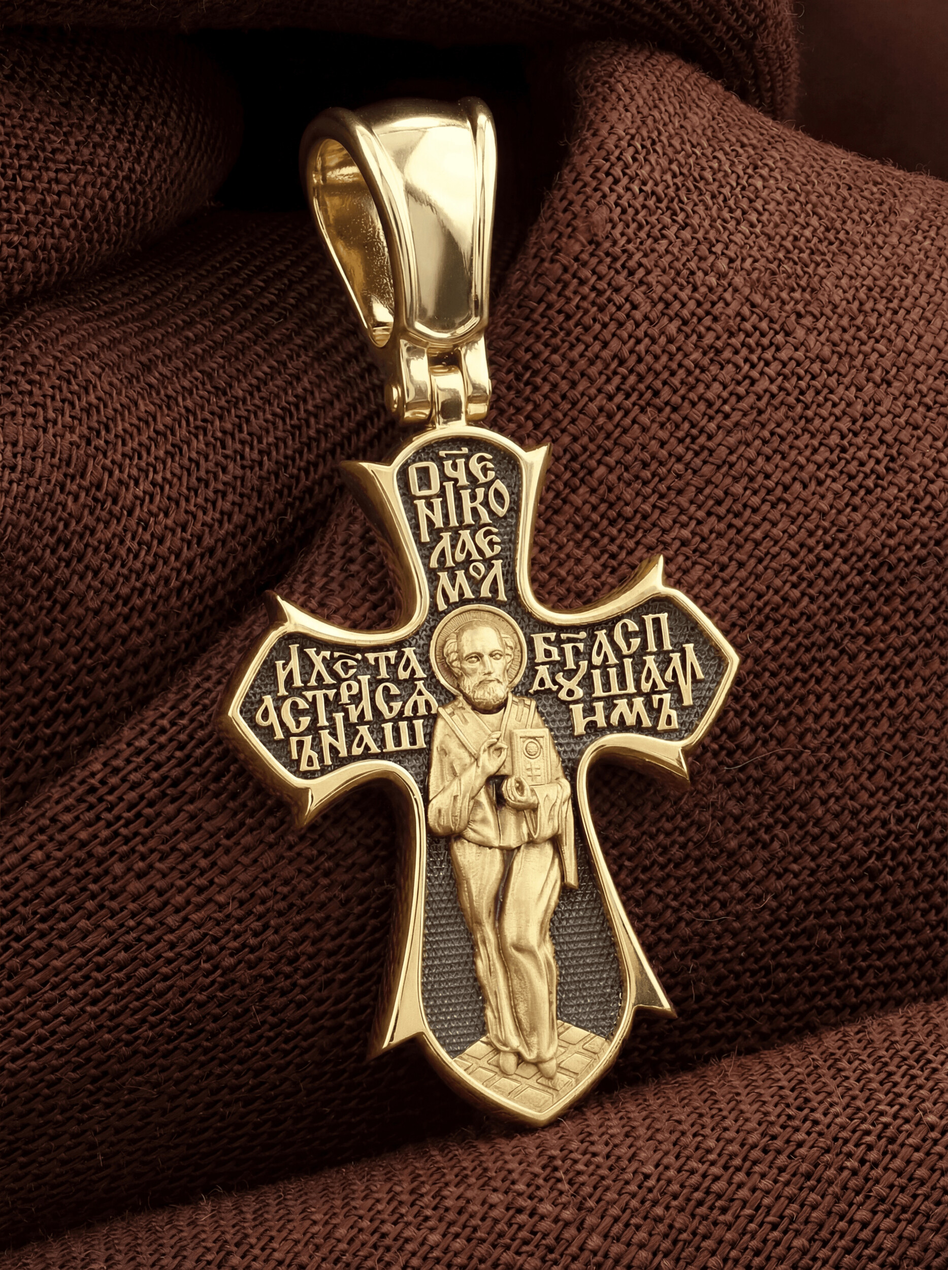 Оборотную сторону креста возглавляет икона Святителя Николая Чудотворца, которого еще называют Николай Угодник за то, что он угодил своей жизнью Богу. Николай Чудотворец, помощник в делах, покровитель учащихся, утешитель обиженных. Также Святитель Николай Чудотворец известен своими молитвами за путешественников, когда непрестанный ветер и бушующие волны утихают и корабль заходит в спокойную гавань. На кресте написана молитва: «Отче Николае, моли Христа Бога спастися душам нашим».