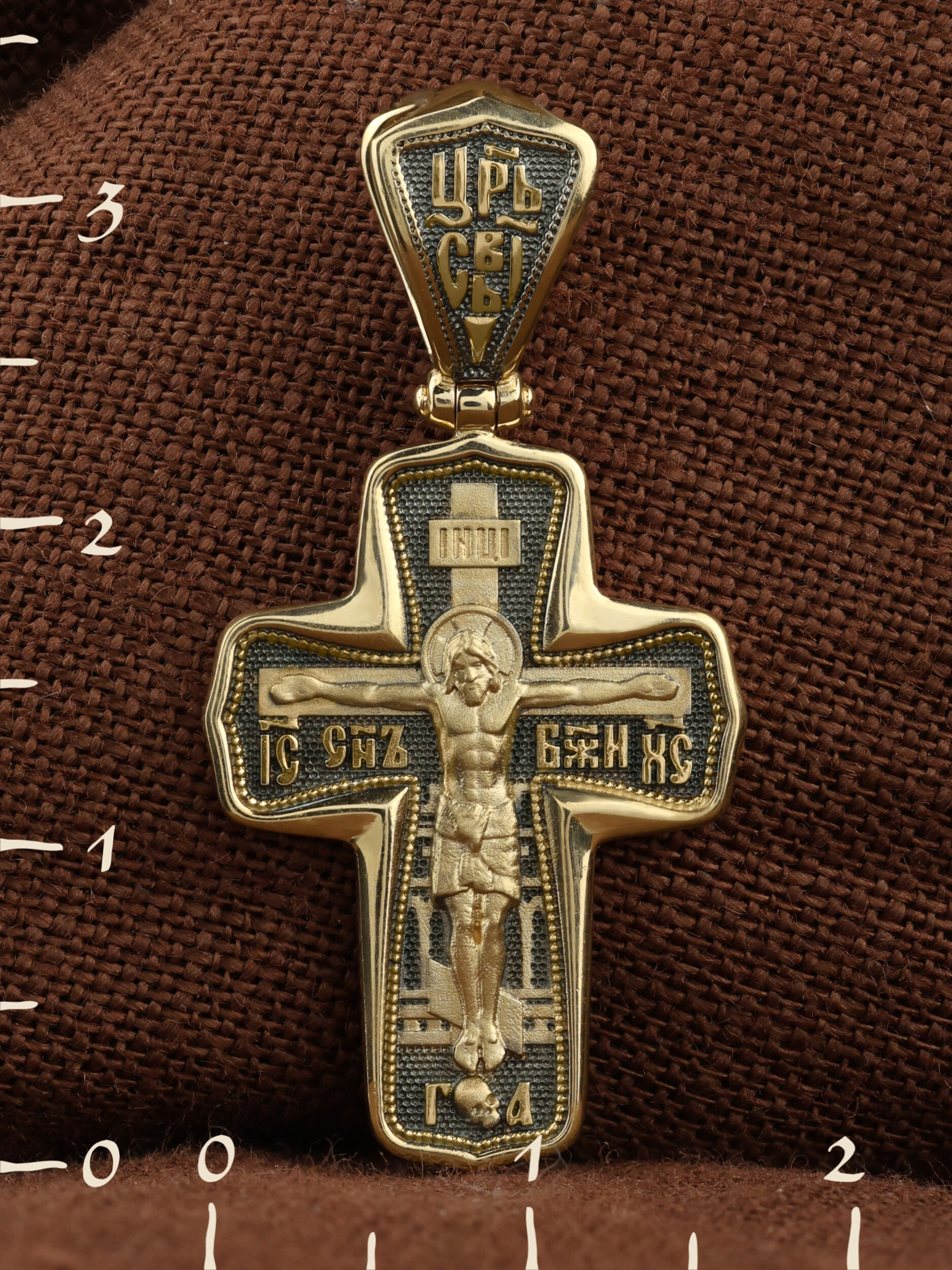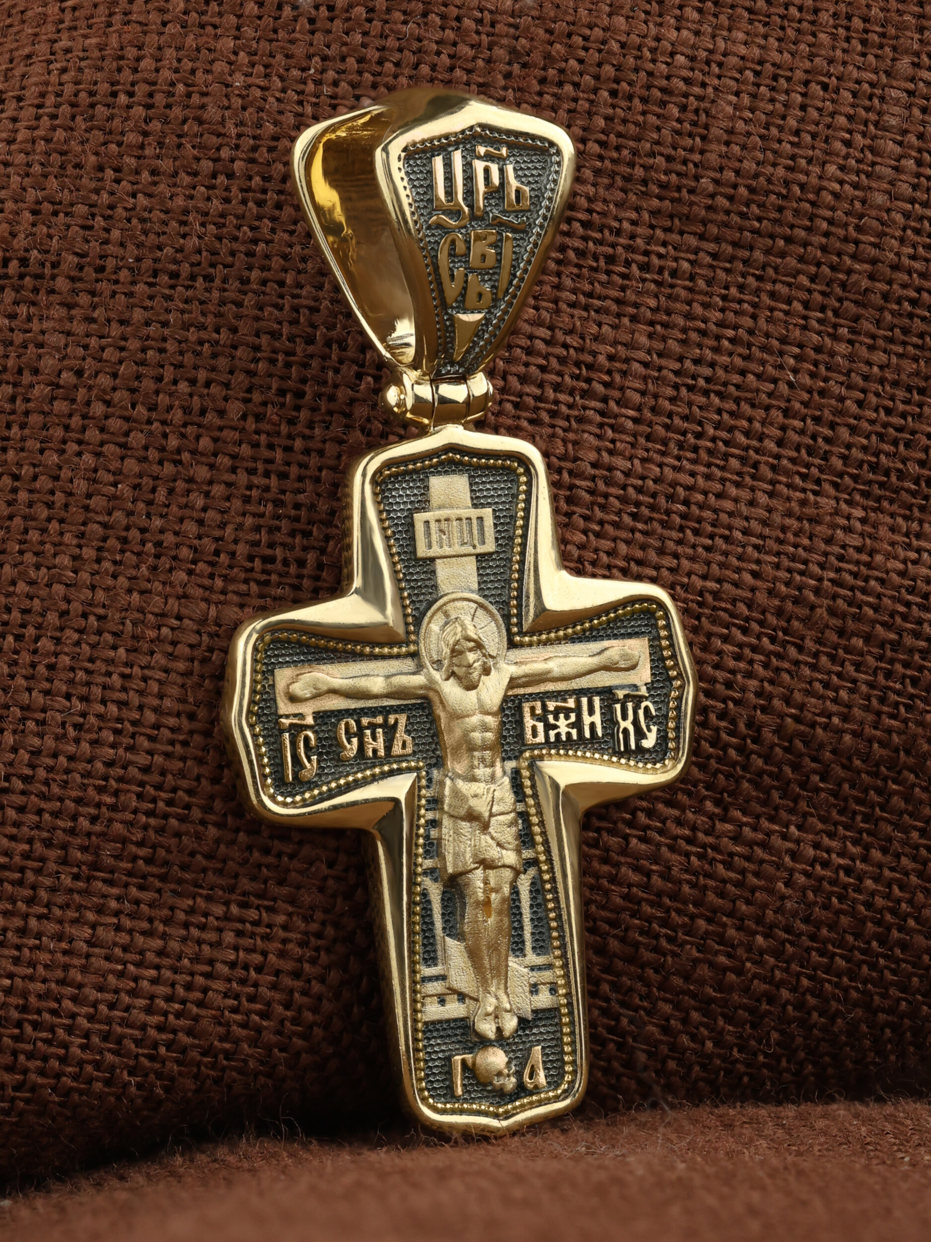 На лицевой стороне креста изображено Распятие Господа и Спасителя нашего Иисуса Христа. Крест- символ спасения и искупления рода человеческого, знамение победы над смертью и адом. Он стал символом восстания из мертвых и обретения вечной жизни в Царствии Иисуса Христа, величайшим символом силы и власти Христовой. Иисус Христос, как искупительная жертва освобождения человечества от власти греха, умер крестной смертью и в третий день воскрес. На верхней табличке, выше головы Иисуса, расположена надпись, составленная Понтием Пилатом — «IНЦI». Она означает «Иисус Назорей, Царь Иудейский». На кулонном кольце помещена надпись «Царь Славы». Надпись «IС» « ХС» означает Иисус Христос и помещается на разных сторонах поперечной перекладины креста. Рядом расположена надпись «Сын Божий». За крестом высится Иерусалимская стена. Ниже подножия креста различается череп и надпись «Г.А» — это глава Адамова. На православном кресте Христос не умирает, а свободно простирает руки, ладони Иисуса открыты, будто он хочет обнять все человечество, даря им свою любовь и открывая путь к вечной жизни.