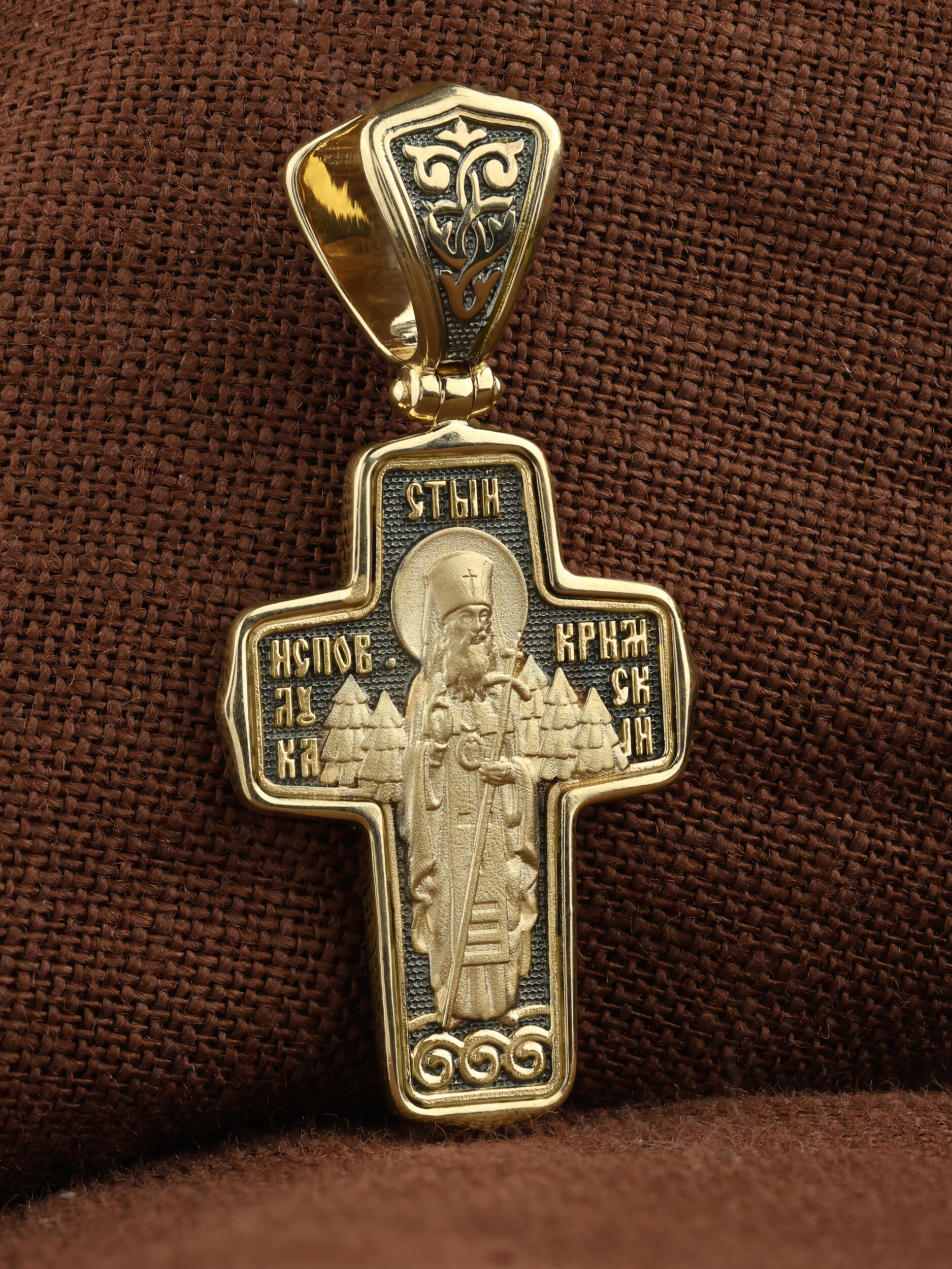 На оборотной стороне Креста помещен образ святителя Луки (Войно-Ясенецкого), архиепископа Симферопольского и Крымского, исповедника (1877–1961). Архиепископ Лука — русский святитель, исповедник, духовный писатель, доктор богословия, а также выдающийся ученый, автор трудов по анестезиологии, профессор хирургии, доктор медицинских наук, лауреат Сталинской премии. Он исповедовал веру Христову в гонениях, тюрьмах, лагерях и ссылке, пережил поношения и пытки, но остался верен Господу. Привел к православной вере тысячи и тысячи людей. Его почитание растет во всем православном мире. Неисчислимо количество свидетельств о чудесной помощи по молитвам к Святителю Луке. Архиепископ Лука советовал: «Главное в жизни — всегда делать людям добро. Если не можешь делать для людей добро большое, постарайся совершить хотя бы малое».
