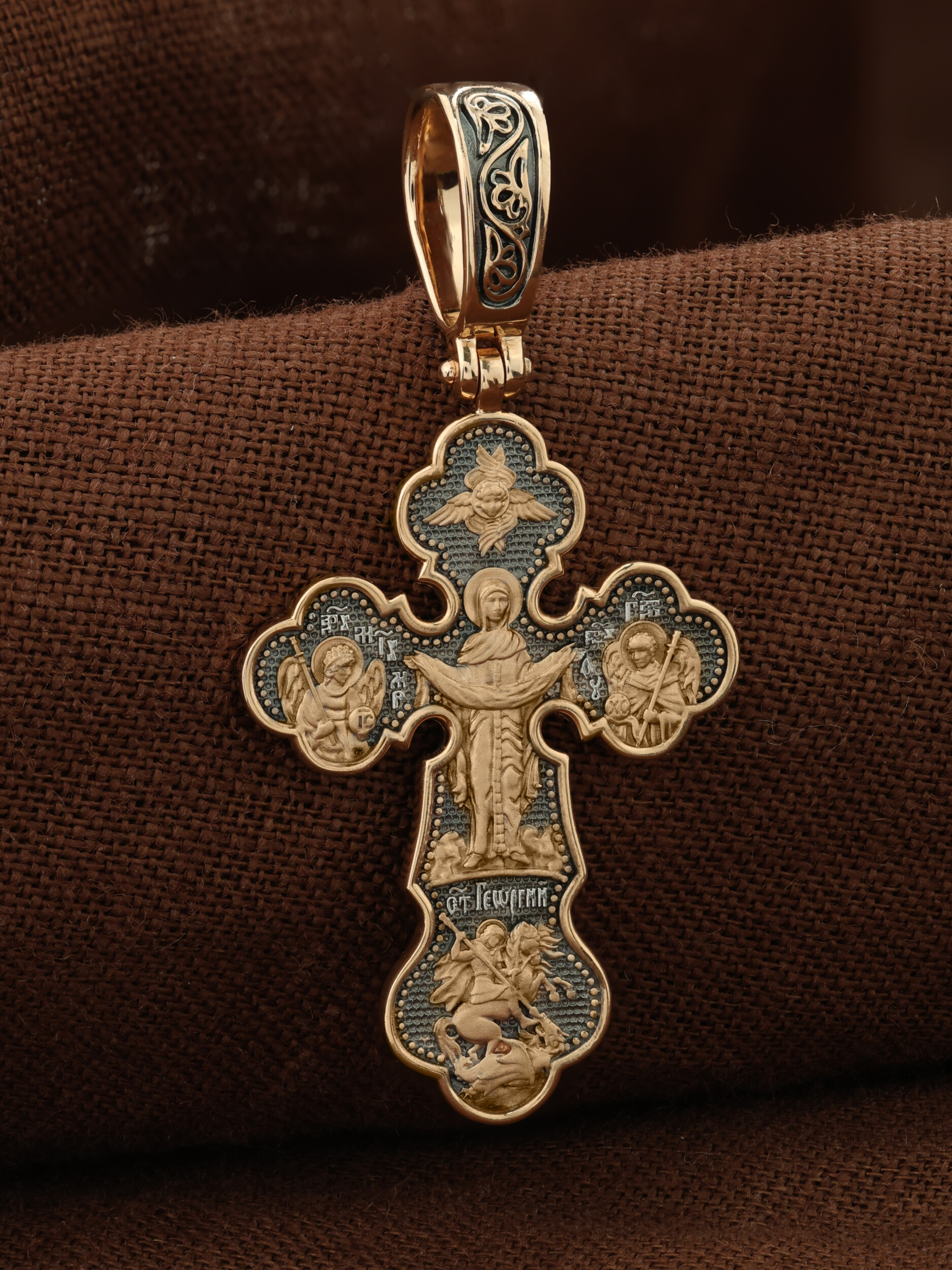 Центральную часть оборотной стороны креста украшает икона Божией Матери «Покров Пресвятой Богородицы». Праздник Покрова Пресвятой Богородицы пришел на Русь в XII веке из Византии и стал одним из самых почитаемых. Пресвятая Богородица простирает Свой молитвенный покров над всеми православными христианами и умоляет Сына своего о даровании вечного спасения каждому человеку. Над образом помещен шестикрылый Серафим. Справа помещено изображение Архангела Гавриила, слева- Архангела Михаила. На кресте внизу помещено изображение Святого Великомученика Георгия Победоносца — одного из самых почитаемых и удивительных святых. Он изображен как воитель, сидящий на вздыбленном коне и поражающий копьем огнедышащего змея. Змей символизирует собою сатанинские силы.