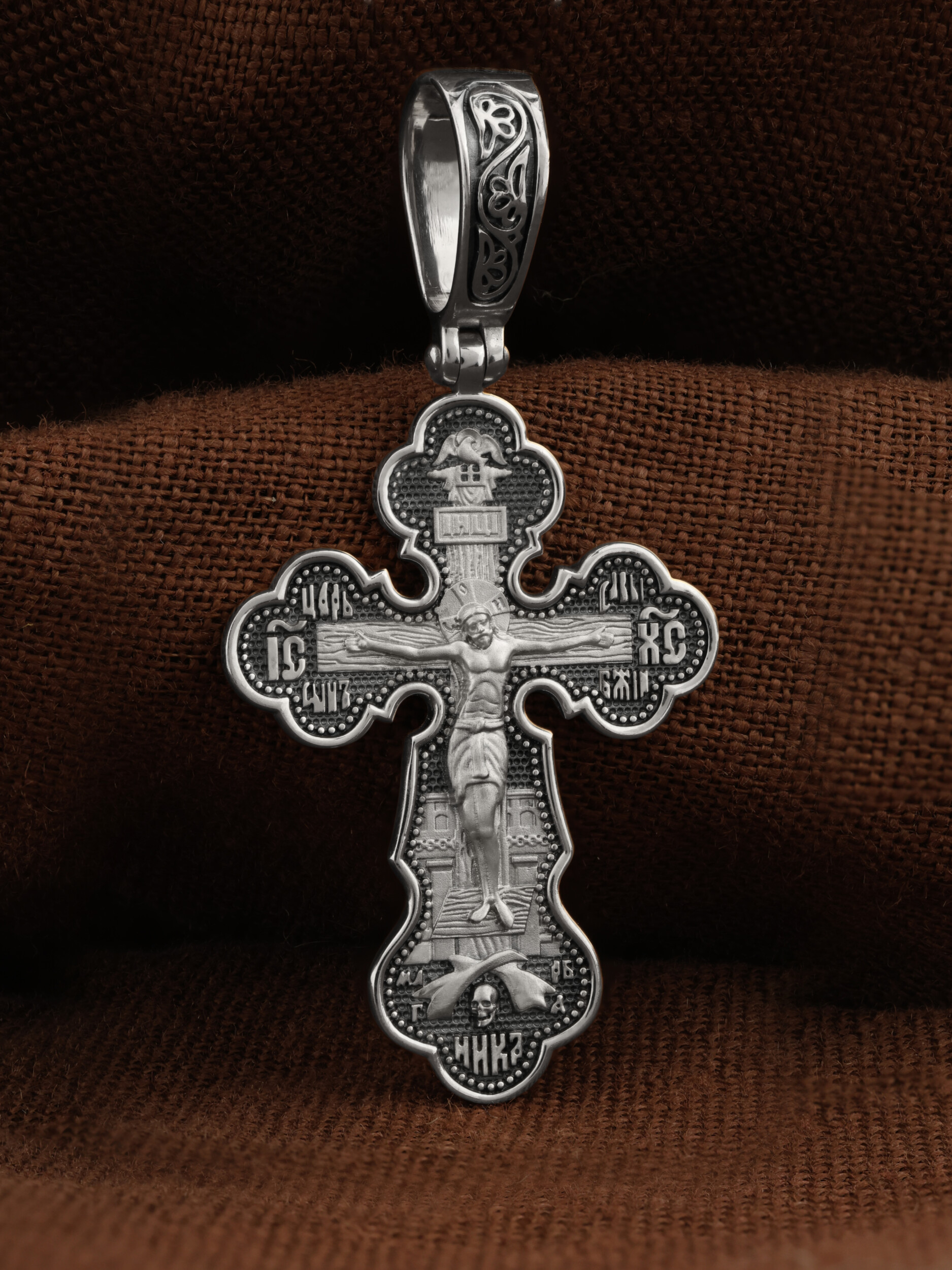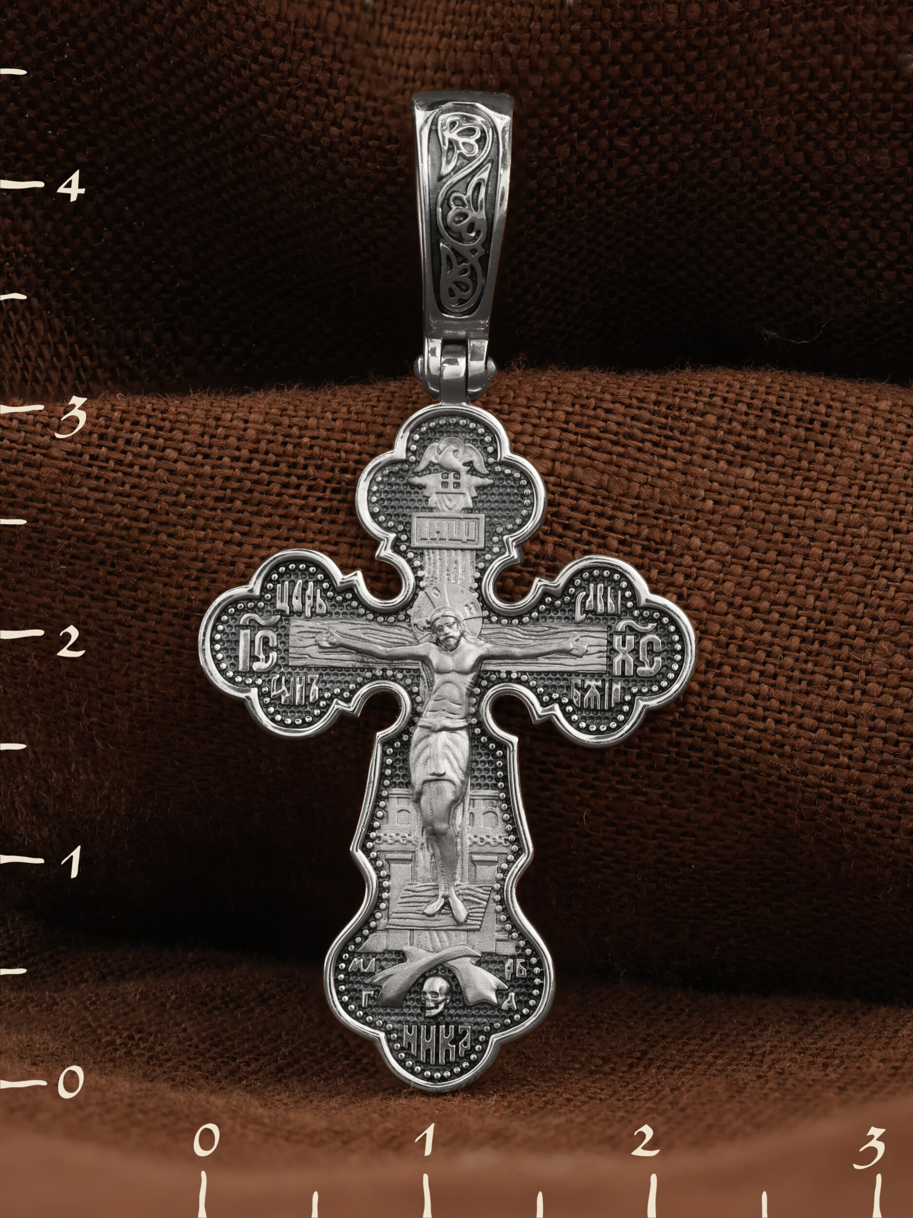 На лицевой стороне креста изображено Распятие Господа и Спасителя нашего Иисуса Христа. Христос, подвергнутый на кресте мучительной казни, своими страданиями искупил нас от древнего греха и даровал нам жизнь вечную. На верхней табличке, выше головы Иисуса, расположена надпись, составленная Понтием Пилатом — «IНЦI». Она означает «Иисус Назорей, Царь Иудейский». Распятие сопровождается каноническими надписями. Надпись «IС ХС» означает Иисус Христос, надпись «Царь Славы» и словосочетание «СЫН БОЖИЙ», что означает божественную природу Иисуса Христа, помещаются на разных сторонах поперечной перекладины креста. В нижней части креста находятся надписи –«НИКА» и «МЛРБ». В переводе с греческого, слово «НИКА» означает «победитель». Именно оно является символом победы Христа над смертью. Надпись «МЛРБ» — «место лобное рай бысть» означает, что место лобное стало раем. Крест стоит на горе камней, символизирующих Голгофу. Под подножием Креста изображена покоящаяся голова (череп) Адама и надпись «Г.А.». Христос в Своей Божественной любви, над которой смерть не властна и которая, страдая, и не страдает в обычном смысле, простирает к людям со Креста Свои объятия, в которые призывается и привлекается весь мир. Поэтому Тело Его не висит, а торжественно покоится на Кресте.