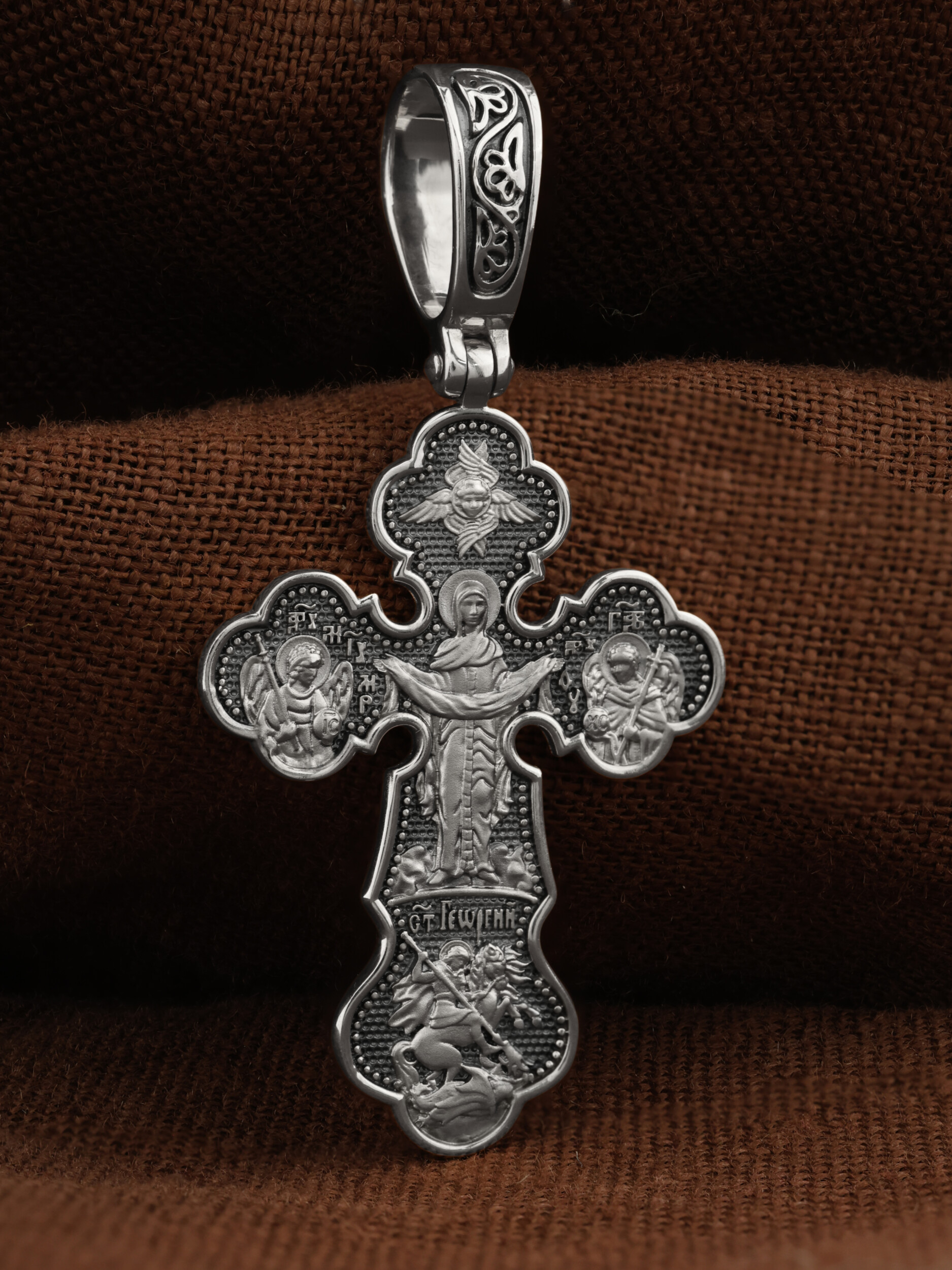 Центральную часть оборотной стороны креста украшает икона Божией Матери «Покров Пресвятой Богородицы». Праздник Покрова Пресвятой Богородицы пришел на Русь в XII веке из Византии и стал одним из самых почитаемых. Пресвятая Богородица простирает Свой молитвенный покров над всеми православными христианами и умоляет Сына своего о даровании вечного спасения каждому человеку. Над образом помещен шестикрылый Серафим. Справа помещено изображение Архангела Гавриила, слева- Архангела Михаила. На кресте внизу помещено изображение Святого Великомученика Георгия Победоносца — одного из самых почитаемых и удивительных святых. Он изображен как воитель, сидящий на вздыбленном коне и поражающий копьем огнедышащего змея. Змей символизирует собою сатанинские силы.