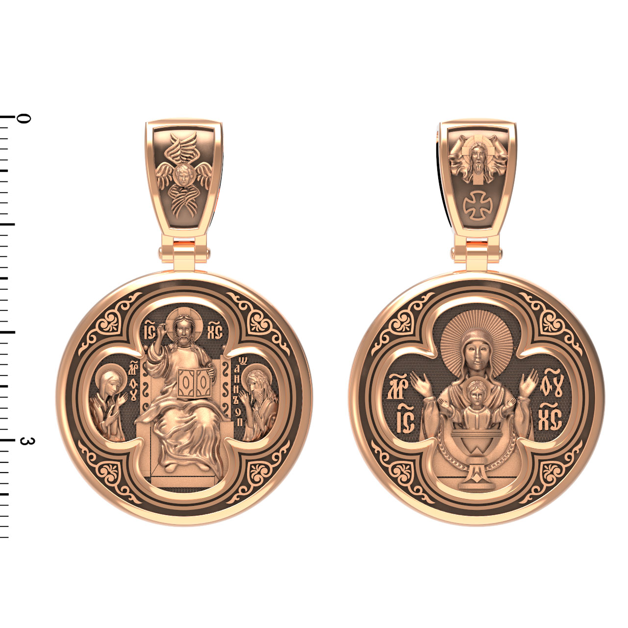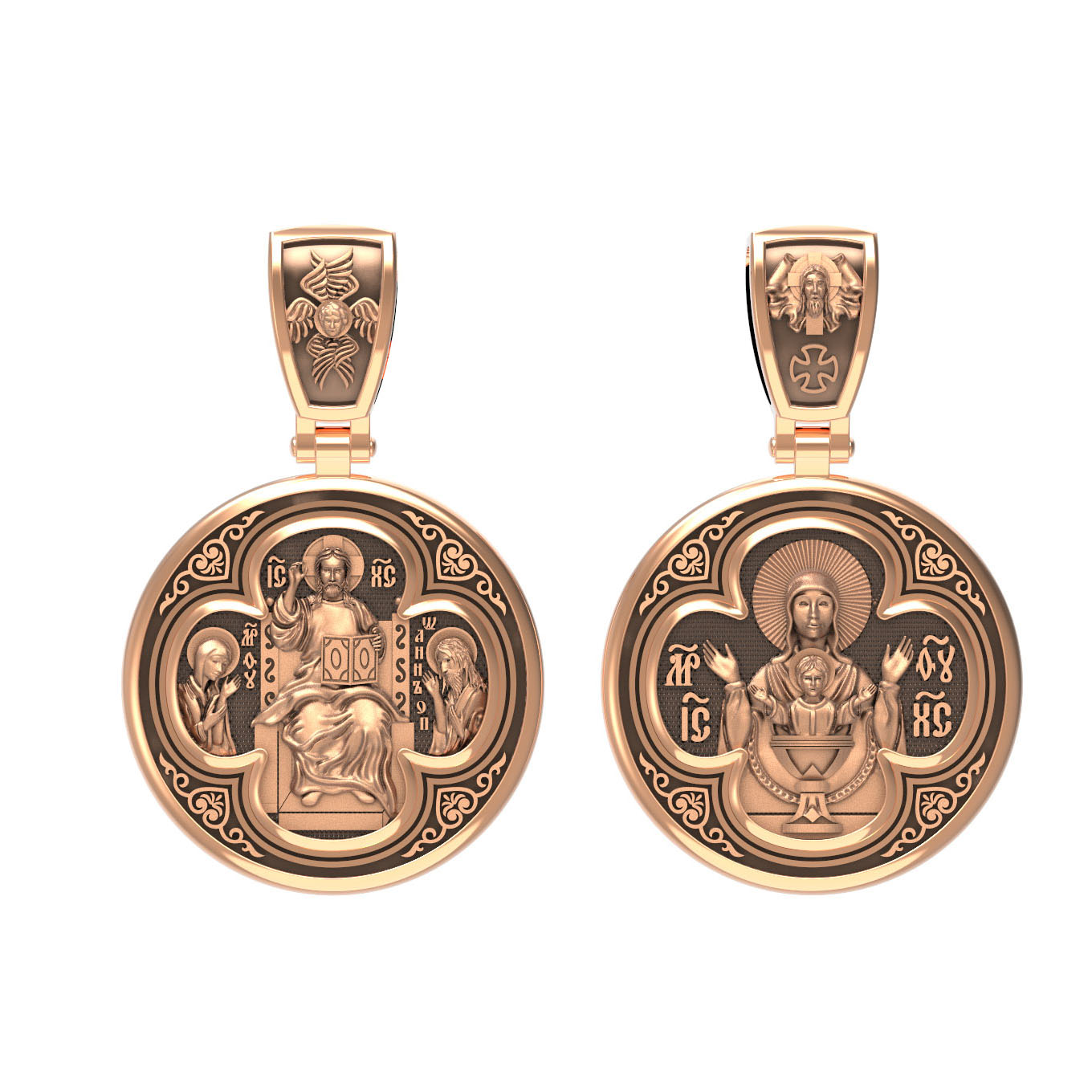 На лицевой стороне образка изображена икона Иисуса Христа Деисус. Он представлен в образе Господа Вседержителя, восседающего на престоле. В его руках — Книга Судеб всего человечества. С двух сторон ему предстоят Пресвятая Богородица и пророк Иоанн Предтеча, Креститель Господень.