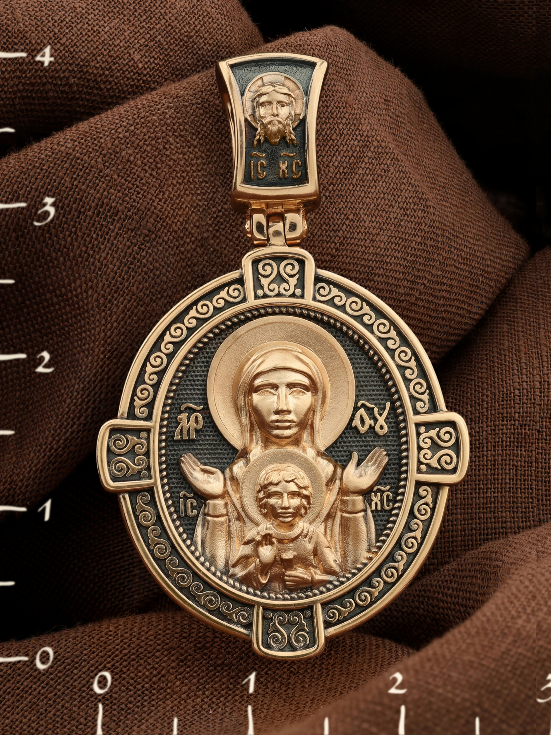 В центр образка помещен образ Божией Матери «Знамение», прославившийся многими чудесами в Новгороде в XII веке. Икона эта чтится как одна из самых великих святынь Русской земли. Молитвенно воздетые руки Богородицы означают заступничество за людей пред Богом. Рядом с Ней — благословляющий Божественный Младенец — Спас-Эммануил.