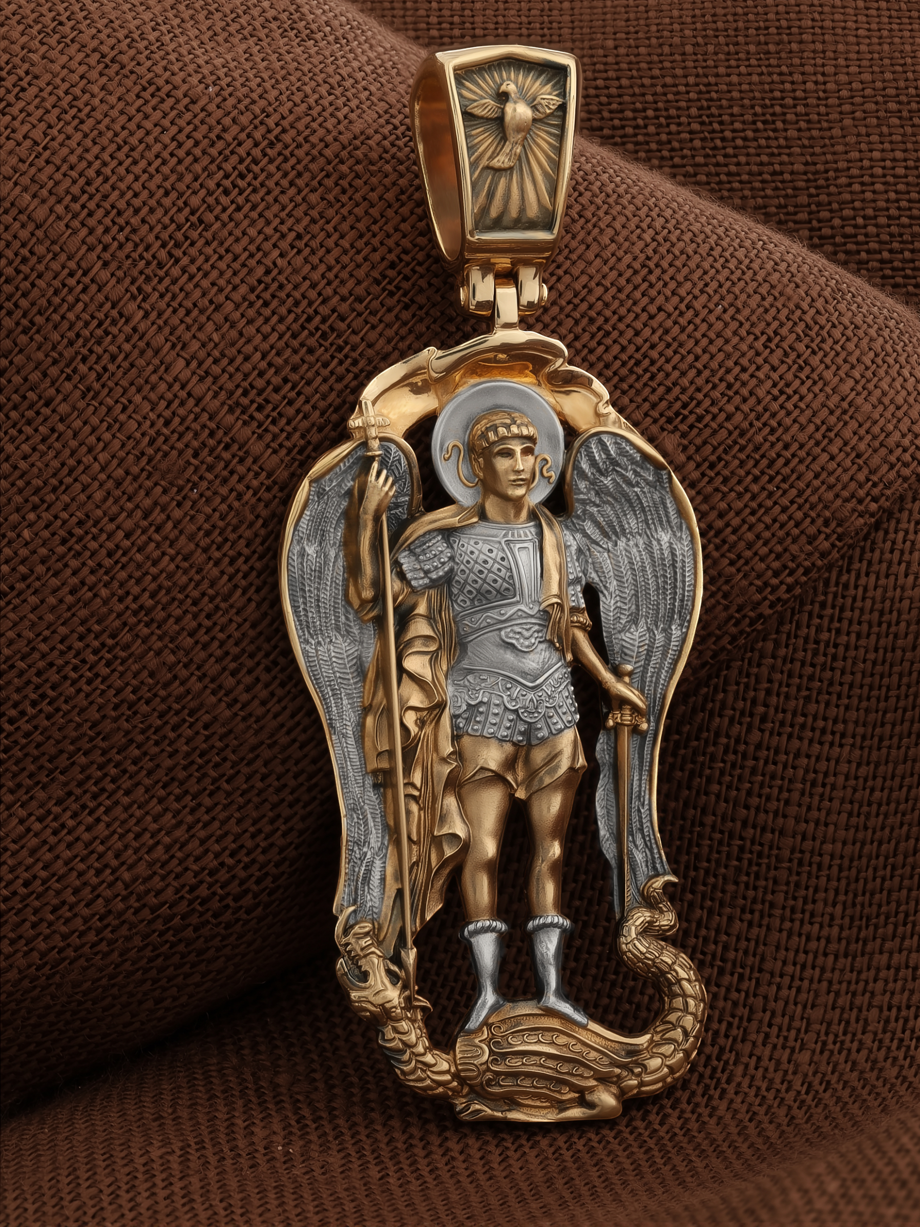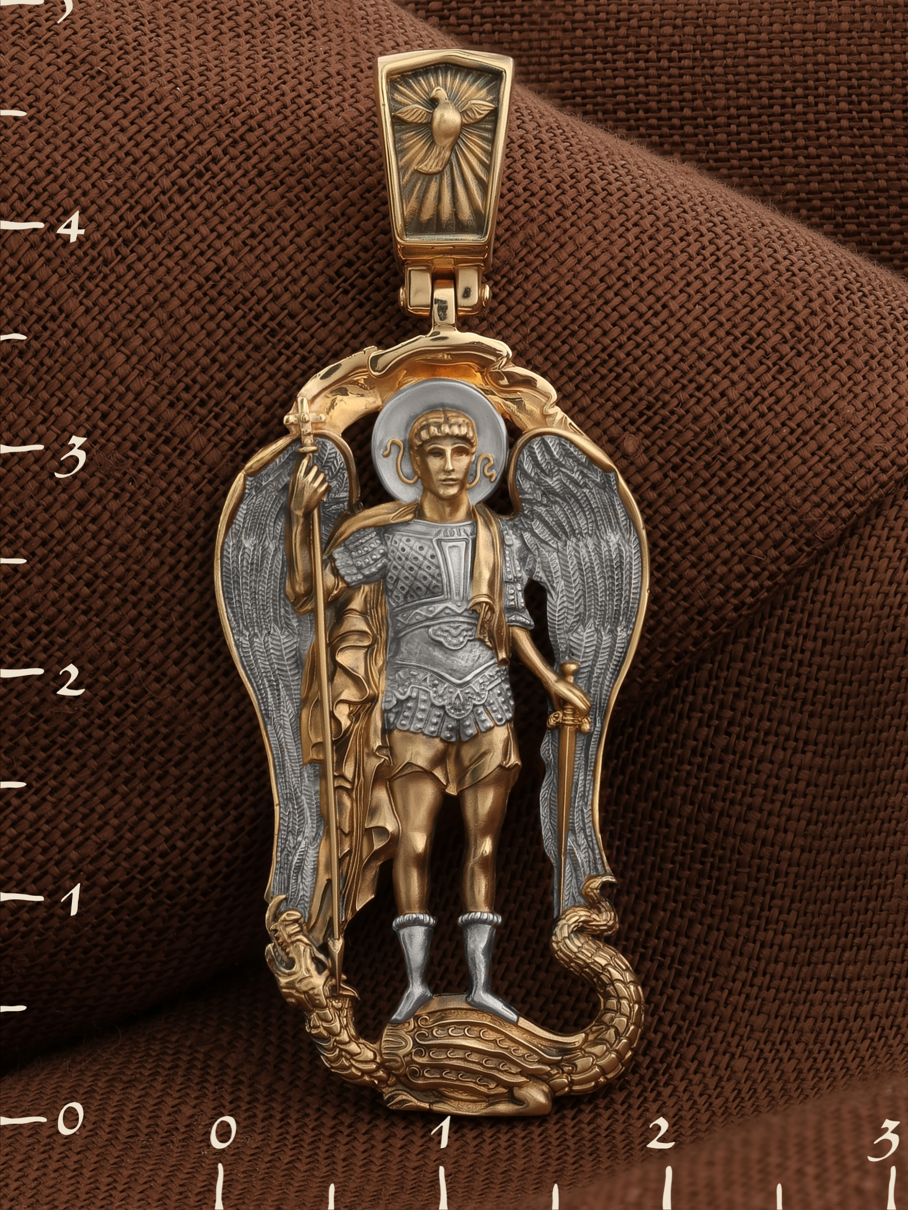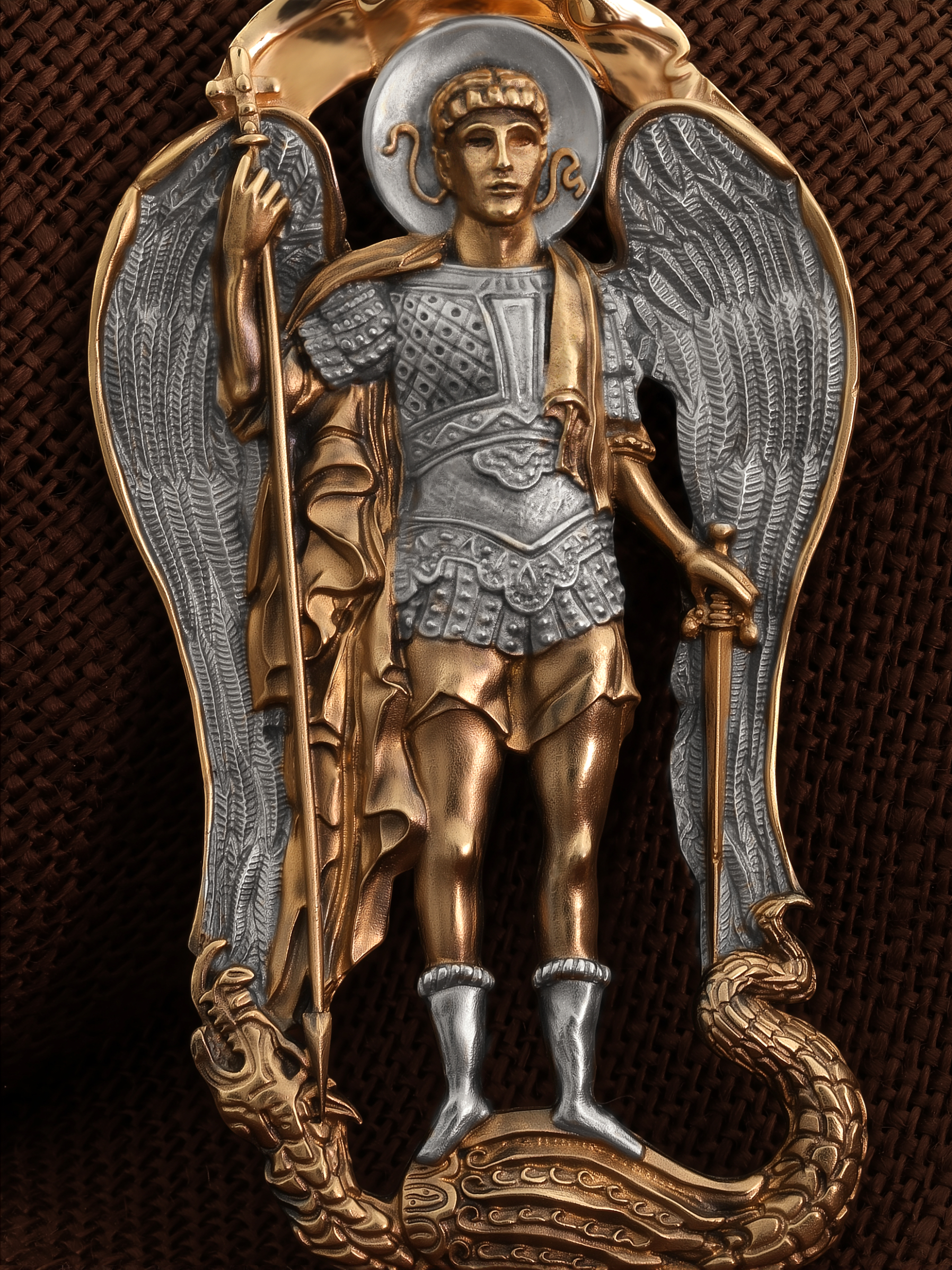 Архангел Михаил первым ополчился на архангела Денницу, когда тот восстал против Бога и низверг его с Неба. В книге «Апокалипсис» апостол Иоанн Богослов рассказывает, что Архангел Михаил — предвечный вождь в войне против дракона-диавола и восставших вместе с ним на Бога ангелов тьмы. «И произошла война на Небе: Михаил и ангелы его воевали против дракона, и дракон, и ангелы его воевали против них, но не устояли, и не нашлось им места на Небе. И низвержен был великий дракон, древний змий, называемый диаволом и сатаною». На иконах дьявол часто изображается в виде змея или дракона. Михаил побивает его и связывает, сокрушая на дно ада. Архангел Михаил на таких иконах изображается в виде воина, в доспехах и с огненным мечом. За спиной у него большие крылья, у висков вьются тороки (или слухи) — ленточки, символизирующие чуткий слух и внимание к Богу. Над головой развевается стяг, потому что Архангел Михаил — «знаменосец Христа».