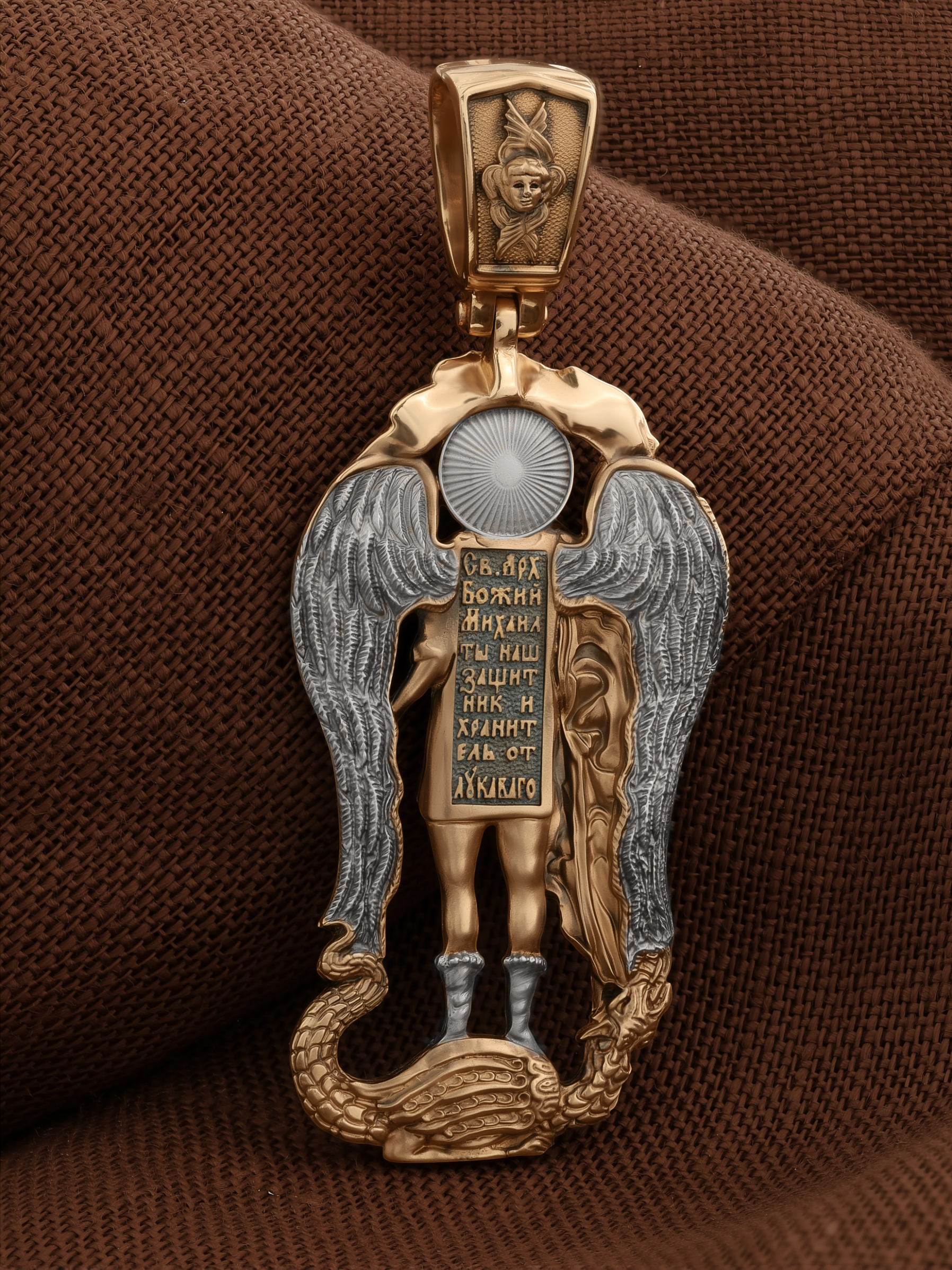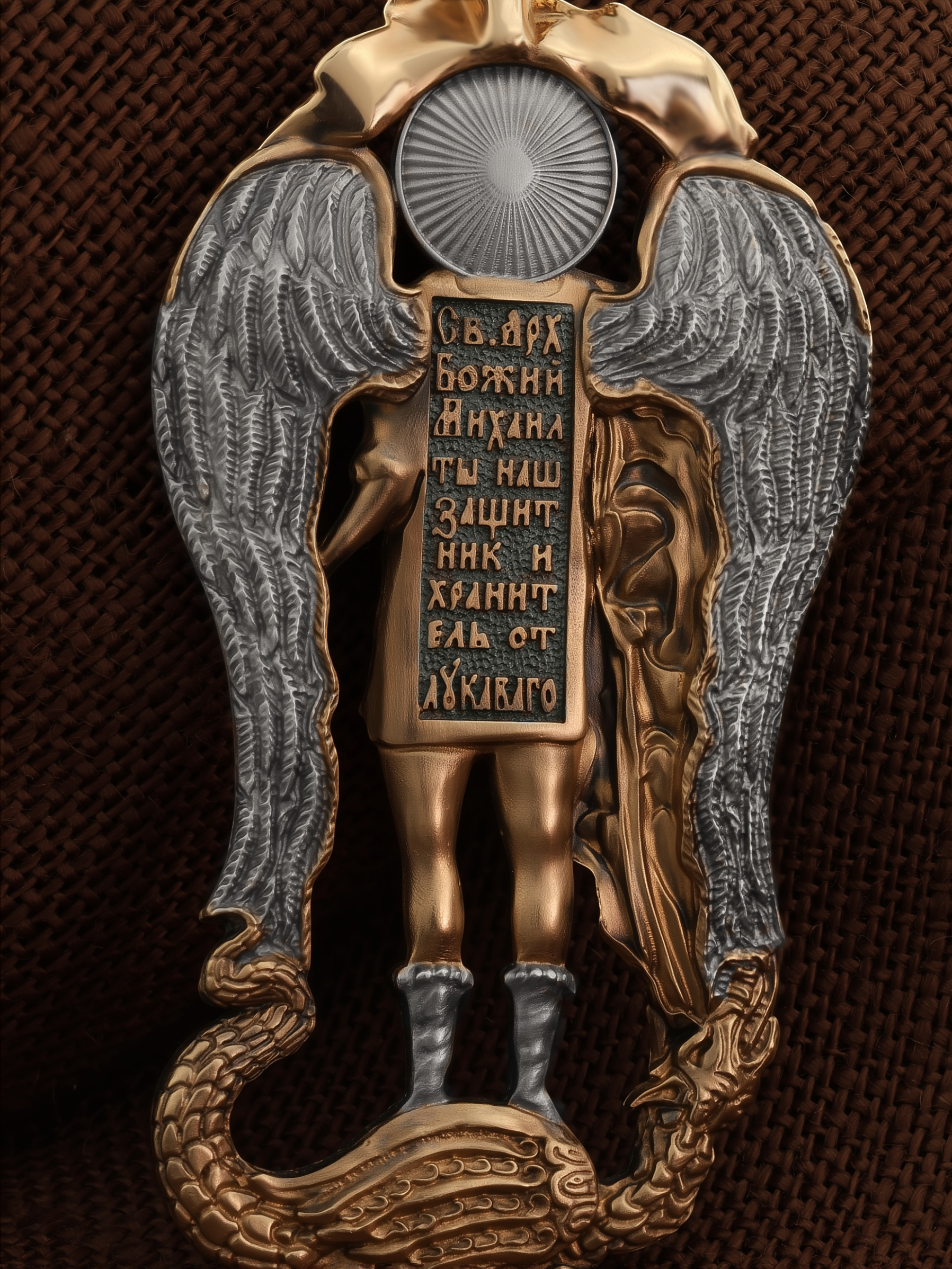 На обороте образка написана молитва Архангелу Михаилу: «Святой Архангел Божий Михаил! Ты наш защитник и хранитель от лукавого.»