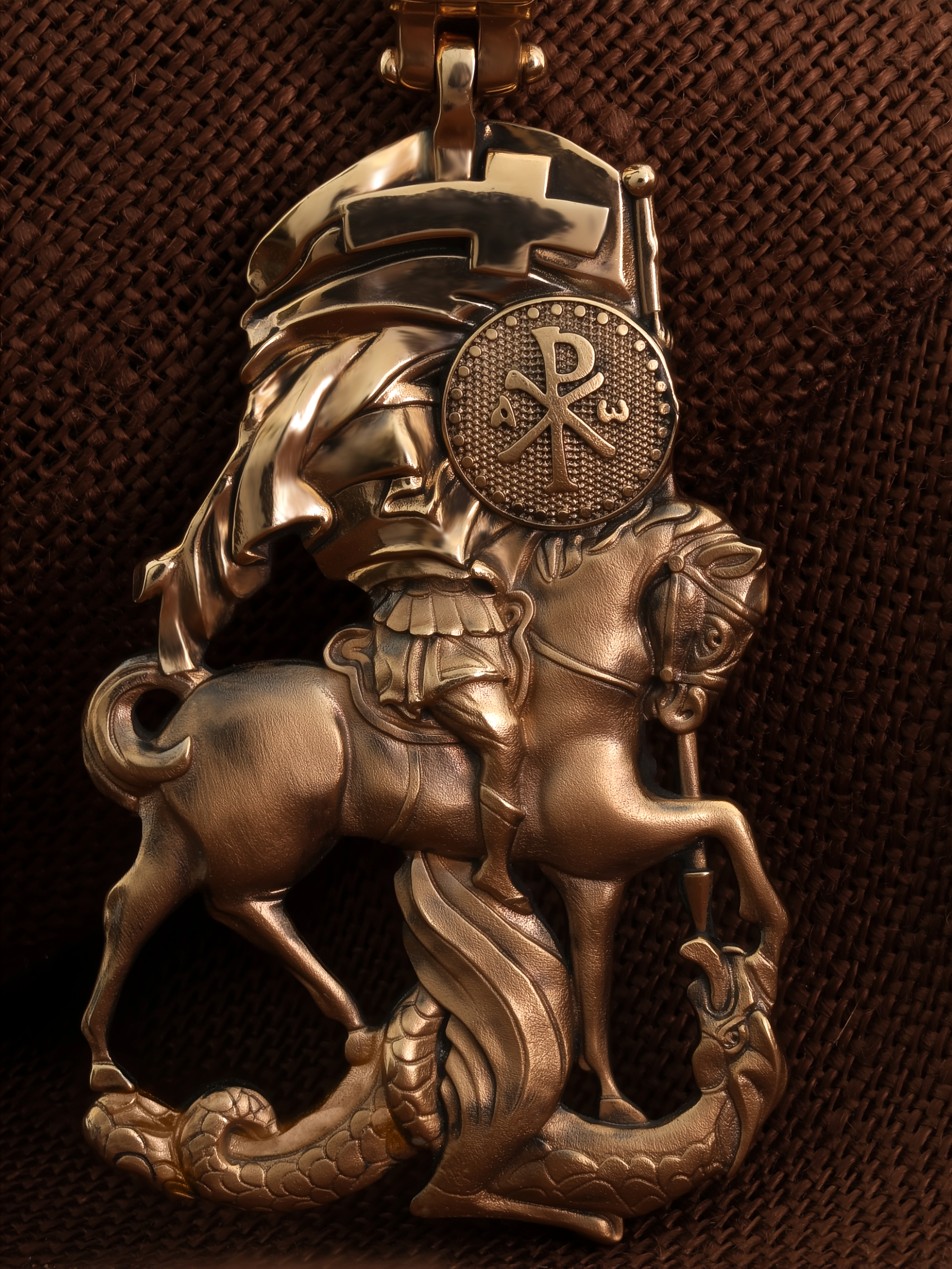 Основой композиции образка является изображение Святого Великомученика Георгия Победоносца — одного из самых почитаемых и удивительных святых. Георгий родился в Каппадокии (Малая Азия) в семье богатых и знатных горожан. Юношей поступил на службу к римскому императору Диоклетиану, за отличное знание военного дела и проявленную в боях и походах храбрость был приближен к императору и удостоен высокого воинского звания. Во время начавшихся гонений на христиан, перешел на сторону гонимых и, отвергнув человеческий страх, стал ярым проповедником учения Христа. Мучители подвергли опального воеводу жесточайшим восьмидневным пыткам и казнили его (обезглавили) в возрасте около тридцати лет в 303 году. На Руси он известен как Юрий или Егорий, заступник для верующих, чья жизнь имеет какое-либо отношение к военным делам, помощник в крестьянском труде. Образок сделан в виде воинского щита. На нем Георгий изображен как воитель, сидящий на вздыбленном коне и поражающий копьем огнедышащего змея. Справа над образом изображена благословляющая Божия десница. Змей символизирует собою сатанинские силы. Молитвами вознесенными к Всевышнему и своей непреклонной верой он смог одолеть чудовище. Святой убил змея, спас царскую дочь, принесенную в жертву, и жителей города, их души от влияния дьявола, породив в них надежду и веру в Господа, призывая людей принять христианскую веру. На оборотной стороне образка написана молитва: «Мучениче Георгие, моли Бога о мне».