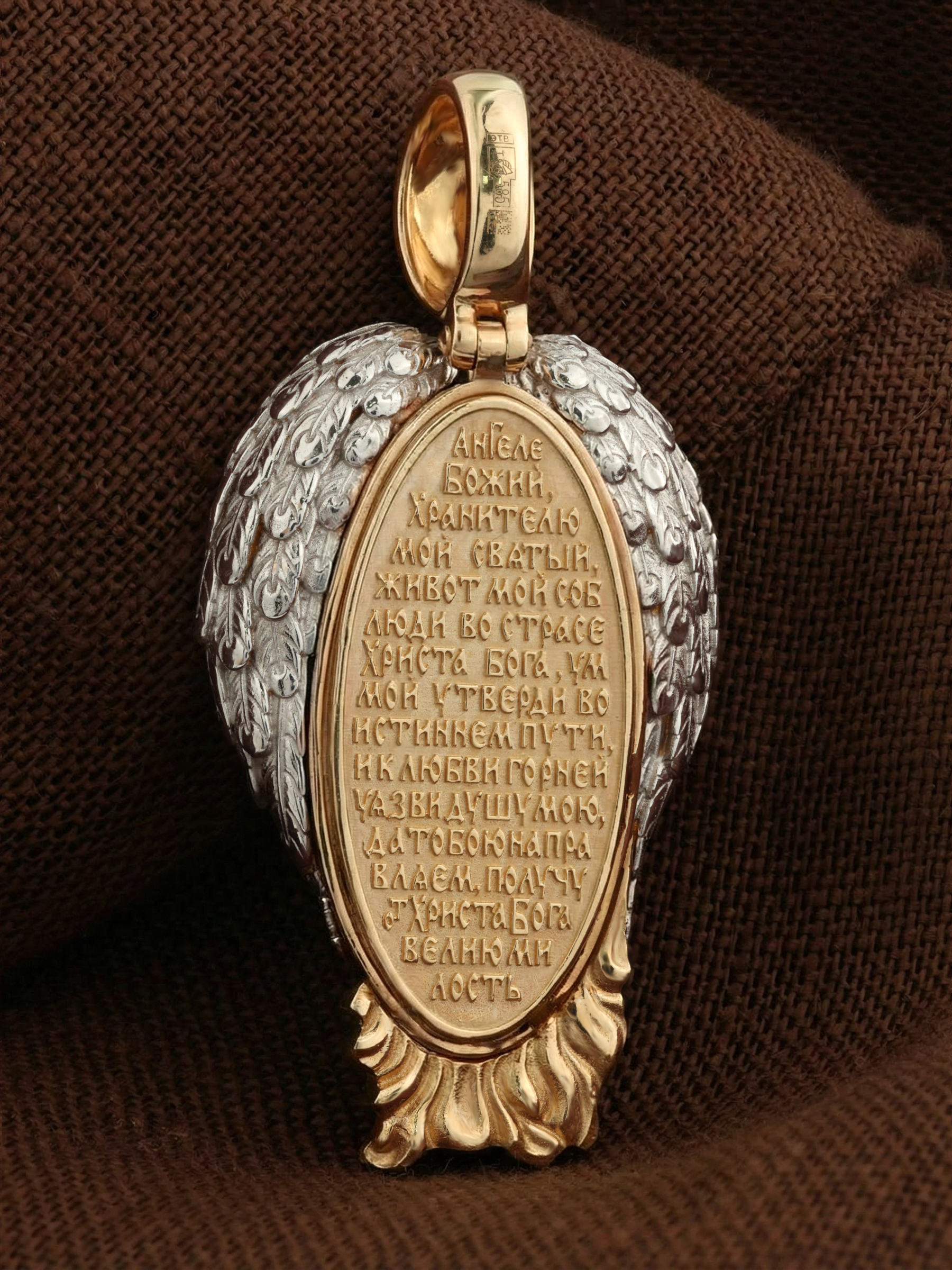 На оборотной стороне размещена молитва: «Ангеле Божий, хранителю мой святый, живот мой соблюди во страсе Христа Бога, ум мой утверди во истиннем пути, и к любви горней уязви душу мою, да тобою направляем, получу от Христа Бога велию милость».
