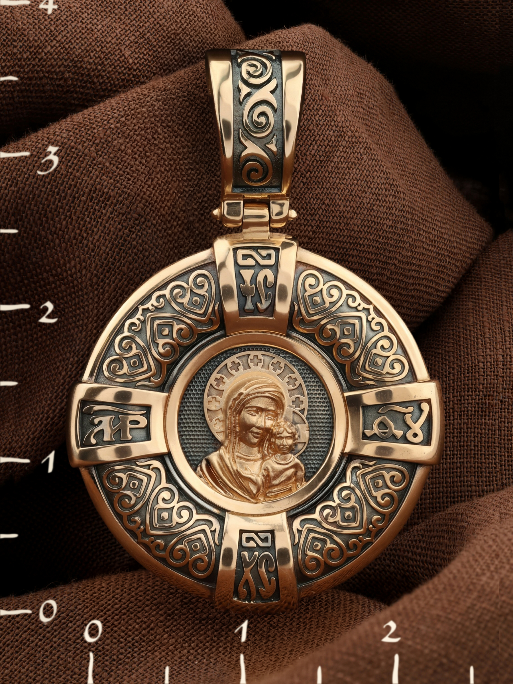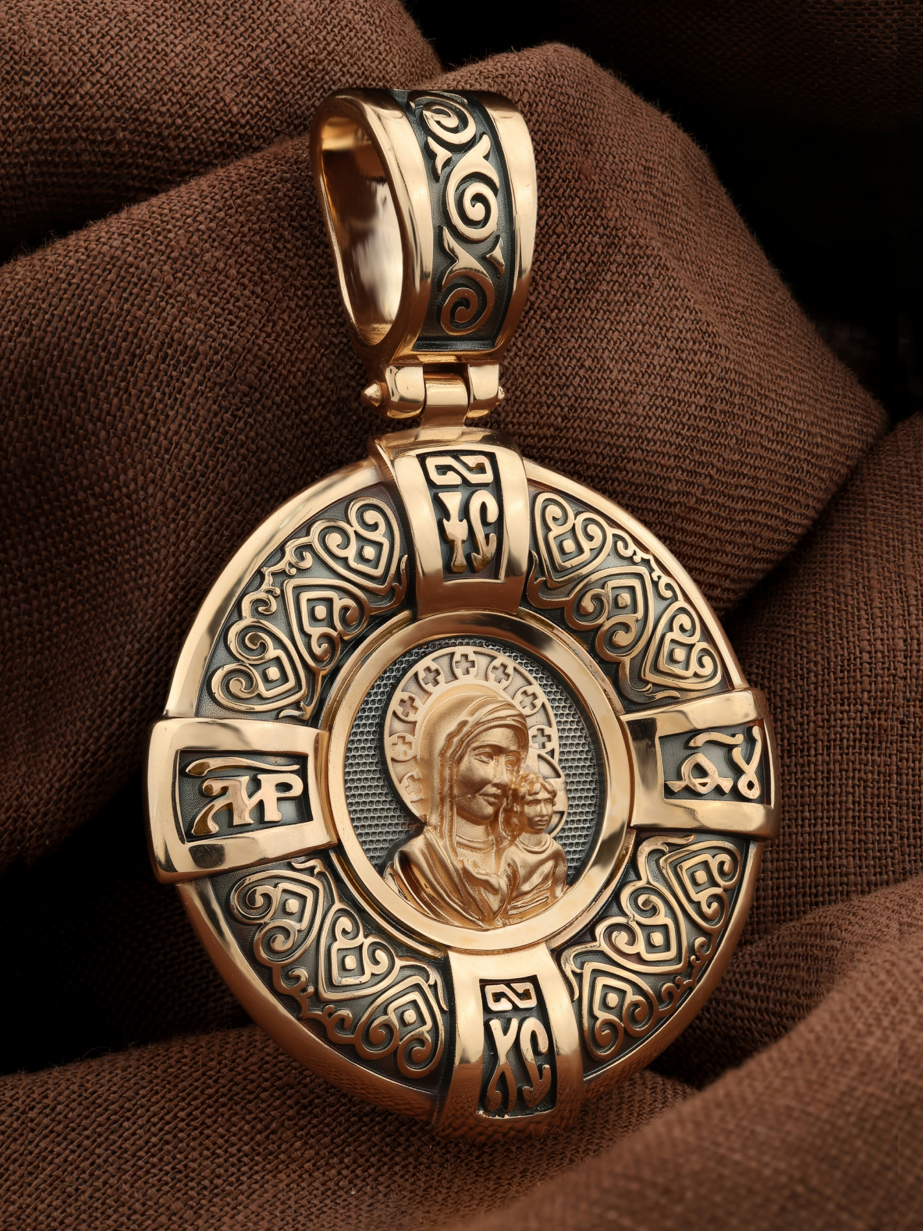 На лицевой части образка изображена Казанская икона Пресвятой Богородицы — одна из самых почитаемых в России чудотворных икон Богородицы. Богословское значение Казанской иконы — указать верующим истинный Путь к спасению, который лежит через Христа. Только Божия Матерь имеет настолько сильное дерзновение к Спасителю, что может ходатайствовать перед Ним за всех верных. Именно этот образ дарится новой повенчанной паре, как хранитель очага и семейная реликвия. Молитва перед Казанской иконой Божьей Матери помогает во всех сложных случаях жизни, в болезнях, во всех печалях, невзгодах, скорбях. Уникальная история появления, чудеса, случившиеся по молитвам православных людей возле образа — все это делает Казанскую Богородицу особенной, среди тысяч других икон.