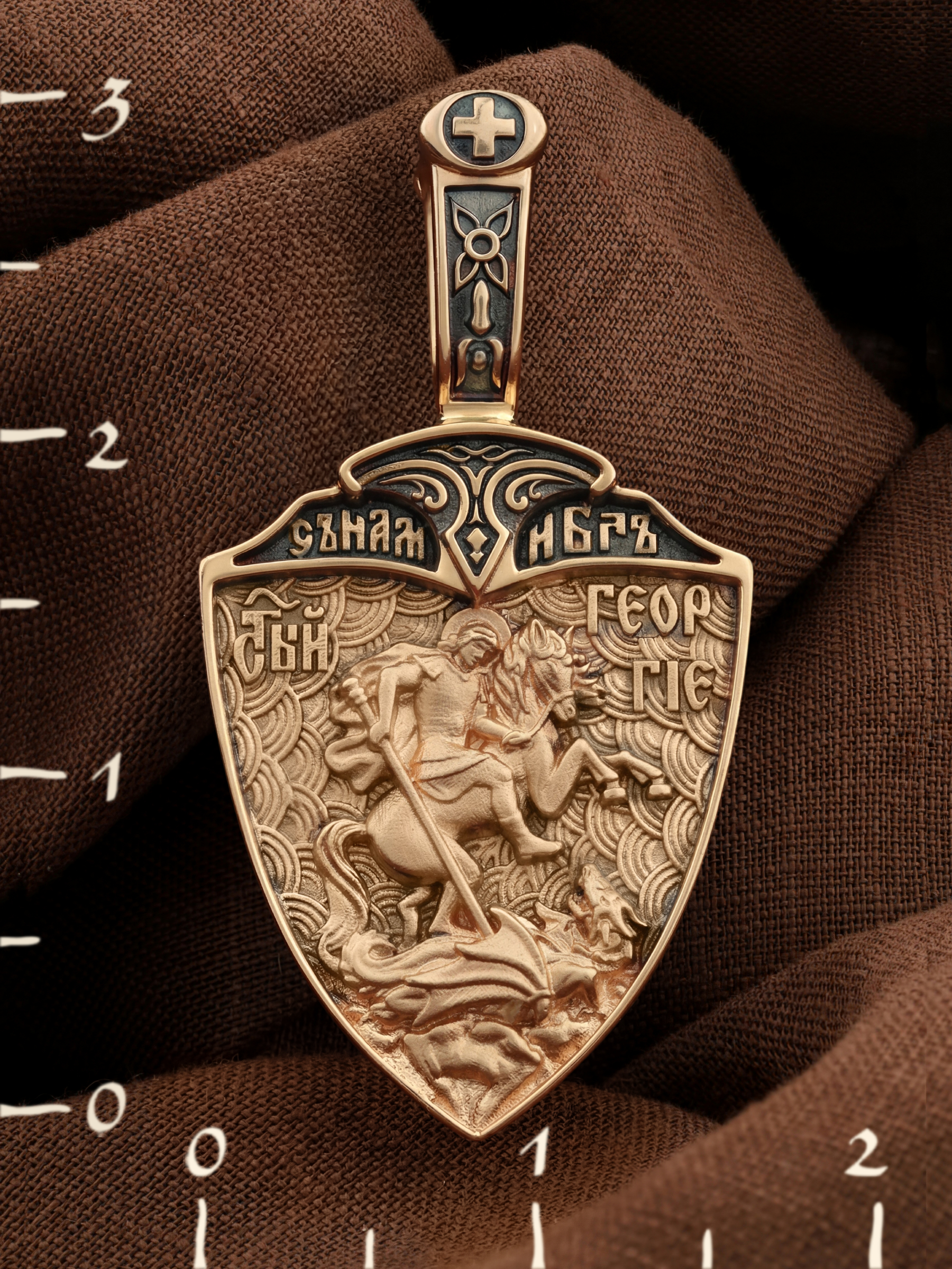 Основой композиции оборотной стороны является изображение Святого Георгия Победоносца. Святой Георгий один из наиболее почитаемых святых в Христианской Церкви. На Руси он известен как Юрий или Егорий, покровитель воинов. На образке изображено самое знаменитое чудо святого: спасение принцессы от змея, которому она предназначалась в жертву. Чудо это имеет символическое толкование. Принцесса означает душу человеческую, а змей — дьявола, желающего ее поглотить. Святой Георгий, небесный защитник, спускается с Небес, чтобы помочь душе избавиться от гибели. Образ святого воина венчают слова: «С нами Бог!». Они написаны у рукоятки меча, узорчатый клинок которого разделяет образок на две части. Сам образок имеет форму щита. Щит и меч — это символы духовной брани с дьяволом.