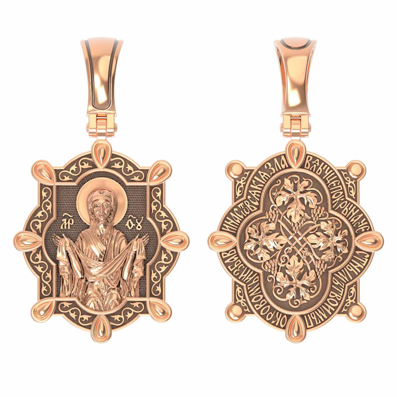На лицевой части образка изображена икона Покров Пресвятой Богородицы. Праздник Покрова Божией Матери является воспоминанием чуда, которое произошло во Влахнернской церкви 1 (14) октября 910 года: Пресвятая Богородица явилась верующим над алтарем храма и распростерла над ними Свое покрывало. В этот день Божья Матерь открыла людям, что Она является Ходатаицей за них перед Богом. Богородица простирает Свой молитвенный покров над всеми православными христианами и умоляет Сына Своего о даровании вечного спасения каждому человеку.