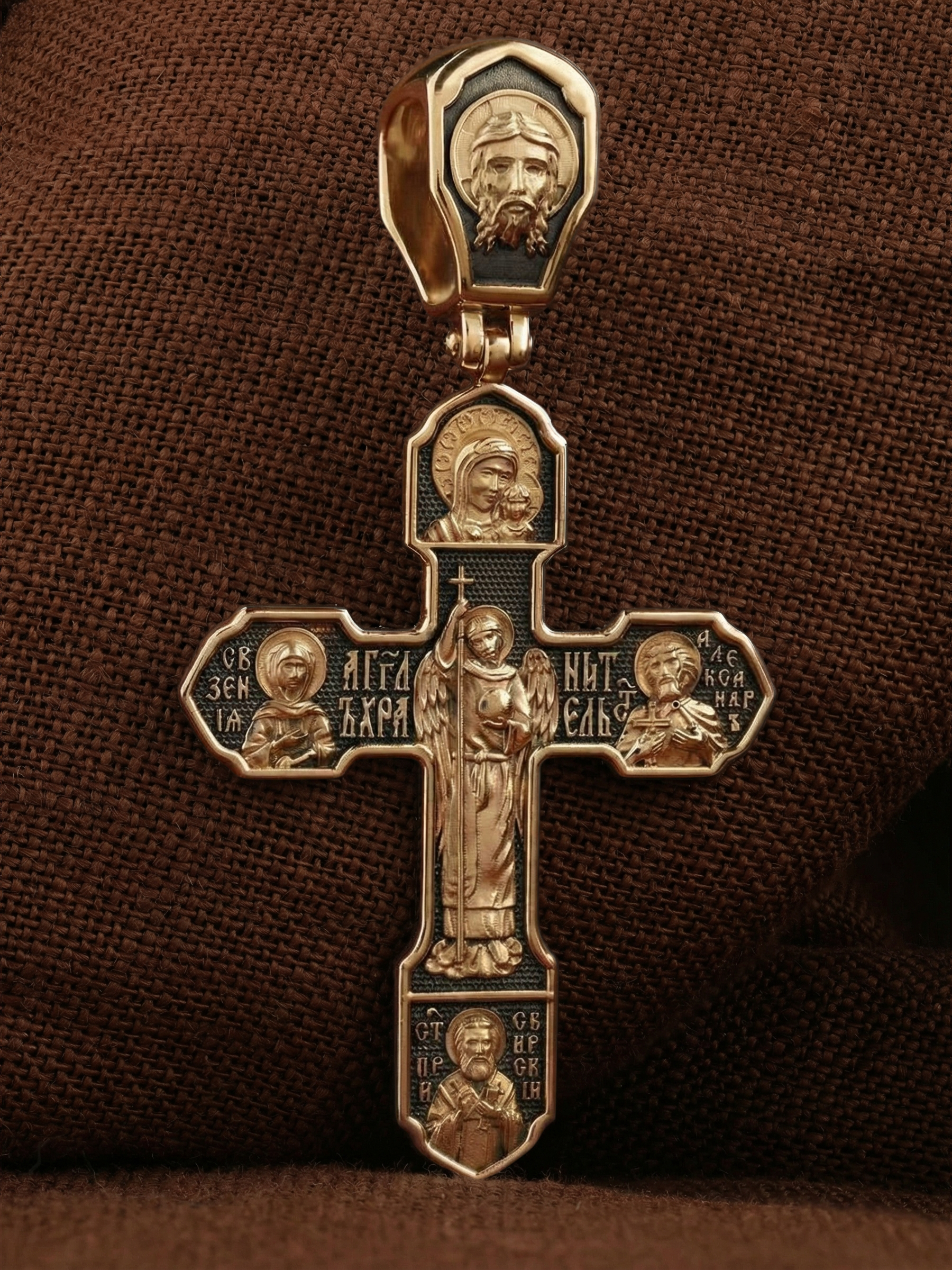 На лицевой стороне изображено Распятие Господа Иисуса Христа, над вершиной которого помещены титлы Его святого имени — «ИС ХС». Под основной перекладиной надписи — «НИКА», что в переводе с греческого означает «победитель», и словосочетание «СЫН БОЖИЙ», что означает божественную природу Иисуса Христа. С двух сторон Христу предстоят Пресвятая Богородица и св. Андрей Первозванный. Внизу — образ Архангела Михаила, могучего защитника от злых сил. Это он низверг дьявола и встал во главе ангелов для борьбы с бесовскими силами. Его имя означает «Кто яко Бог?».