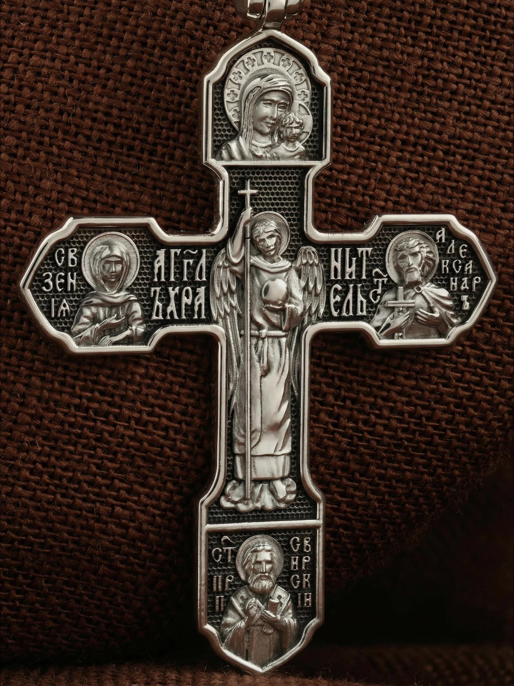 С обратной стороны креста осеняет своими крыльями Ангел Хранитель. Его образ помещен в центральной части, потому что он первый друг и помощник каждому человеку, данный ему от Бога в таинстве крещения. Рядом с Ангелом Хранителем, помещены образы особо почитаемых в Русской Церкви святых, мощи которых находятся в Петербургской епархии. Это св. блаженная Ксения Петербургская, св. блгв. кн. Александр Невский, и великий святой целитель Николай Чудотворец. Вверху креста — Казанская икона Пресвятой Богородицы, одна из самых почитаемых в России.