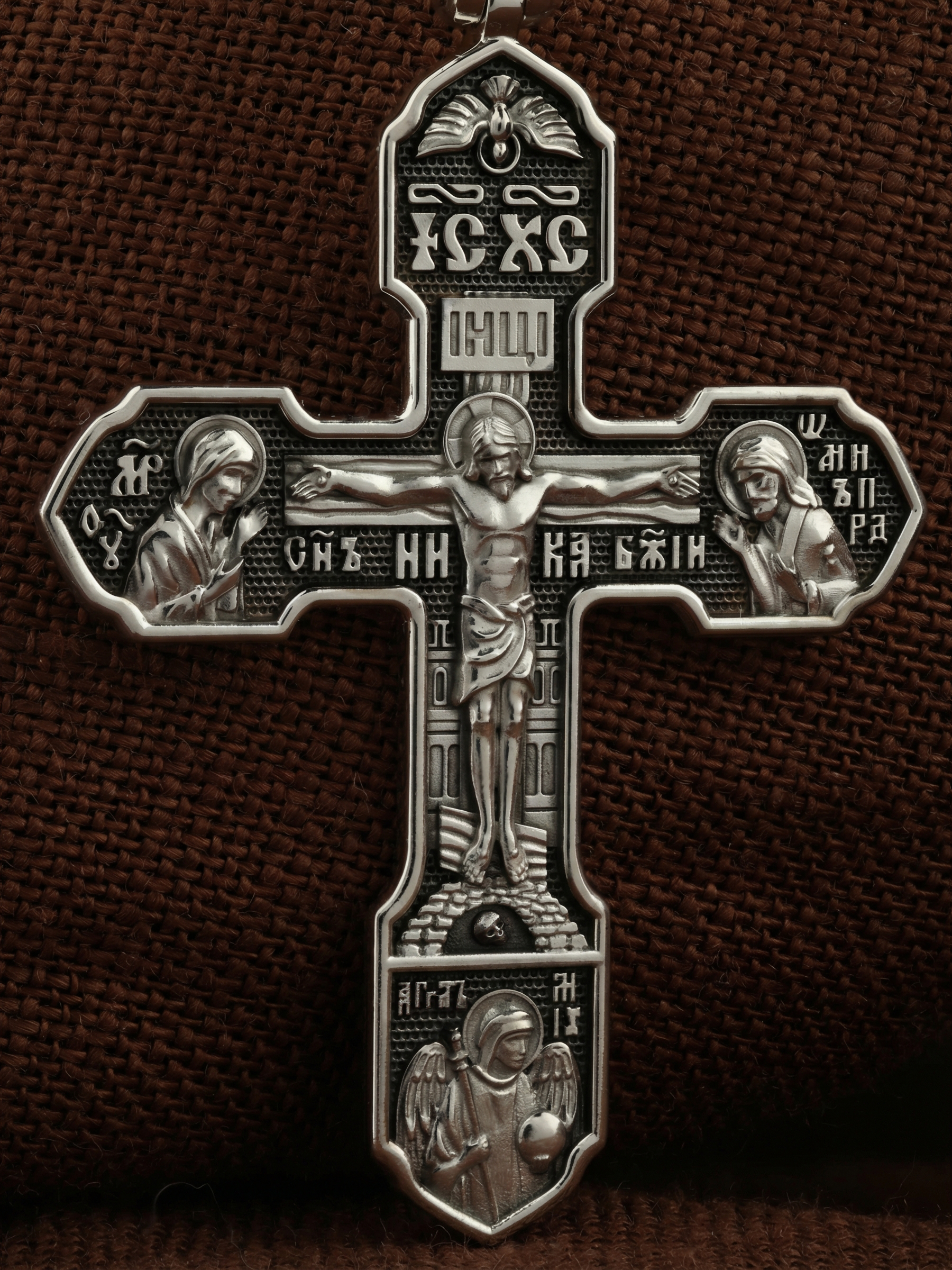 На лицевой стороне изображено Распятие Господа Иисуса Христа, над вершиной которого помещены титлы Его святого имени — «ИС ХС». Под основной перекладиной надписи — «НИКА», что в переводе с греческого означает «победитель», и словосочетание «СЫН БОЖИЙ», что означает божественную природу Иисуса Христа. С двух сторон Христу предстоят Пресвятая Богородица и св. Андрей Первозванный. Внизу — образ Архангела Михаила, могучего защитника от злых сил. Это он низверг дьявола и встал во главе ангелов для борьбы с бесовскими силами. Его имя означает «Кто яко Бог?».
