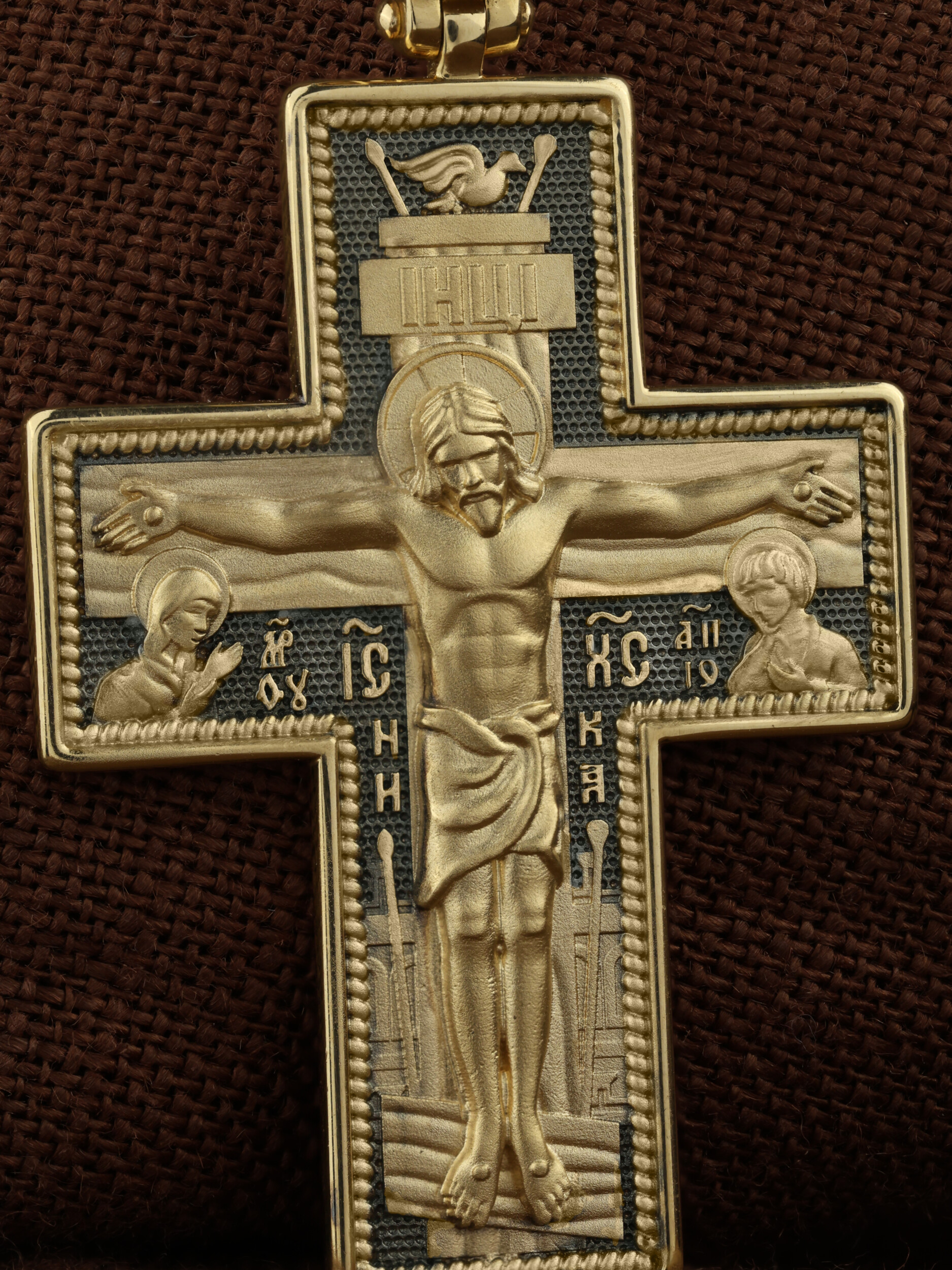 На лицевой стороне изображено Распятие Господа Иисуса Христа. С двух сторон Христу предстоят Пресвятая Богородица и св. пророк и Предтеча Господень Иоанн Креститель, которые имеют особое дерзновение перед Богом молиться за всех людей. Иконы, где они изображены молящимися Христу, называются Деисус, что значит «моление».
