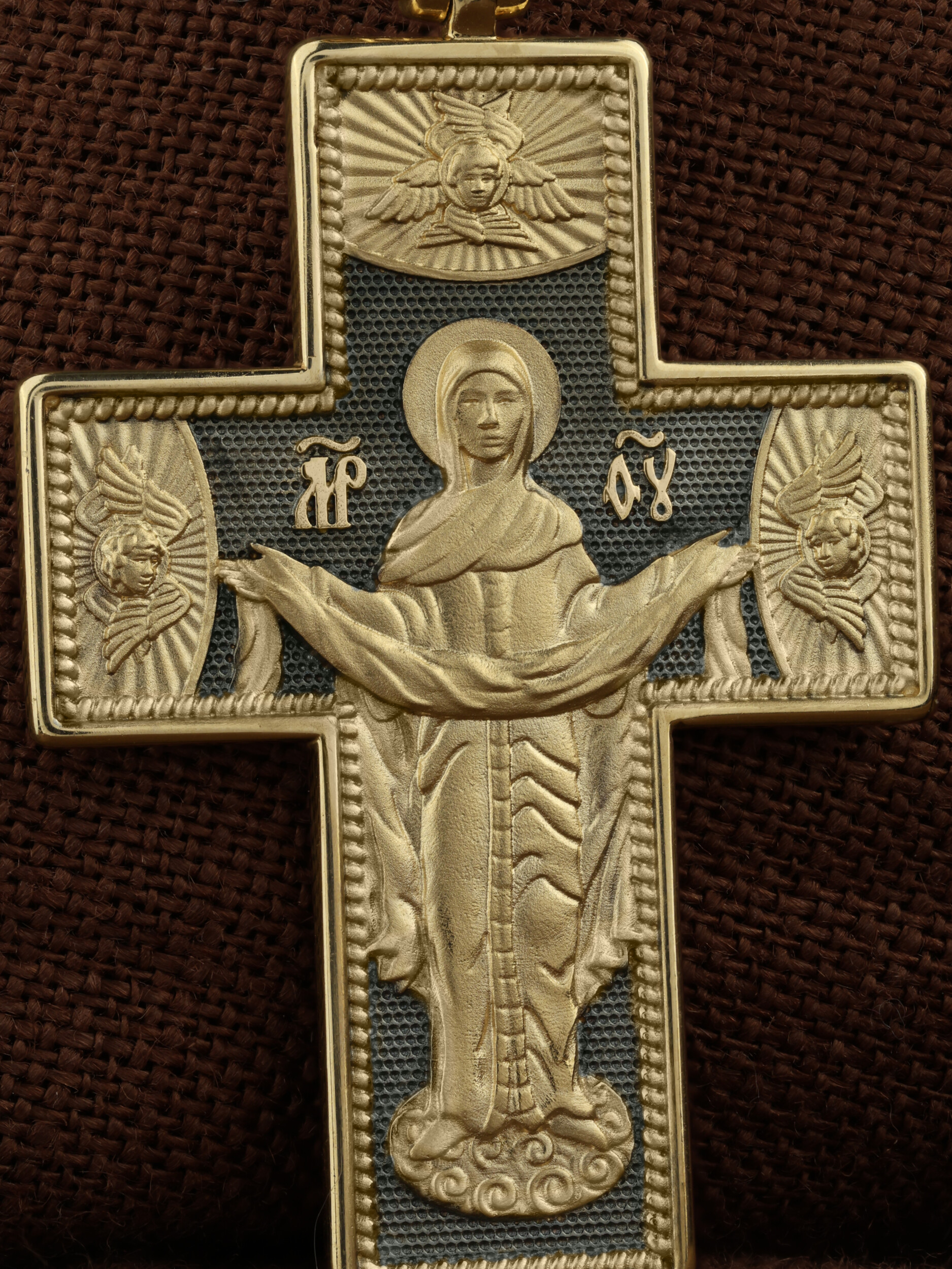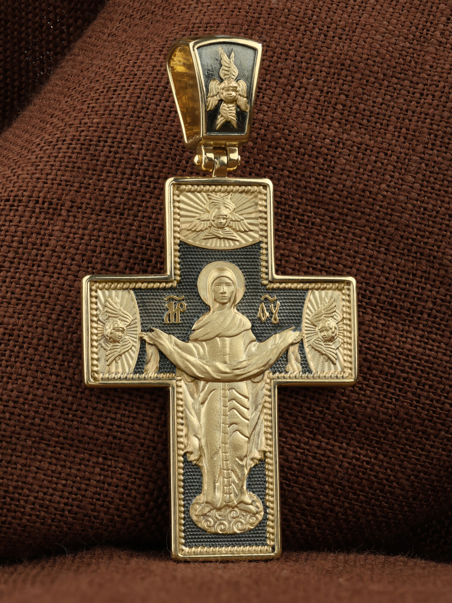 На обороте креста, в окружении крылатых Серафимов, изображена икона Покрова Пресвятой Богородицы. Праздник Покрова Божией Матери является воспоминанием чуда, которое произошло во Влахнернской церкви 1 (14) октября 910 года: Пресвятая Богородица явилась верующим над алтарем храма и распростерла над ними Свое покрывало. В этот день Божья Матерь открыла людям, что Она является Ходатаицей за них перед Богом. Богородица простирает Свой молитвенный покров над всеми православными христианами и умоляет Сына Своего о даровании вечного спасения каждому человеку.