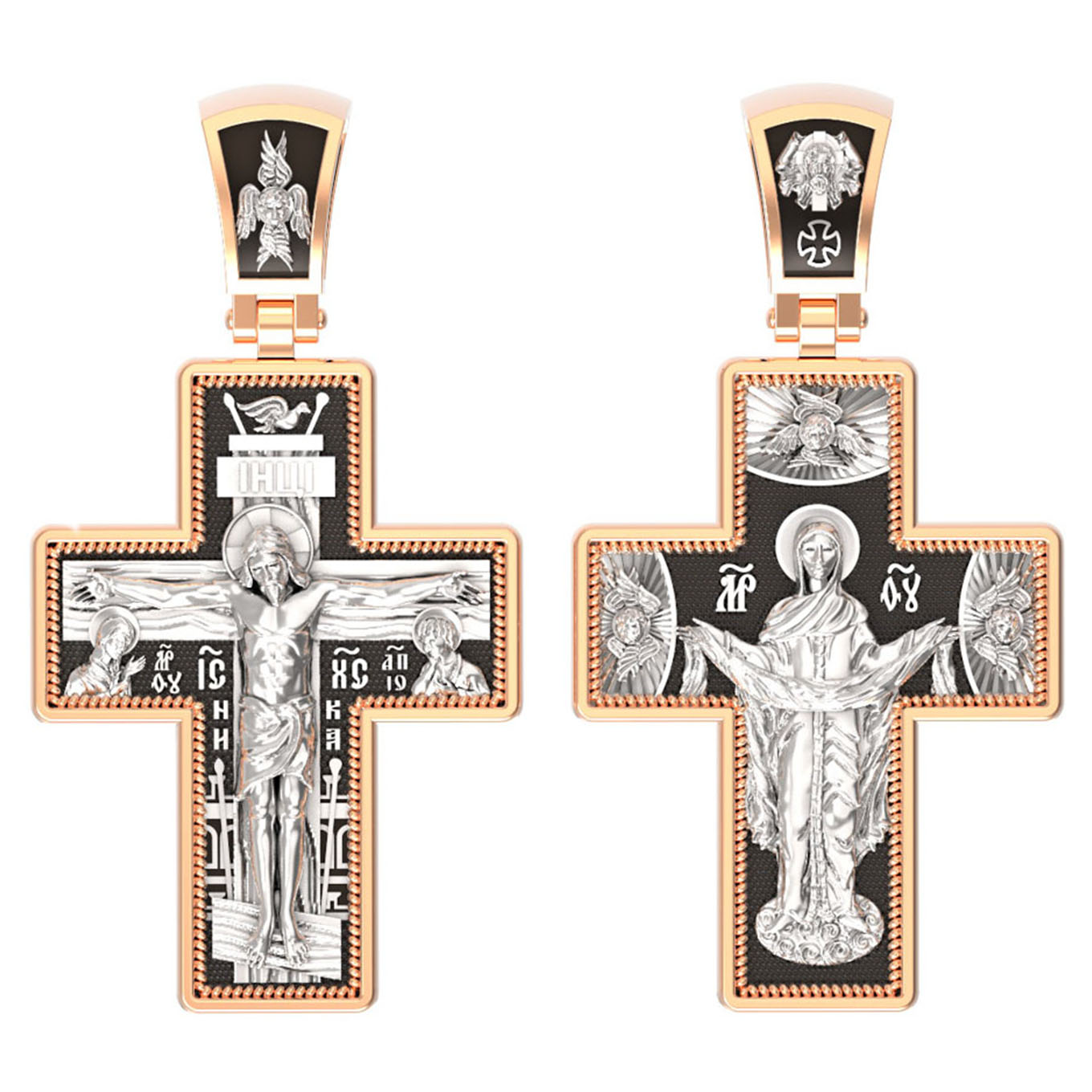 На обороте креста, в окружении крылатых Серафимов, изображена икона Покрова Пресвятой Богородицы. Праздник Покрова Божией Матери является воспоминанием чуда, которое произошло во Влахнернской церкви 1 (14) октября 910 года: Пресвятая Богородица явилась верующим над алтарем храма и распростерла над ними Свое покрывало. В этот день Божья Матерь открыла людям, что Она является Ходатаицей за них перед Богом. Богородица простирает Свой молитвенный покров над всеми православными христианами и умоляет Сына Своего о даровании вечного спасения каждому человеку.