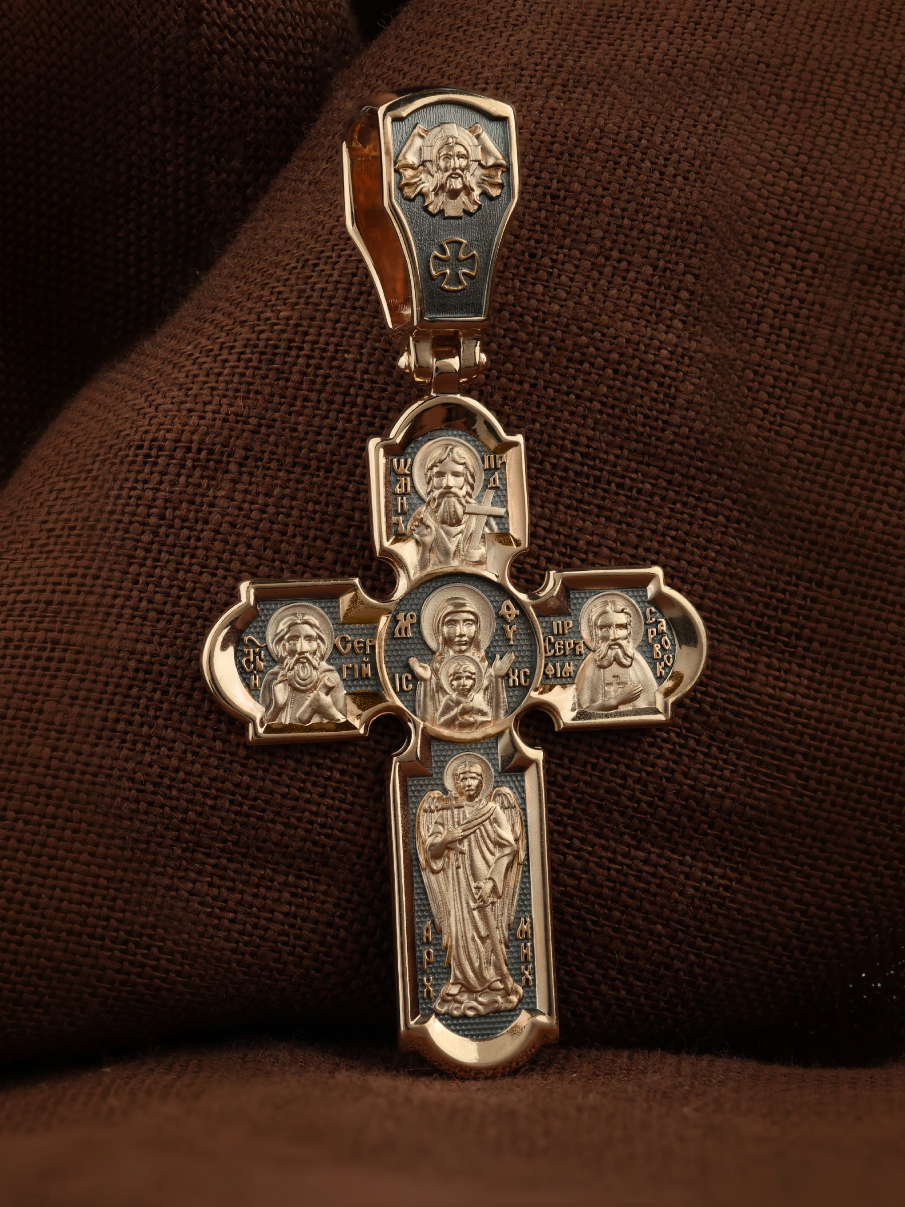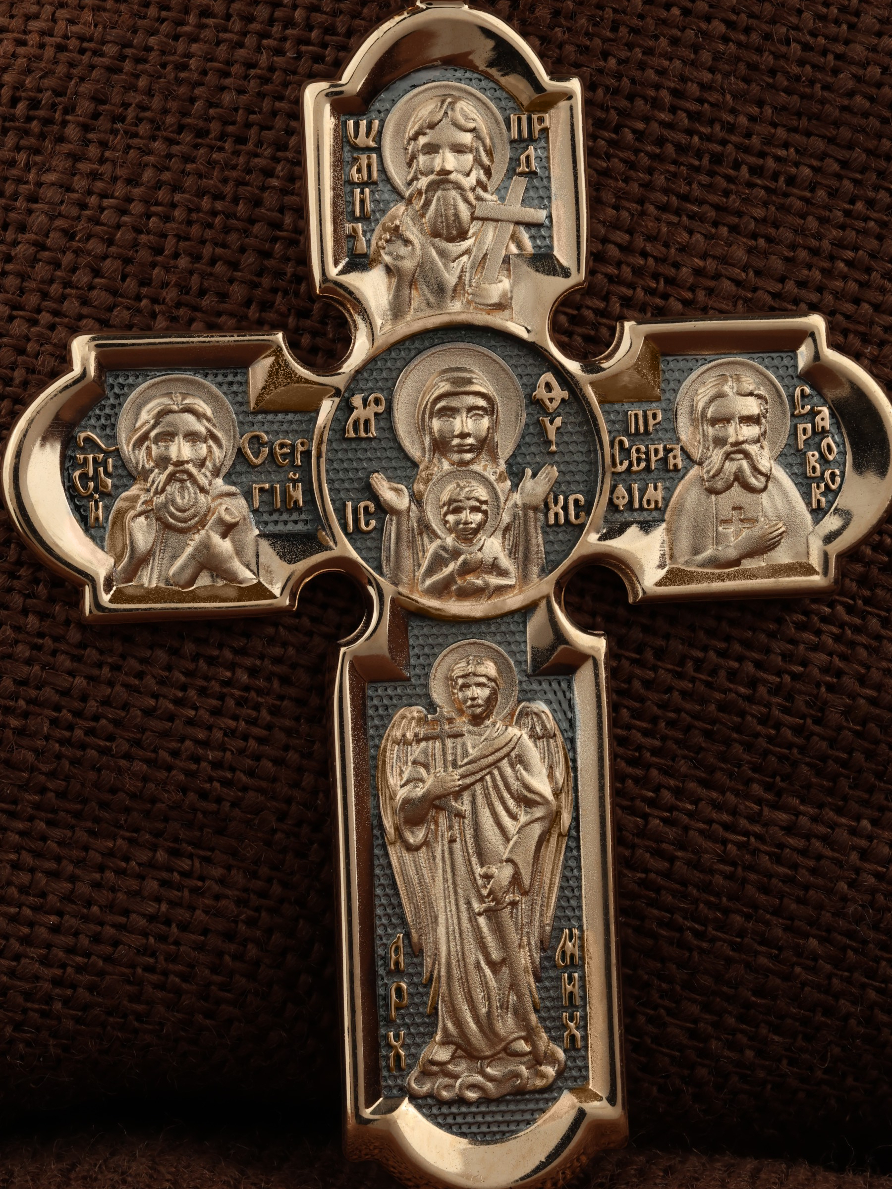 Центральную часть оборотной стороны креста украшает икона Божией Матери «Знамение». Иконы Божией Матери, известные под именем «Знамение», появились на Руси в XI — XII веках, а называться так стали после чудесного знамения от Новгородской иконы, случившегося в 1170 году. Многочисленные списки с иконы Знамения известны по всей России. На кресте внизу изображен Архангел Михаил, слева — Преподобный Сергий Радонежский, справа — Преподобный Серафим Саровский, вверху — Предтеча Господень Иоанн Креститель. На кулонном кольце помещено изображение Спаса Нерукотворного — образ Спасителя, который Он запечатлел на плате и передал для исцеления больному проказой царю Эдессы. Ему придается победное и защитное значение.