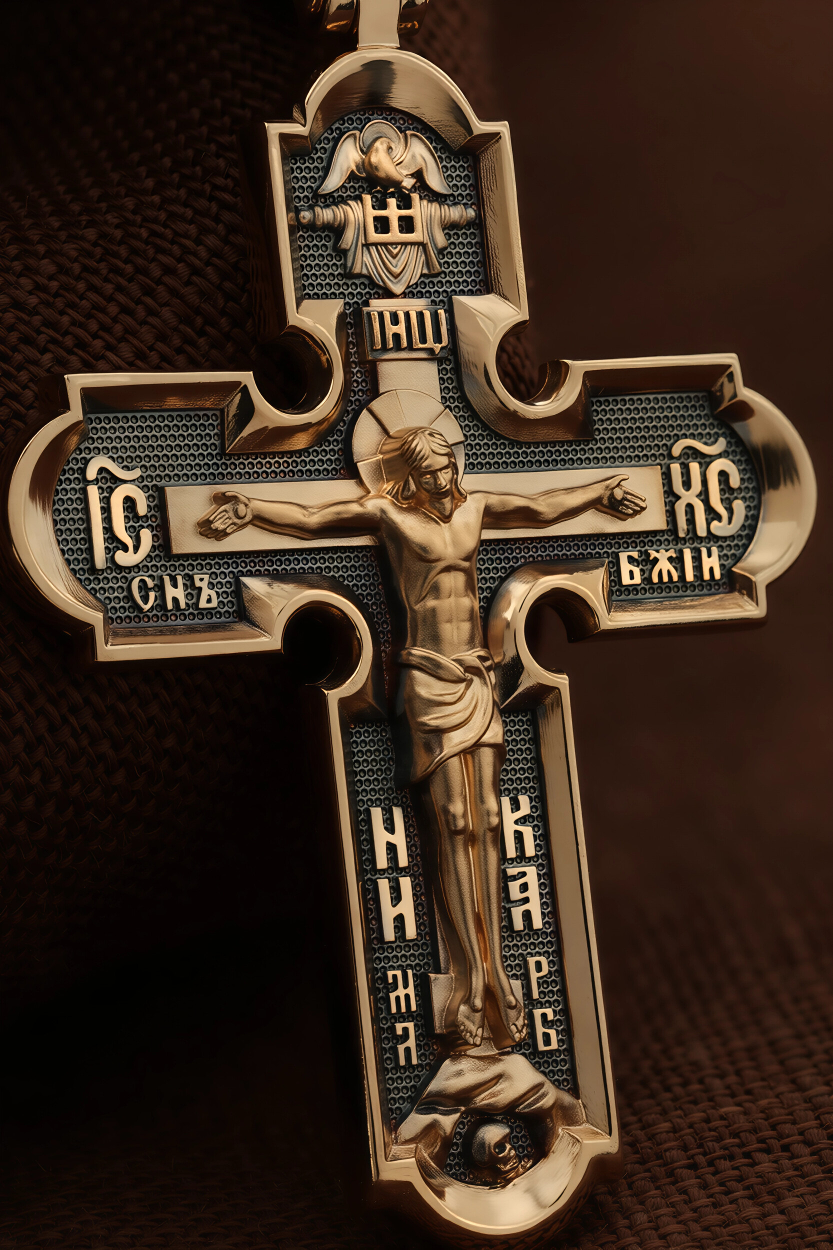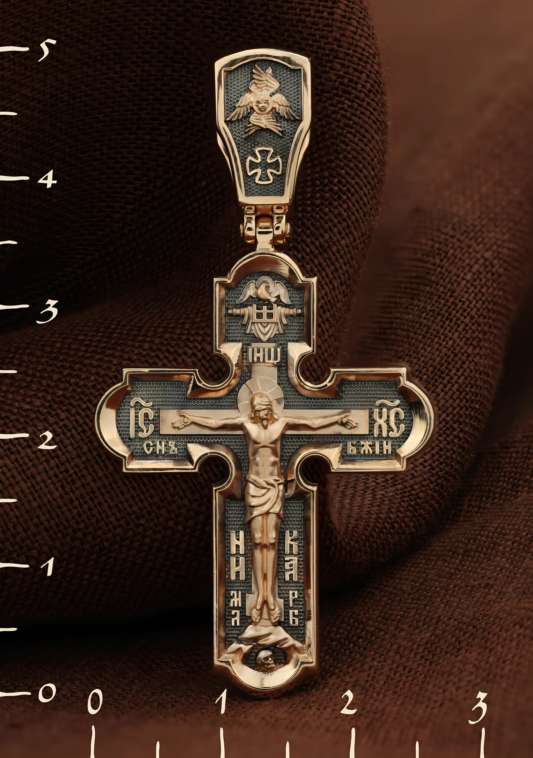 На лицевой стороне креста изображено Распятие Господа и Спасителя нашего Иисуса Христа. Крест- символ спасения и искупления рода человеческого, знамение победы над смертью и адом. Иисус Христос, как искупительная жертва освобождения человечества от власти греха, умер крестной смертью и в третий день воскрес. Верхняя перекладина символизирует титло — табличку, на которой, согласно Евангелию, было начертано: Иисус Назорей Царь Иудейский (IНЦI). Надпись «IC» «ХC», означает Иисус Христос, помещается на разных сторонах поперечной перекладины креста. Ниже перекладины расположено словосочетание «СЫН БОЖИЙ», что означает божественную природу Иисуса Христа. Надпись «МЛРБ» — «место лобное рай бысть» означает, что место лобное стало раем и помещаются в нижней части креста. Рядом — слово «НИКА», что означает «победитель». Возвышение, на котором стоит Крест, символизирует гору Голгофу, на которой произошло Распятие. Под подножием Креста изображена покоящаяся голова (череп) Адама. На кулонном кольце изображен шестикрылый Серафим.