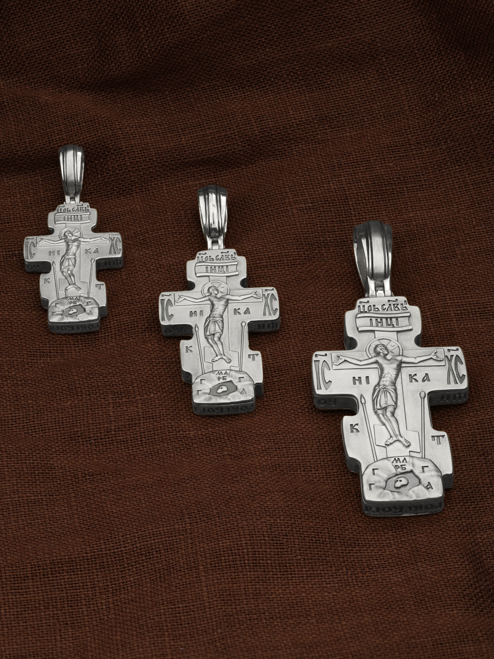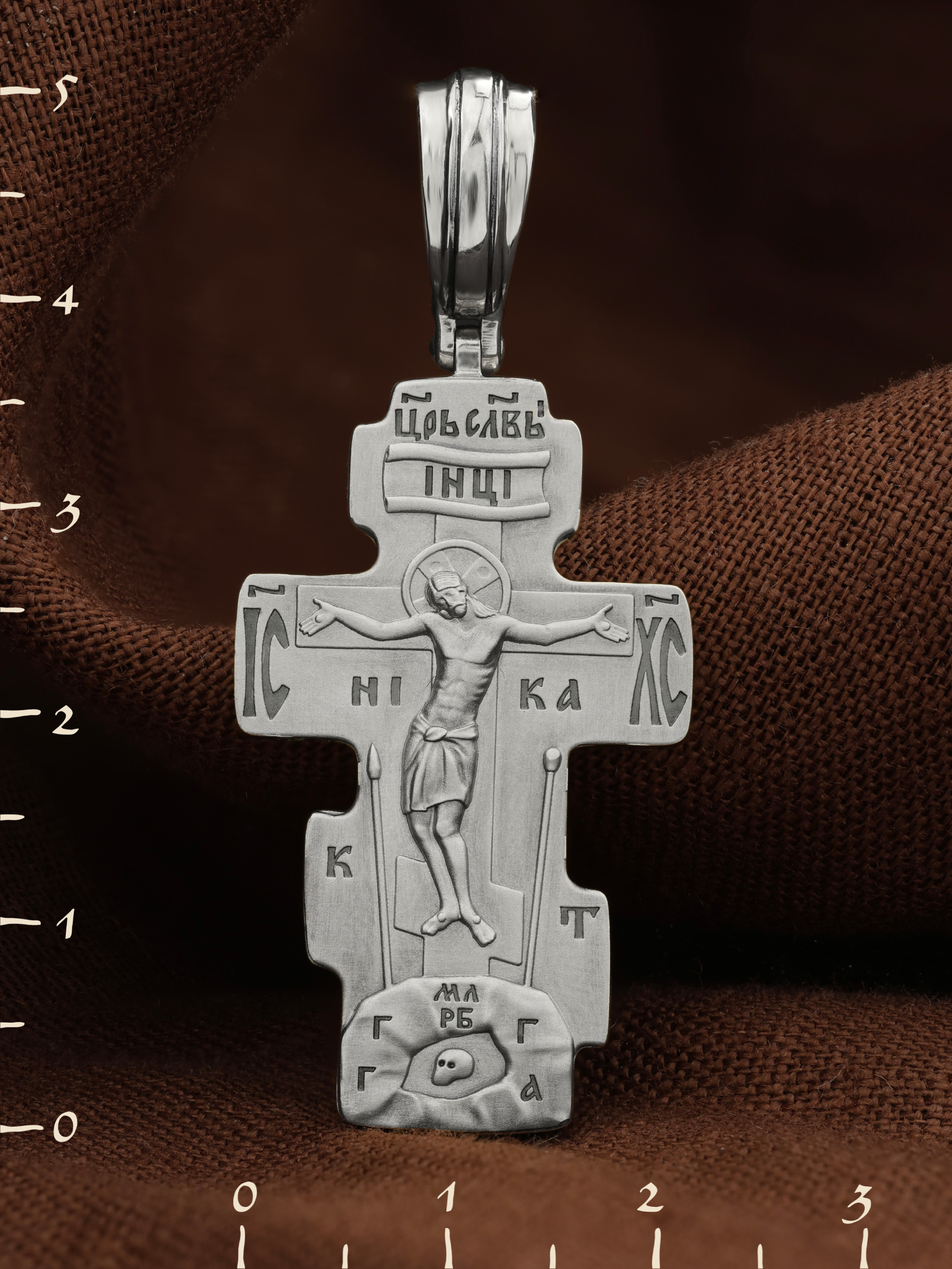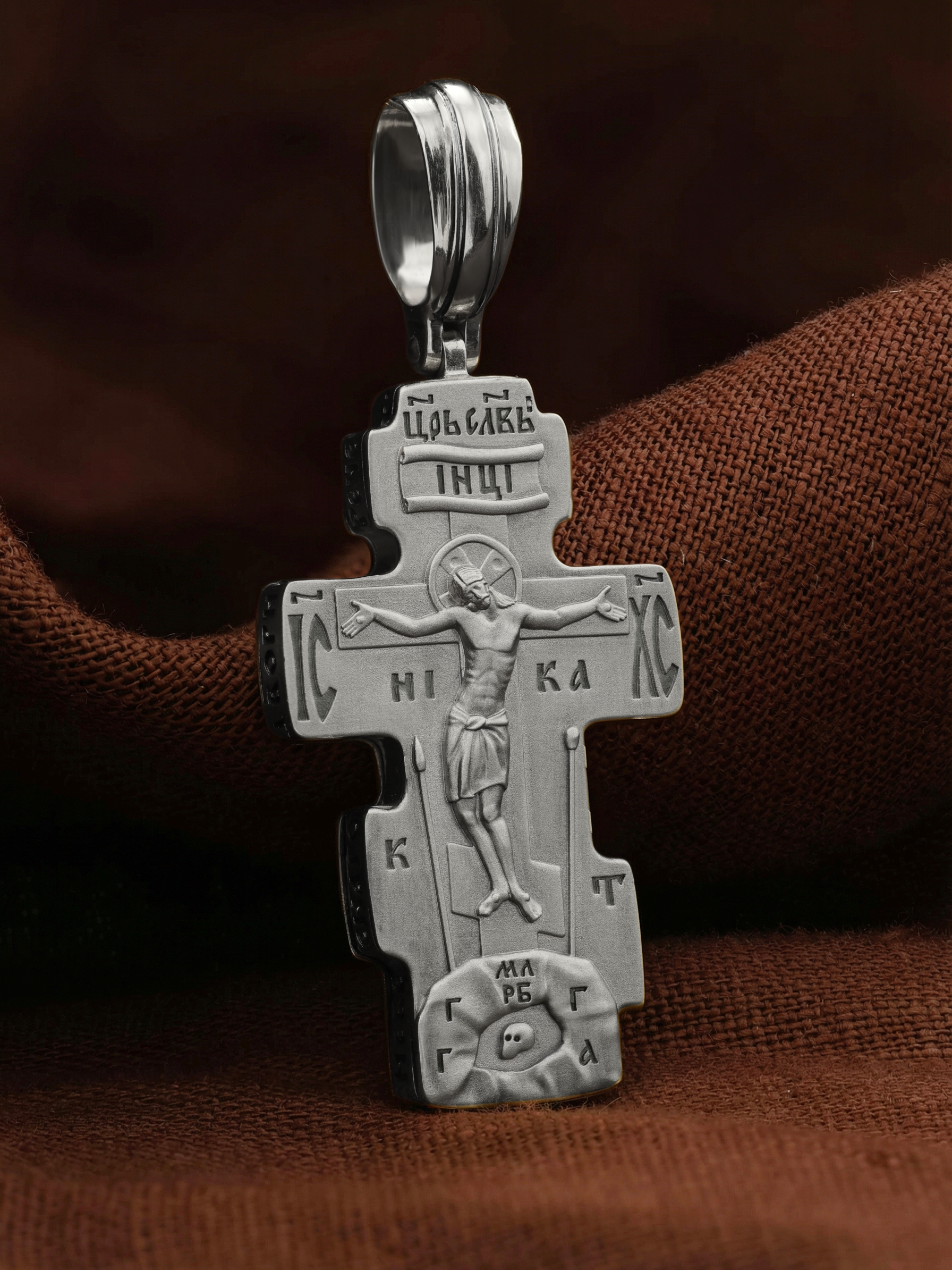 На лицевой стороне креста изображено Распятие Господа и Спасителя нашего Иисуса Христа. Крест- символ спасения и искупления рода человеческого, знамение победы над смертью и адом. Иисус Христос, как искупительная жертва освобождения человечества от власти греха, умер крестной смертью и в третий день воскрес. Над вершиной Распятия помещена надпись «Царь Славы». На верхней табличке, выше головы Иисуса, расположена надпись, составленная Понтием Пилатом — «IНЦI». Она означает «Иисус Назорей, Царь Иудейский». Надпись «IC» «ХC», означает Иисус Христос, помещается на разных сторонах поперечной перекладины креста. Под ней помещено слово «НIКА», что означает Победитель. Крест стоит на горе камней, символизирующих Голгофу, которая обозначена надписью «Г Г». В ее основании различается череп — это голова Адама, обозначенный надписью «Г А». Надпись «МЛРБ» — «место лобное рай бысть» означает место лобное стало раем. Вдоль креста изображены орудия Страстей Христовых: копие сотника Лонгина, которым пронзили подреберье мёртвого Иисуса, чтобы убедиться в Его смерти, и трость с губкой, с которой Иисуса напоили уксусом. Они обозначены буквами «К» и «Т».