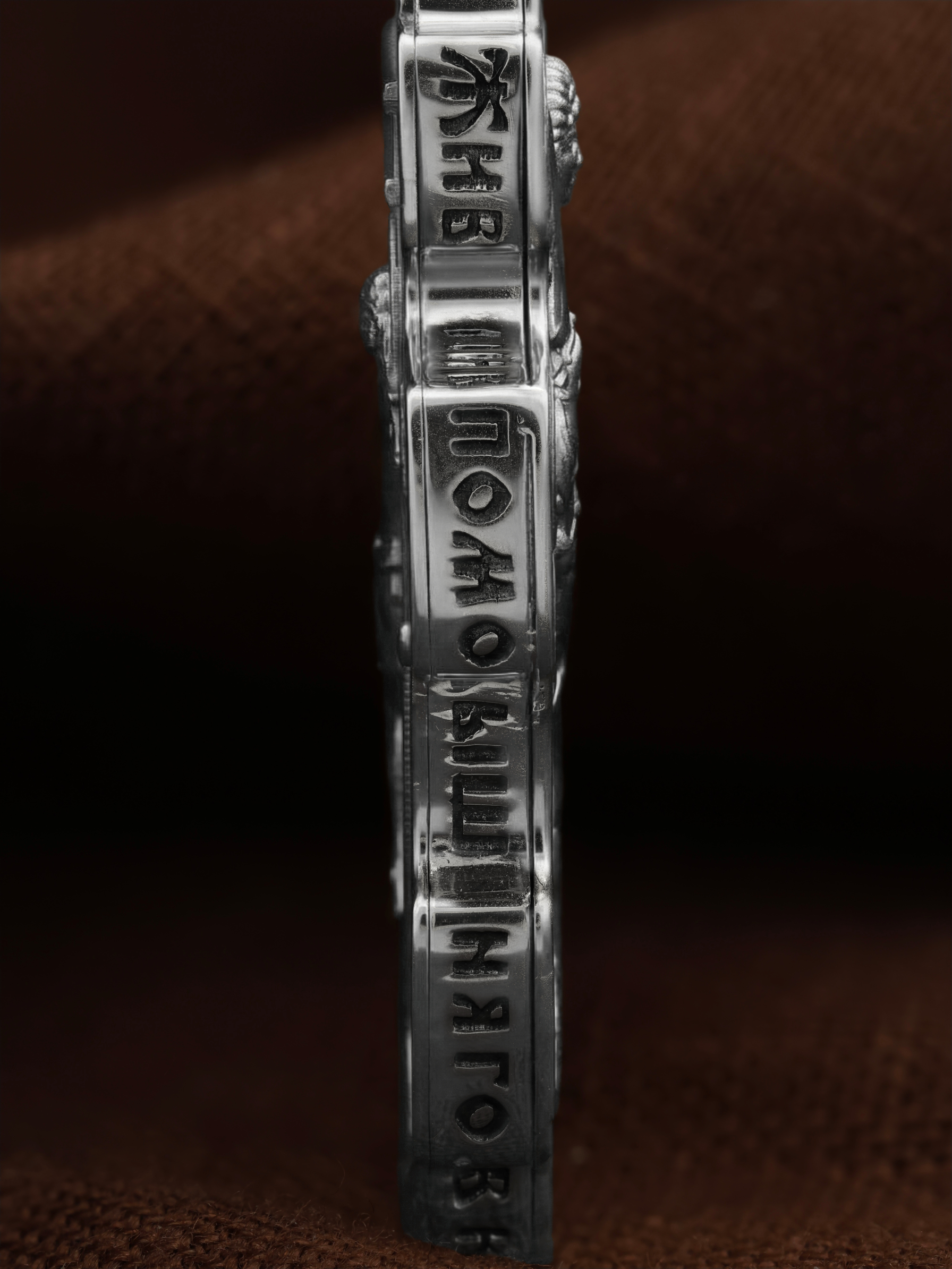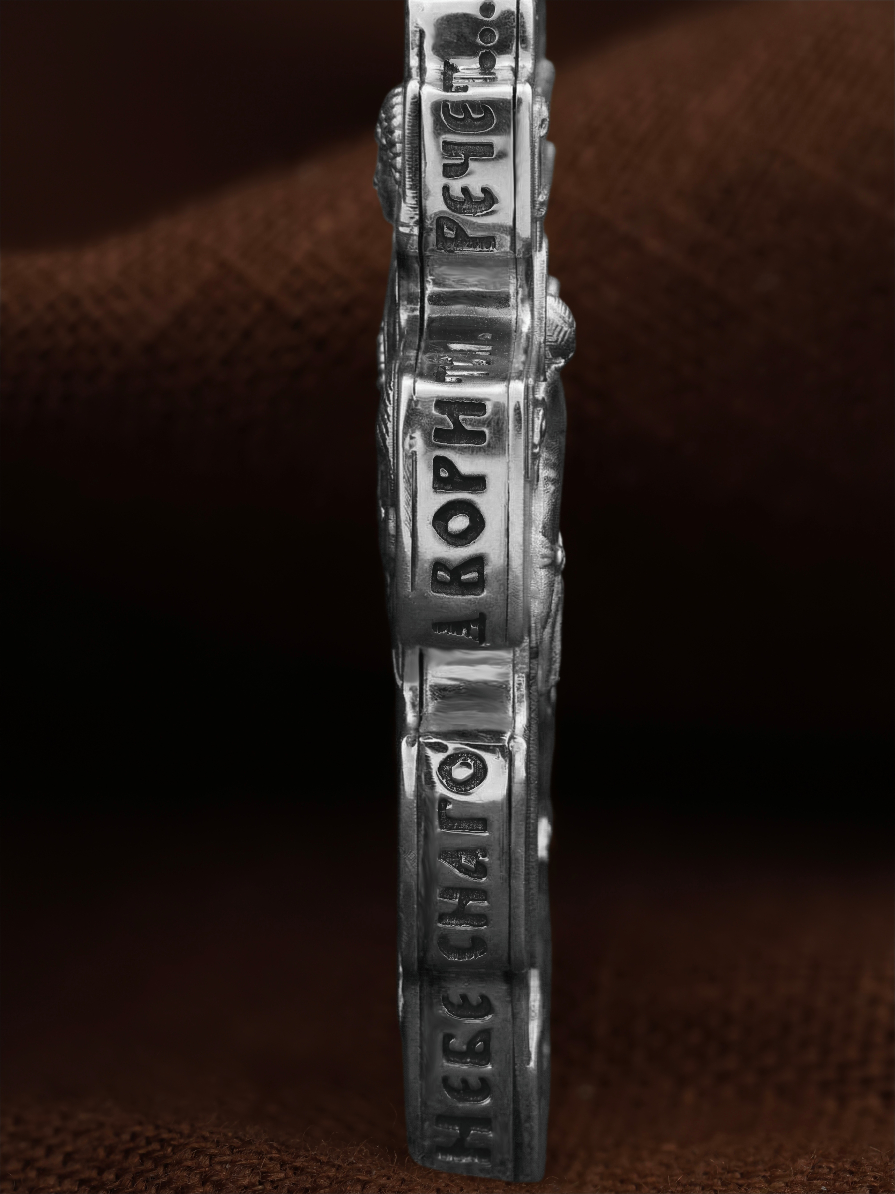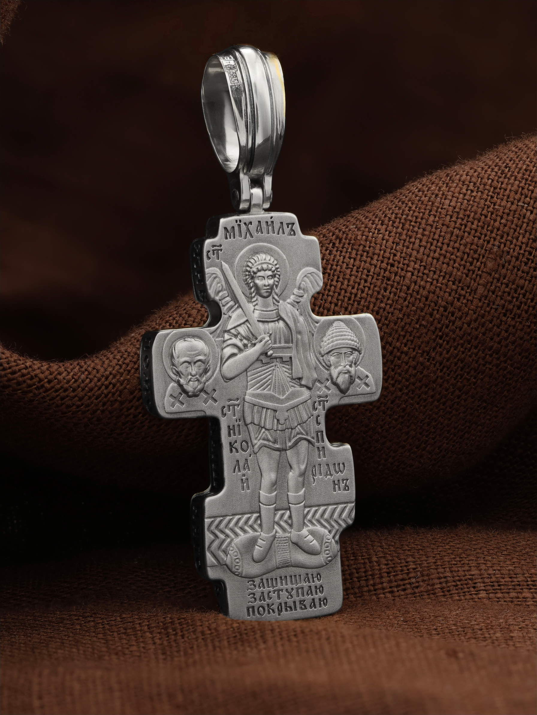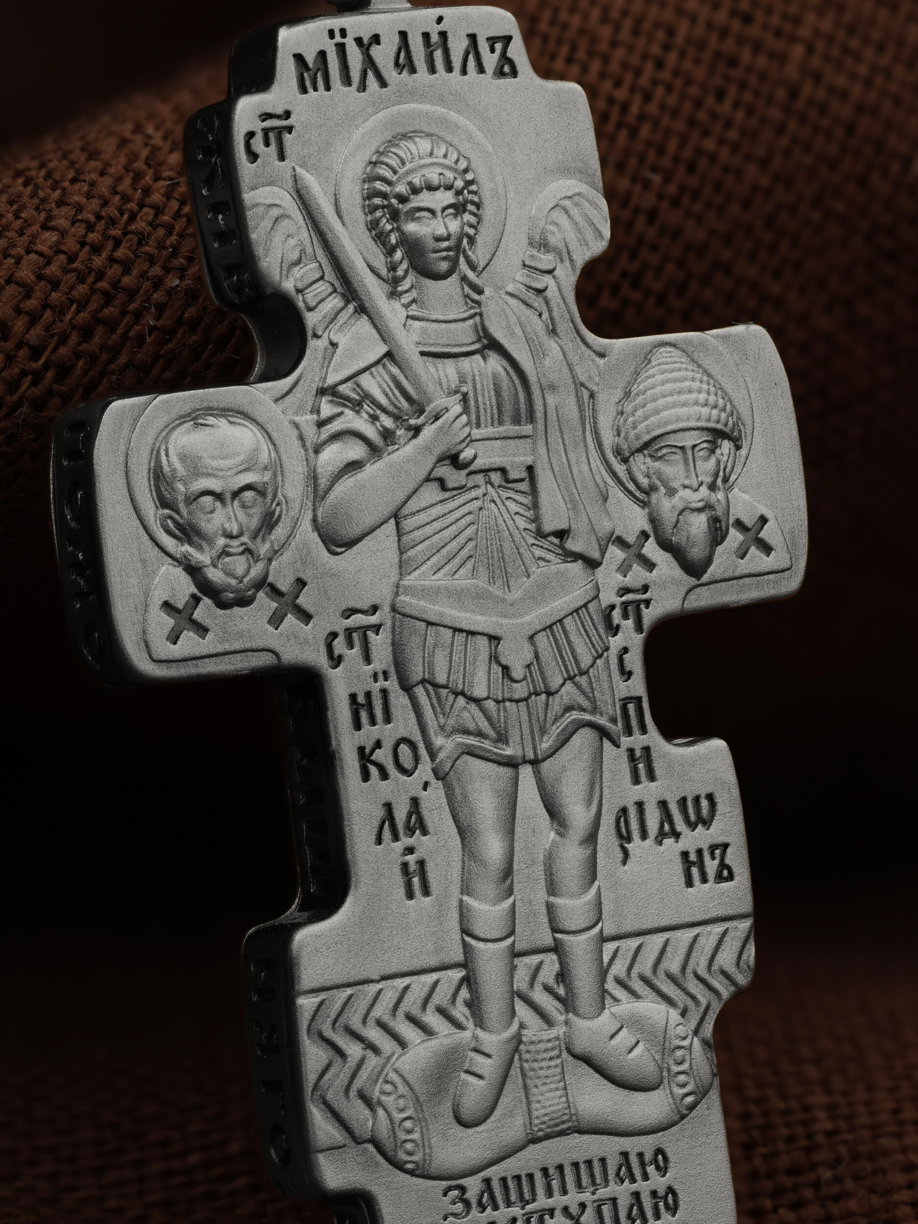 Центральную часть оборотной стороны креста занимает изображение Архангела Михаила — верного служителя Божия, который низринул с Неба возгордившегося денницу с другими павшими духами. В Православии его называют Архистратигом, что означает глава святого воинства Ангелов и Архангелов. Архангел Михаил изображен в воинственном виде с огненным мечом в правой руке. Архангел почитается как покровитель воинов и всех верных Богу и ведущих борьбу против сил зла, борец против ересей, а также защитник душ умерших, страж райских врат. С древних времен прославлен своими чудесами Архангел Михаил на Руси. Слева от образа Архангела изображен Святитель Николай Чудотворец, архиепископ Мир Ликийских, справа — Святитель Спиридон Тримифутский Чудотворец. Святители являются одними из самых почитаемых святых в православном мире. На торцевой стороне креста размещены слова молитвы из 90-го псалма: «Живый в помощи Вышняго, в крове Бога Небеснаго водворится. Речет…»
