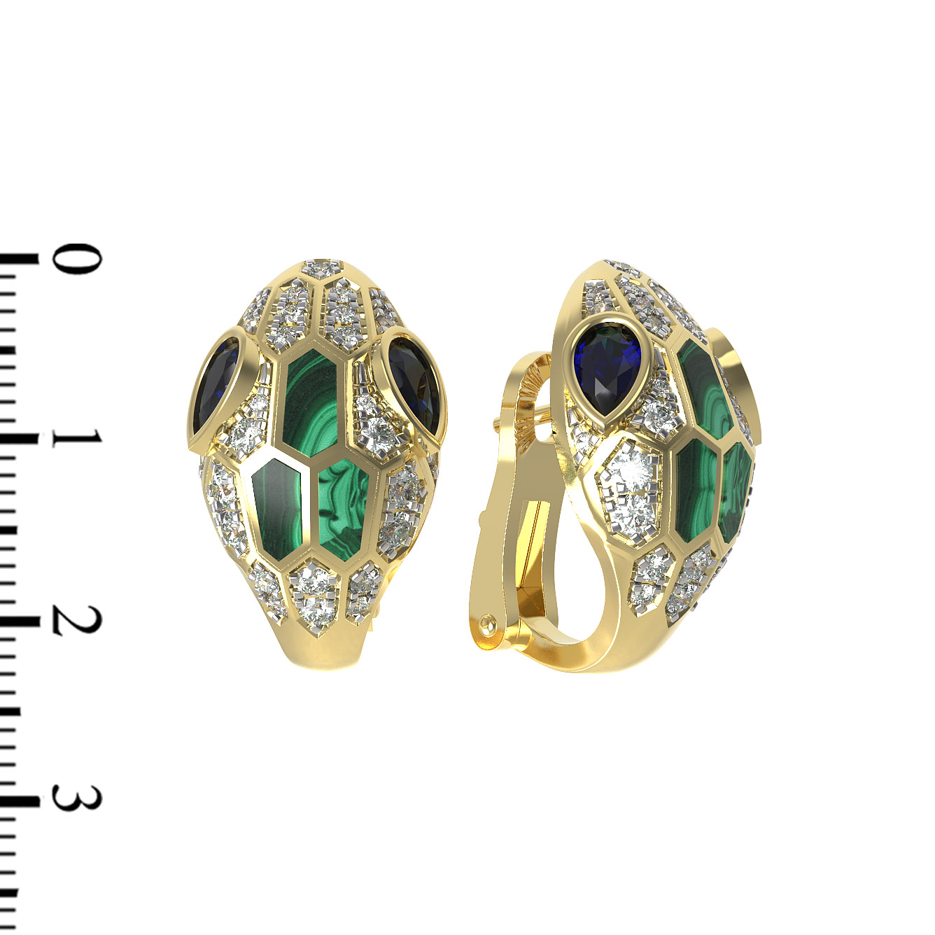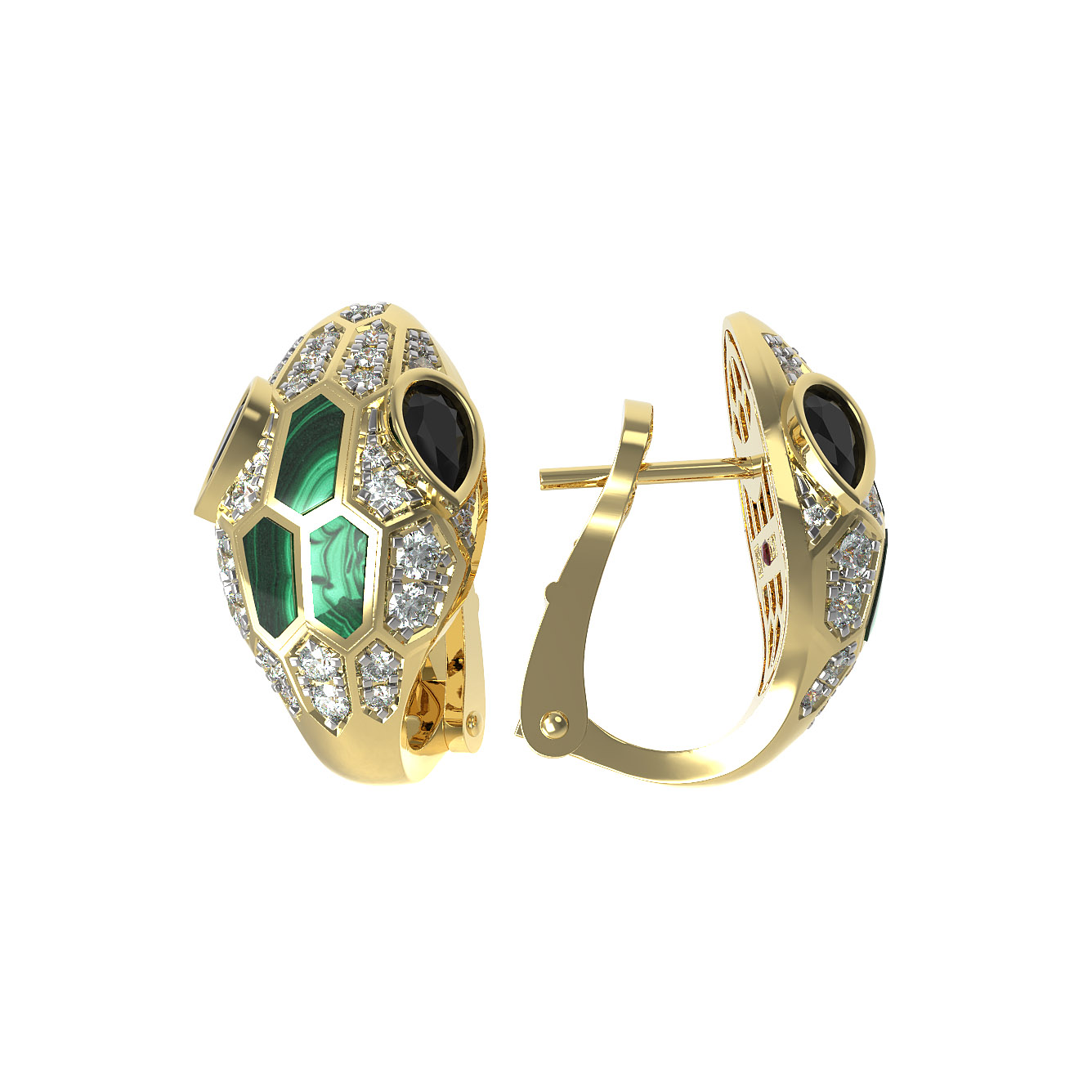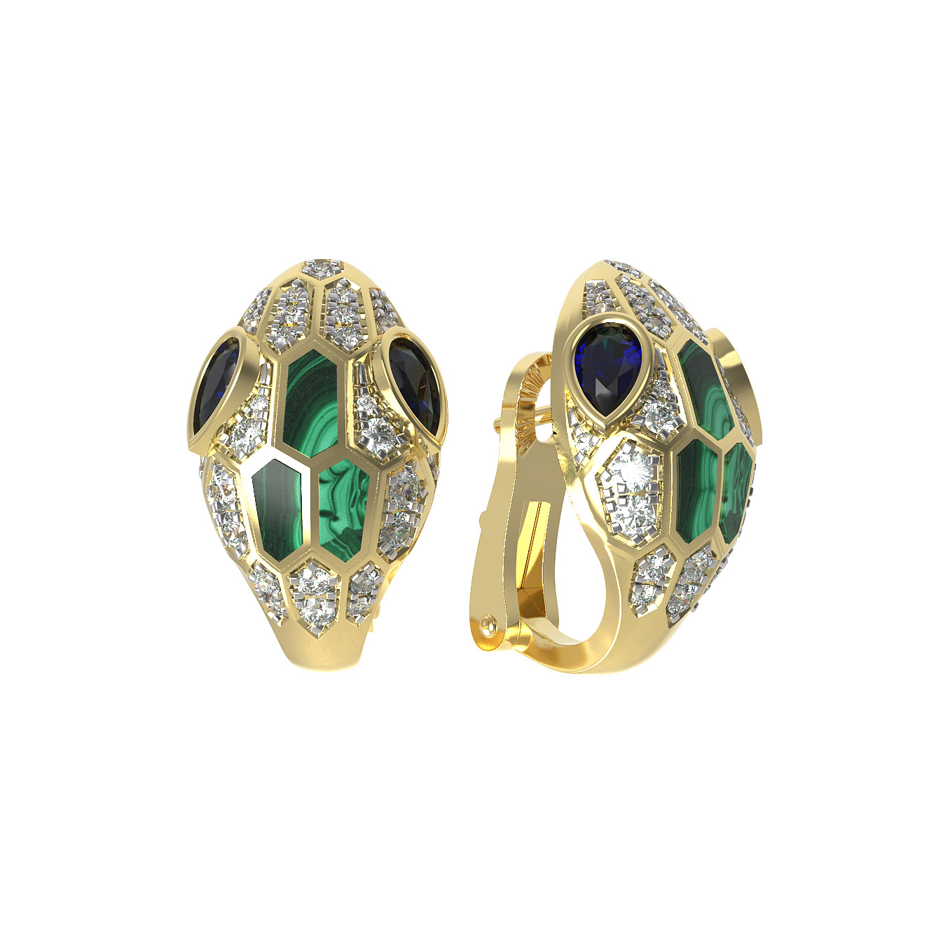 Серьги из лимонного золота c бриллиантами, сапфиром и малахитом
