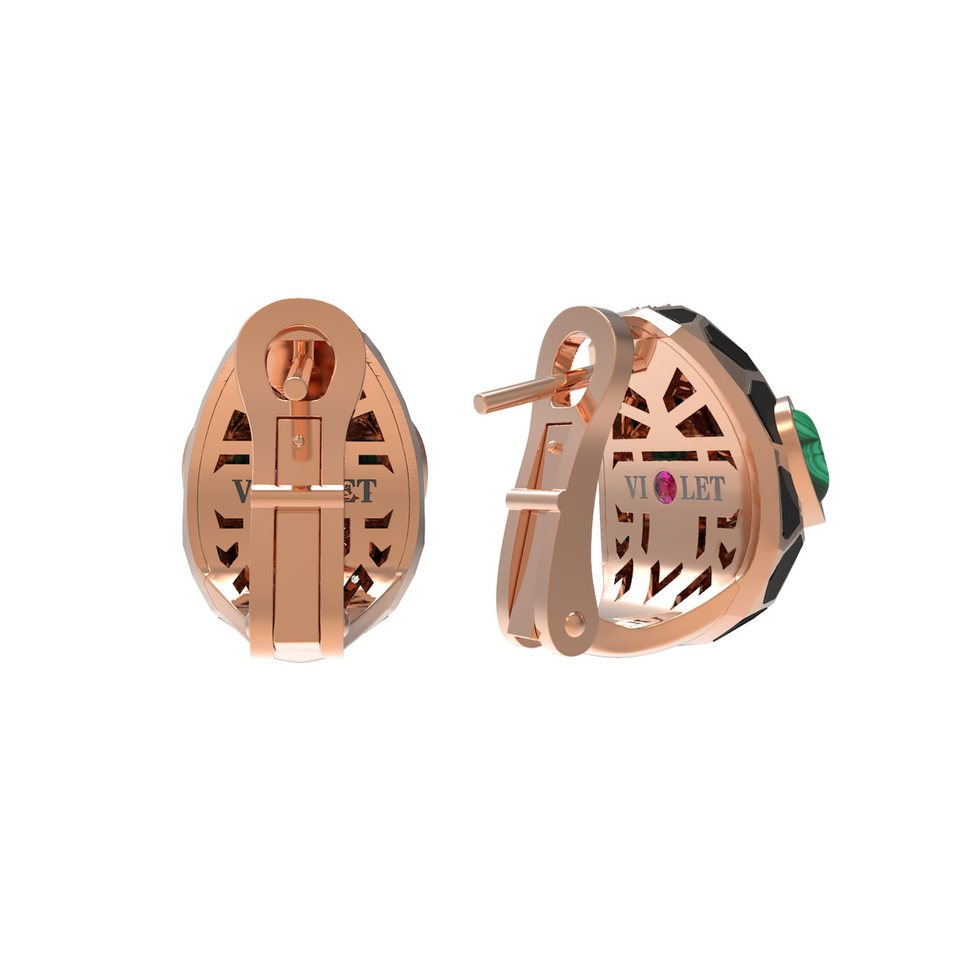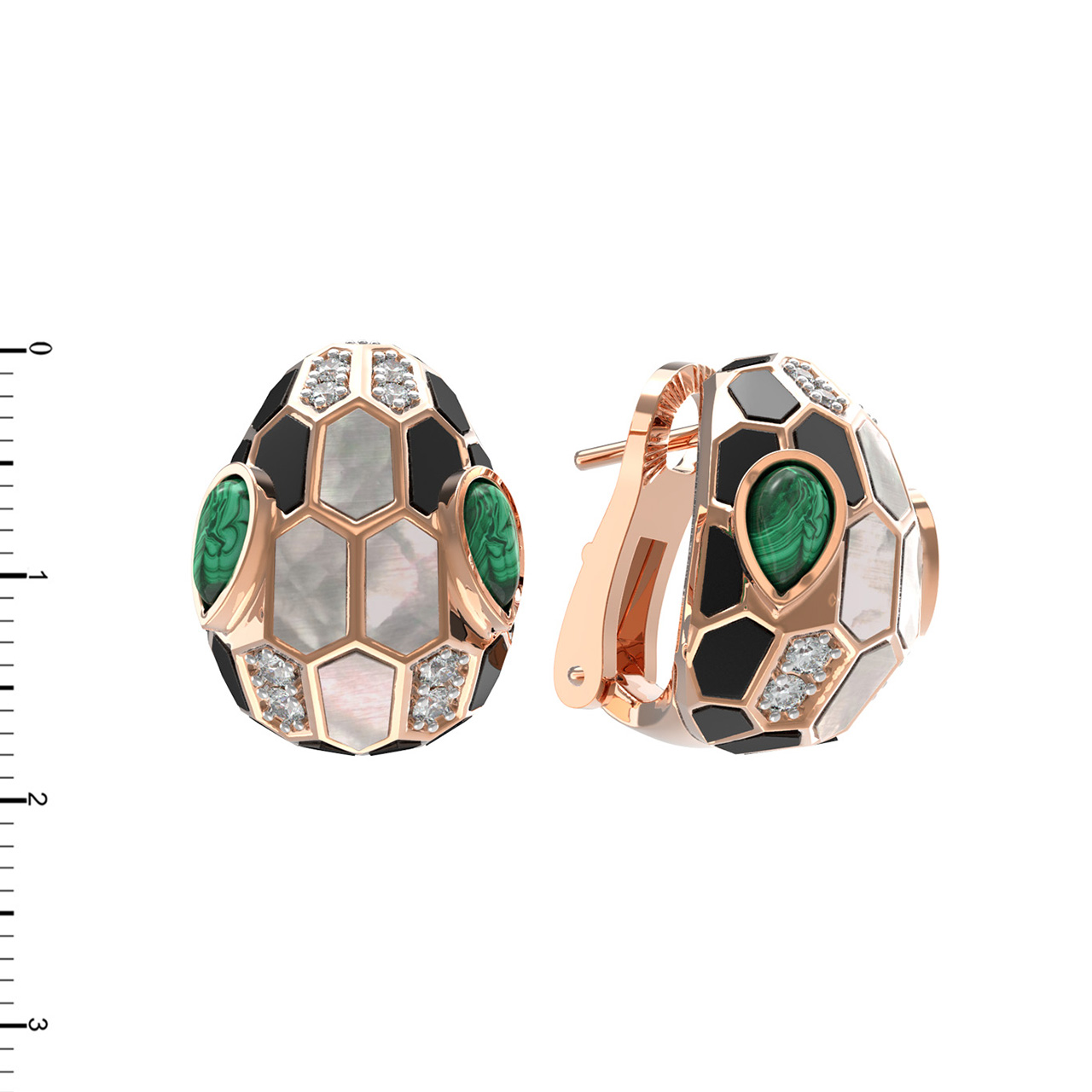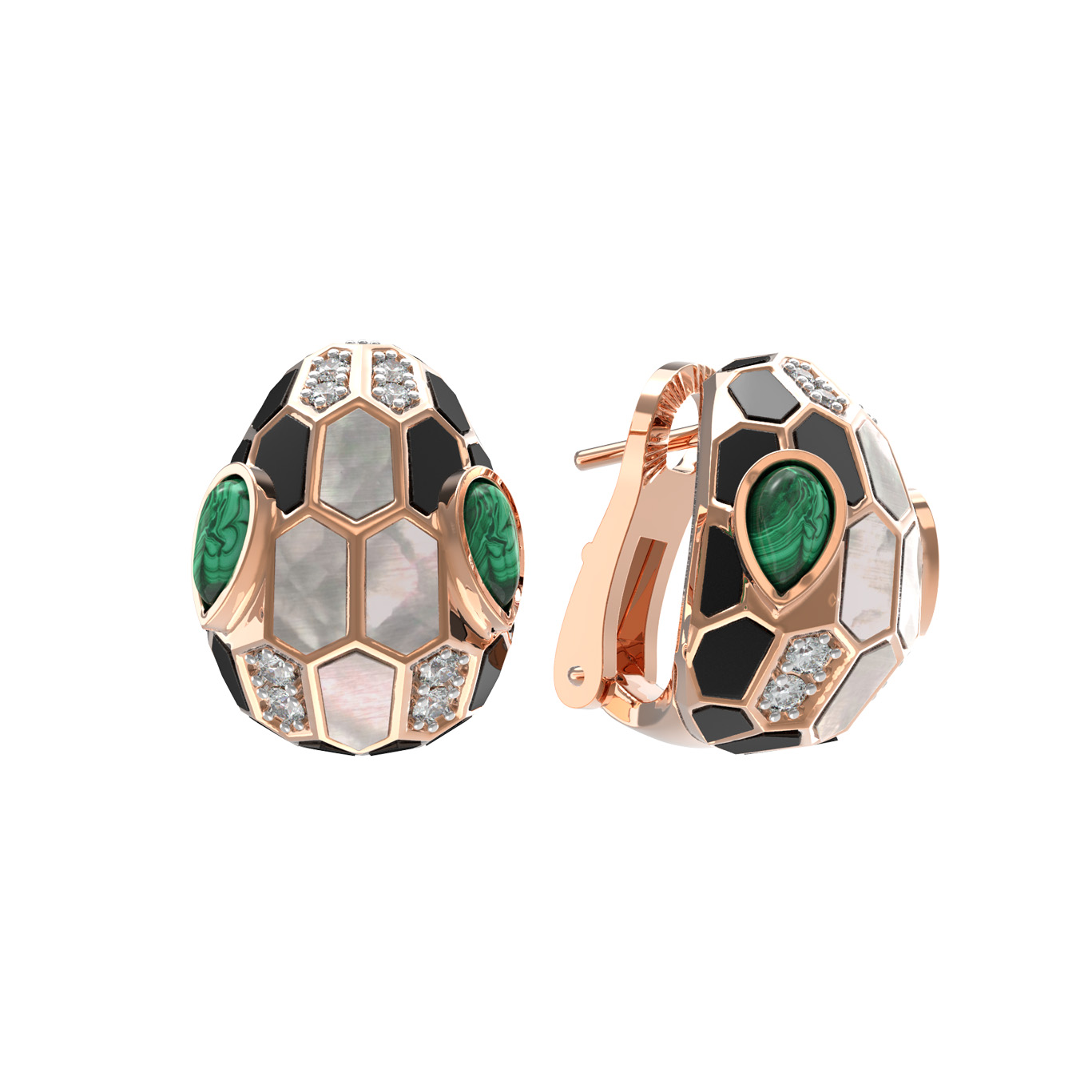 Серьги из золота c бриллиантами, рубином, ониксом, малахитом и перламутром