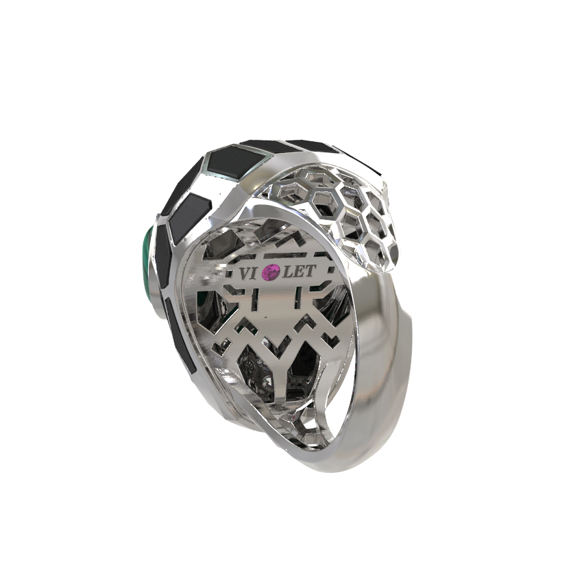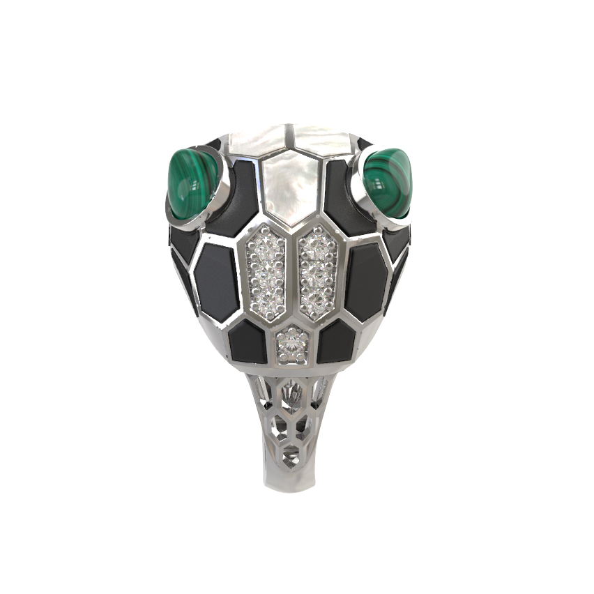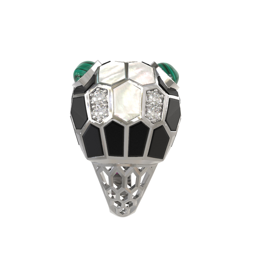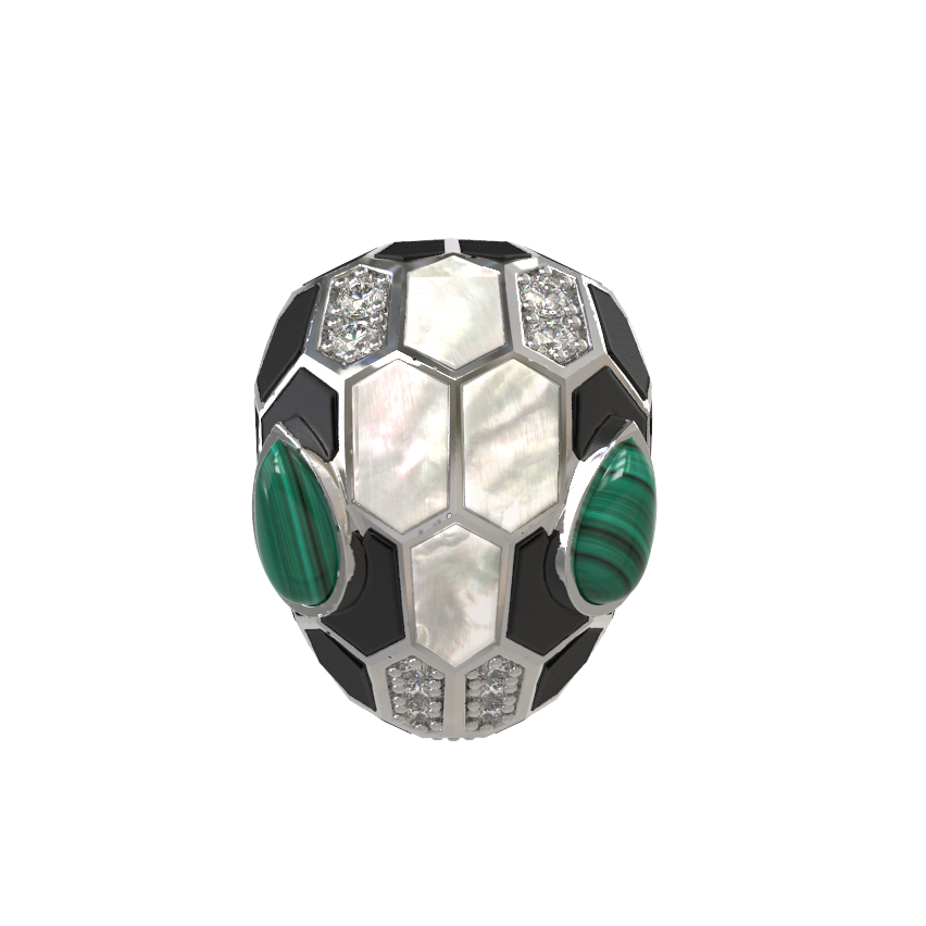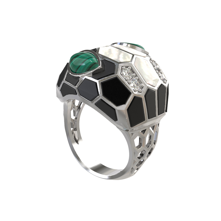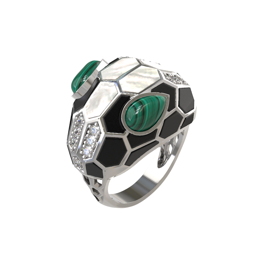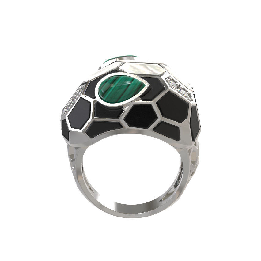 Кольцо из белого золота c бриллиантами, рубином, ониксом, малахитом и перламутром